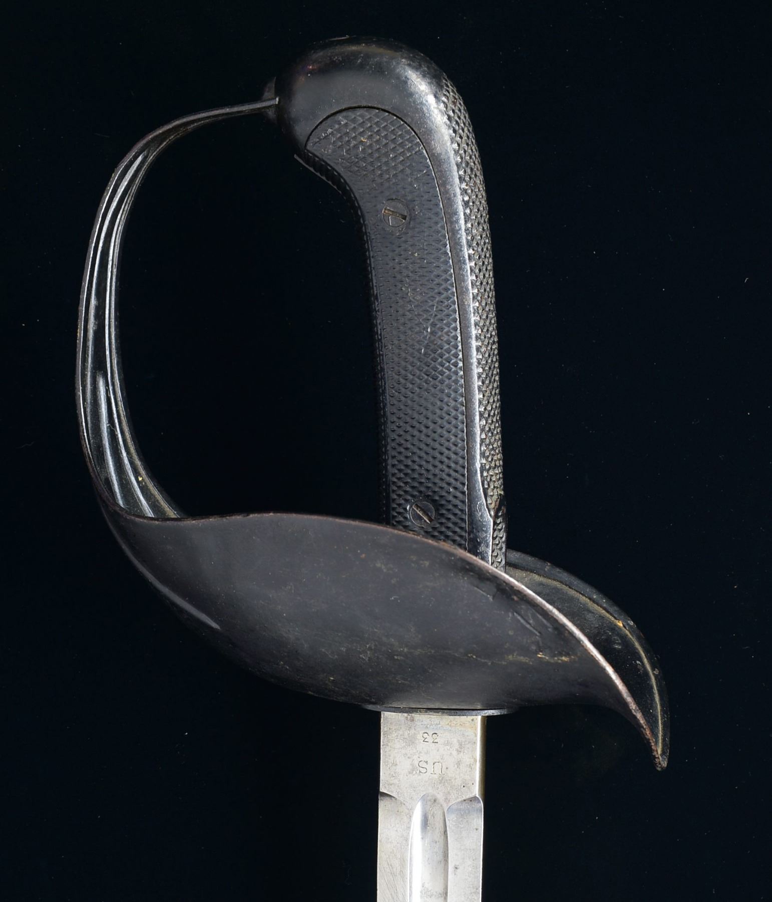 The model 1913 cavalry sword was designed by General George S. Patton & is commonly referred to as the “Patton sword”. It represents a technological leap forward concentrating on the thrusting power of cavalry rather than the hacking power. Overall length: 43”. Blade length: 35 1/4”. Central fullered blade marked at the ricasso, “S(flaming bomb)A1913” & “US33” on the other. Sheet steel guard. 2 Piece composite grip. Crosshatched palm rest w/ thumbprint. Iron mounted canvas covered scabbard w/ no peg. Scabbard mounts are painted gold. Scabbard body is painted black. Scabbard has an old tag attached that reads, “Horse Marines Mounted Detachment American Legation Guard at PeiPing China”. CONDITION: blade has a light gray patina w/ some scattered evidence of sharpening. Hilt generally shows light wear. Scabbard shows light wear. (02-13640/BF). $1,000-1,600.