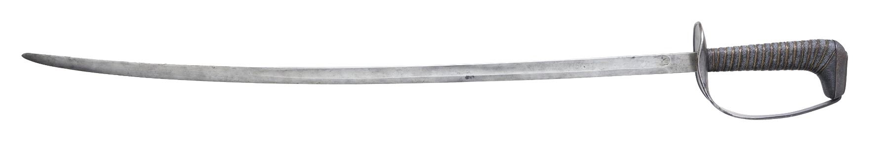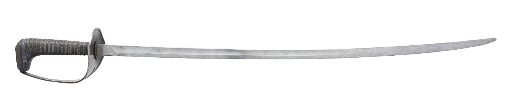 Overall length: 38". Blade length: 31 3/4". Single fuller blade marked at the ricasso, “S A(flaming bomb)1906” on 1 side & “85” on the other. Iron guard. Brass wire wrapped fish skin grip. No scabbard. CONDITION: blade has a light gray patina. Hilt is a slightly oxidized. Grip shows light wear w/ complete wire. (02-13663/BF). $800-1,200.