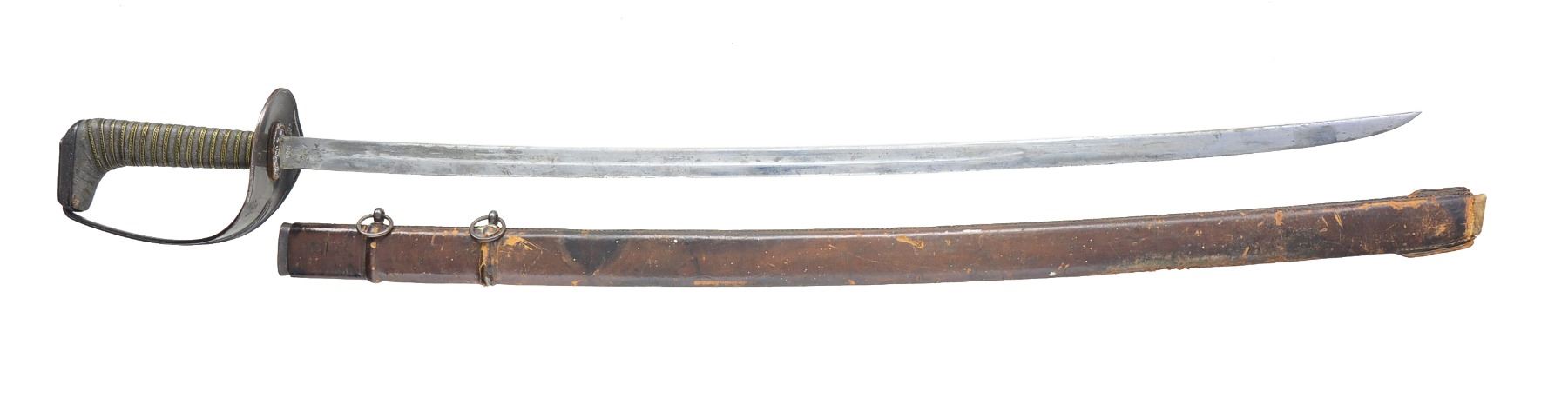 Overall length: 39 1/4". Blade length: 31 3/4". Single fuller blade marked at the ricasso, “A.S. Co(flaming bomb)1906” on 1 side & “U.S.” on the other. Iron guard. Brass wire wrapped fish skin grip. Leather covered iron scabbard. CONDITION: blade is a bit discolored & has a few nicks to the edge. Hilt generally shows light wear. Scabbard has scuffs & scrapes to the leather. There are some seams openings & the tip is badly worn. (02-13665/BF). $600-900.