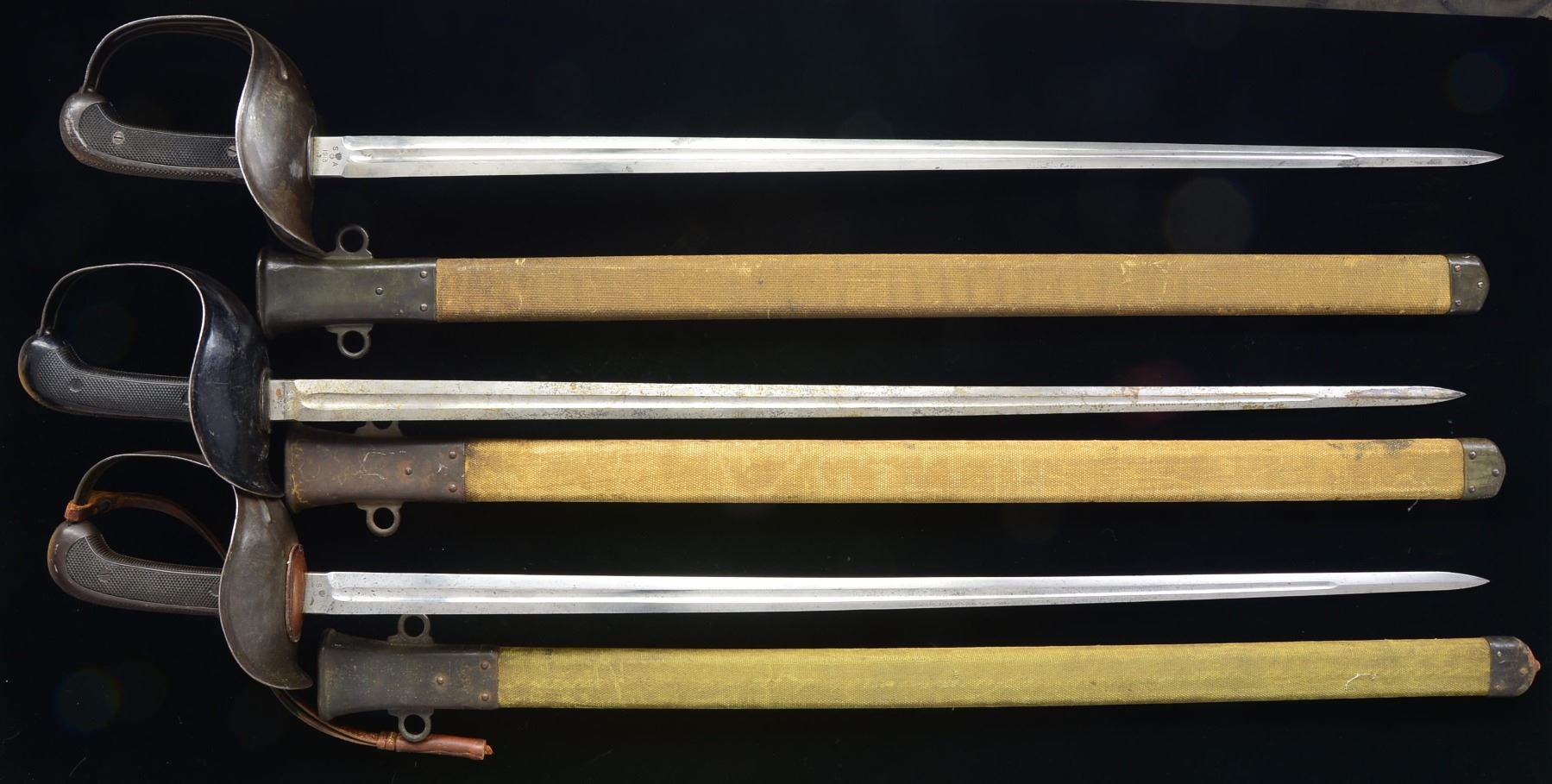 The model 1913 cavalry sword was designed by General George S. Patton & is commonly referred to as the “Patton sword”. It represents a technological leap forward concentrating on the thrusting power of cavalry rather than the hacking power. 1) Overall length: 43”. Blade length: 35 1/4”. Central fullered blade marked at the ricasso, “S(flaming bomb)A1913” & “US6722” on the other. Sheet steel guard. 2 Piece composite grip. Crosshatched palm rest w/ thumbprint. Iron mounted canvas covered scabbard w/ no peg. CONDITION: blade shows minor discoloration. Hilt shows light wear but no damage. Scabbard shows average wear. 2) Overall length: 43”. Blade length: 35 1/4”. Central fullered blade marked at the ricasso, “S(flaming bomb)A1918” & “US37303” on the other. Sheet steel guard. 2 Piece composite grip. Crosshatched palm rest w/ thumbprint. Iron mounted canvas covered scabbard w/ no peg. CONDITION: blade has a mottled appearance w/ some active rust. Hilt shows light wear but no damage. Scabbard shows average wear. 3) Overall length: 43”. Blade length: 35 1/4”. Central fullered blade marked at the ricasso, “S(flaming bomb)A1914” & “US25347” on the other. Sheet steel guard w/ leather knot attached. 2 Piece composite grip. Crosshatched palm rest w/ thumbprint. Iron mounted canvas covered scabbard w/ removed peg. CONDITION: blade shows light wear w/ minor discoloration. Hilt shows light wear but no damage. Scabbard shows average wear. (02-13659(3)/BF). $1,300-1,800.