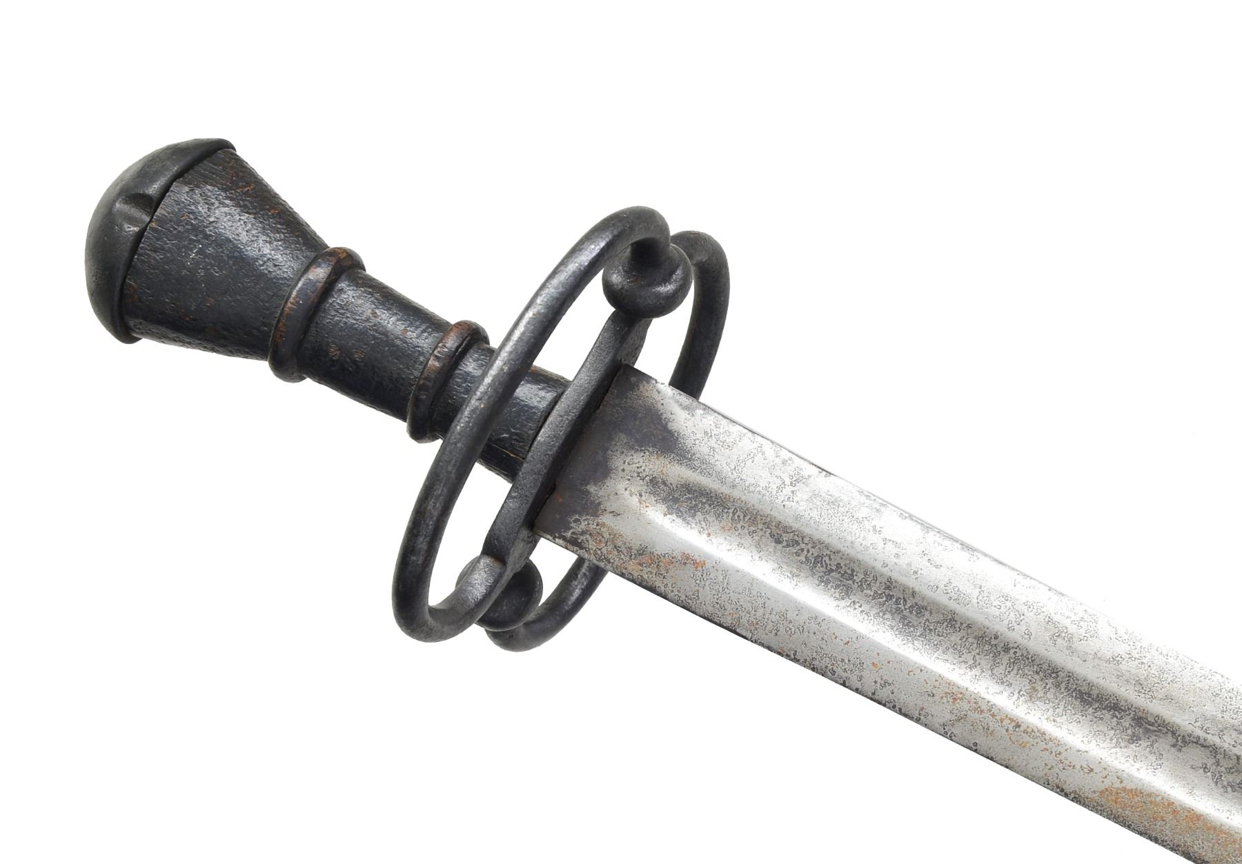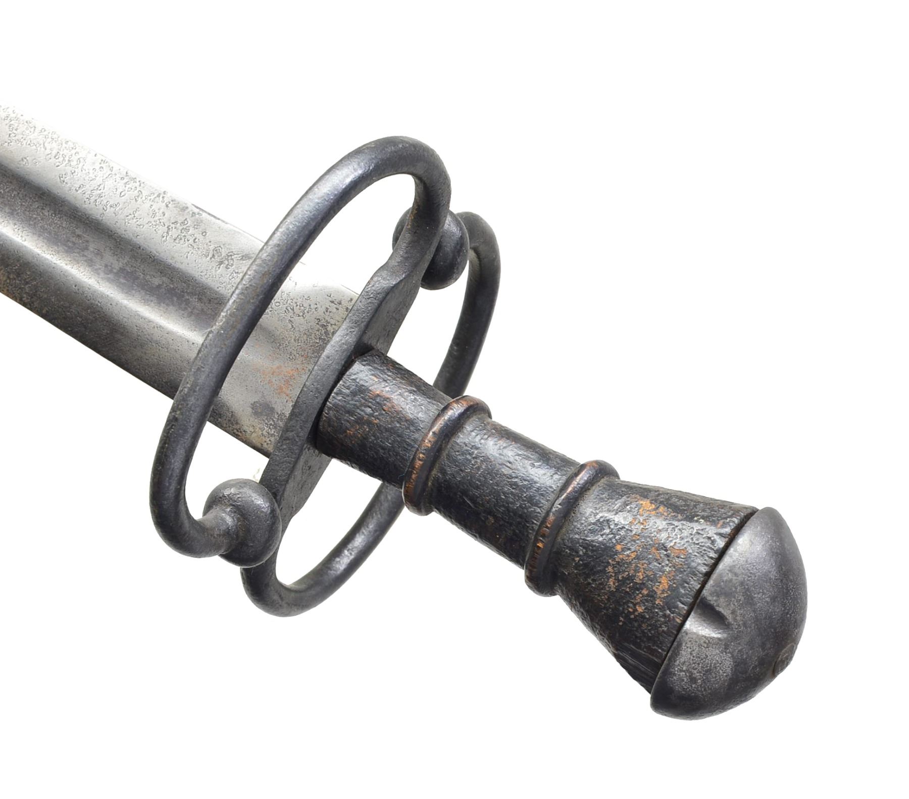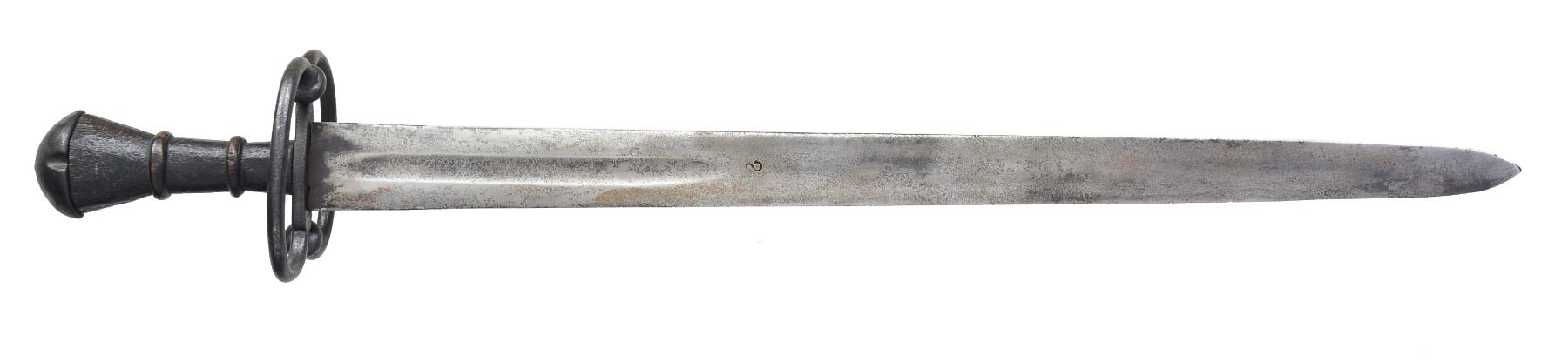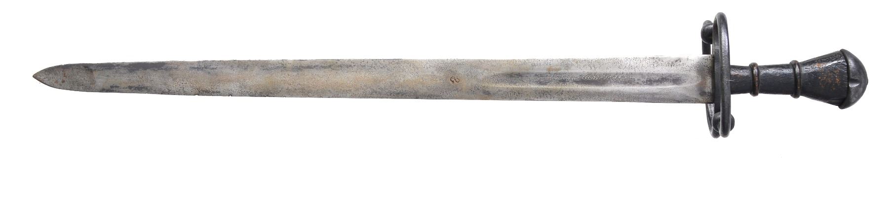 Overall length: 30". Blade length: 24 3/4". Plain blade w/ single central fuller extending 7 1/2" up from the hilt. There is a stylized "S" stamped centrally on both sides of the blade. Typical iron katzbalger S shaped iron guard w/ lobed terminals on both sides. Iron pommel. Carved wood grip w/ 2 raised rings is likely oak. No scabbard. The katzbalger was worn as a side arm usually by archers, crossbowmen & occasionally pikemen. Designed as a cutting & hacking sword that could also be used for thrusting if necessary. CONDITION: blade has a cleaned gray finish w/ evidence of light pitting. The edge has several sm. nicks. Guard is undamaged. Pommel is solid. Grip has a wonderful ancient patina w/ 2 chips missing just under the pommel. (02-13374 /BF). $1,000-1,500.