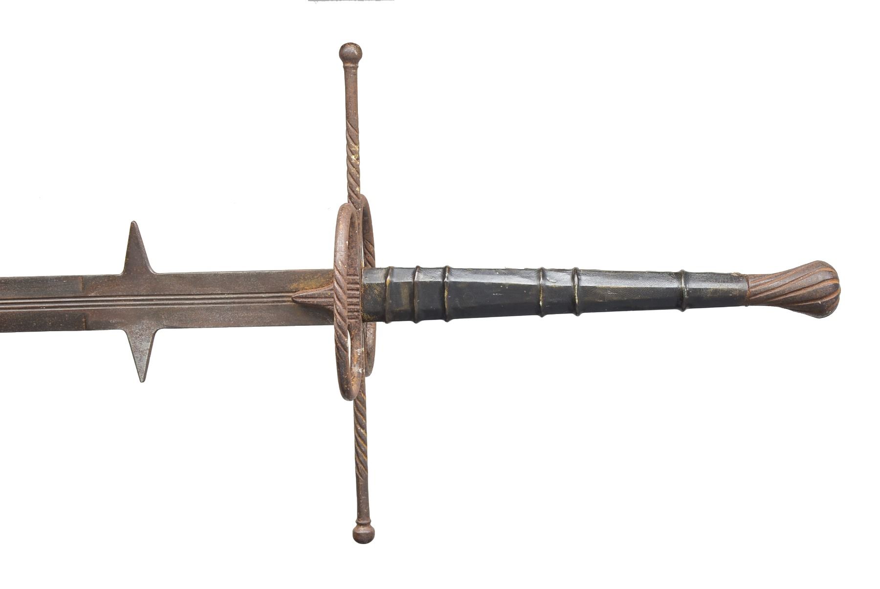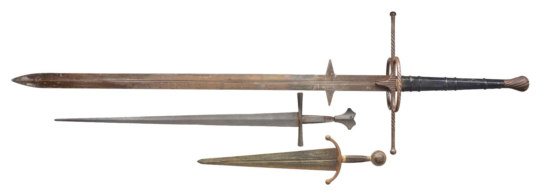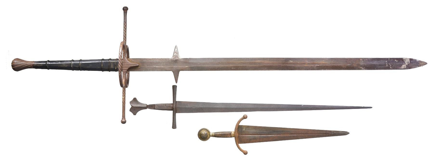1) KNIGHTLY ARMING SWORD. Overall length: 38 5/8". Blade length: 31 1/4". A late medieval arming sword typified by its length & 1 handed grip. Plain tapered blade has a notable medial ridge. Heavy cruciform guard extends 6 3/4". Guard has 2 "ears" extending up the tang which are riveted in 2 places to secure it. Dbl. "dove head" pommel. No scabbard. Given the construction & rich, deep patina we feel this is a period arming sword. CONDITION: entire sword has a dark, moderately pitted patina. No remains of the grip can be seen. (02-13357/BF). 2) TWO-HANDED LANDSKNECHT TYPE SWORD. Overall length: 64 1/2". Blade length: 48". A wonderful, early Victorian copy of a massive 2 handed sword often referred to as Landsknecht type. Plain blade w/ a triple, narrow fuller extending 20 1/2" from the hilt. A single fuller extended to 34 1/4". There are 2 triangular points extending 2" from the blade 7 1/4" up from the hilt. Huge heavy crossguard extending 17 1/2" across w/ oval loops front & back form the guard. Lg. lobed iron pommel. Leather covered grip w/ 5 raised rings. An exceptionally well executed, impressive rendition of a very early 2 handed sword. CONDITION: blade has an overall dark patina as do the iron parts of the hilt. Leather is complete but shows minor scuffs & scrapes. (02-13359/BF). 3) CINQUEDEA TYPE SWORD. Overall length: 24 1/4". Blade length: 17 3/4". The Cinquedea was a civilian long dagger or short sword developed in Italy's northern provinces. It was popular from the 15th to the 16th centuries. Cinquedea literally means "5 fingers" & refers to the width of the blade at the guard. This dagger/sword appears to be a quality Victorian copy from the mid 1800s. Plain blade has a central fuller. Iron guard is down turned. Iron ferrules terminate a wooden grip. Lg. disk pommel w/ a partial gilded finish resembles a shining sun. CONDITION: blade has a dark oxidized patina as does the guard. Pommel & ferrules have a medium gray patina mixed w/ vestiges of gilding. Wood grip is worn w/ numerous dents & dings. (02-13393/BF). $1,200-2,000.