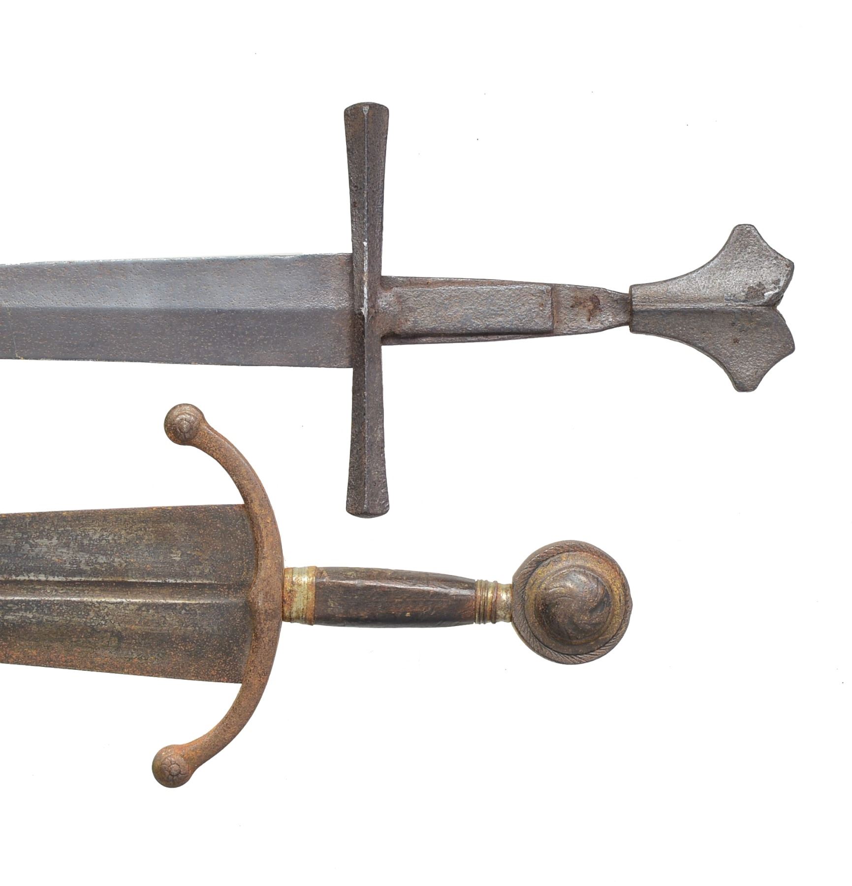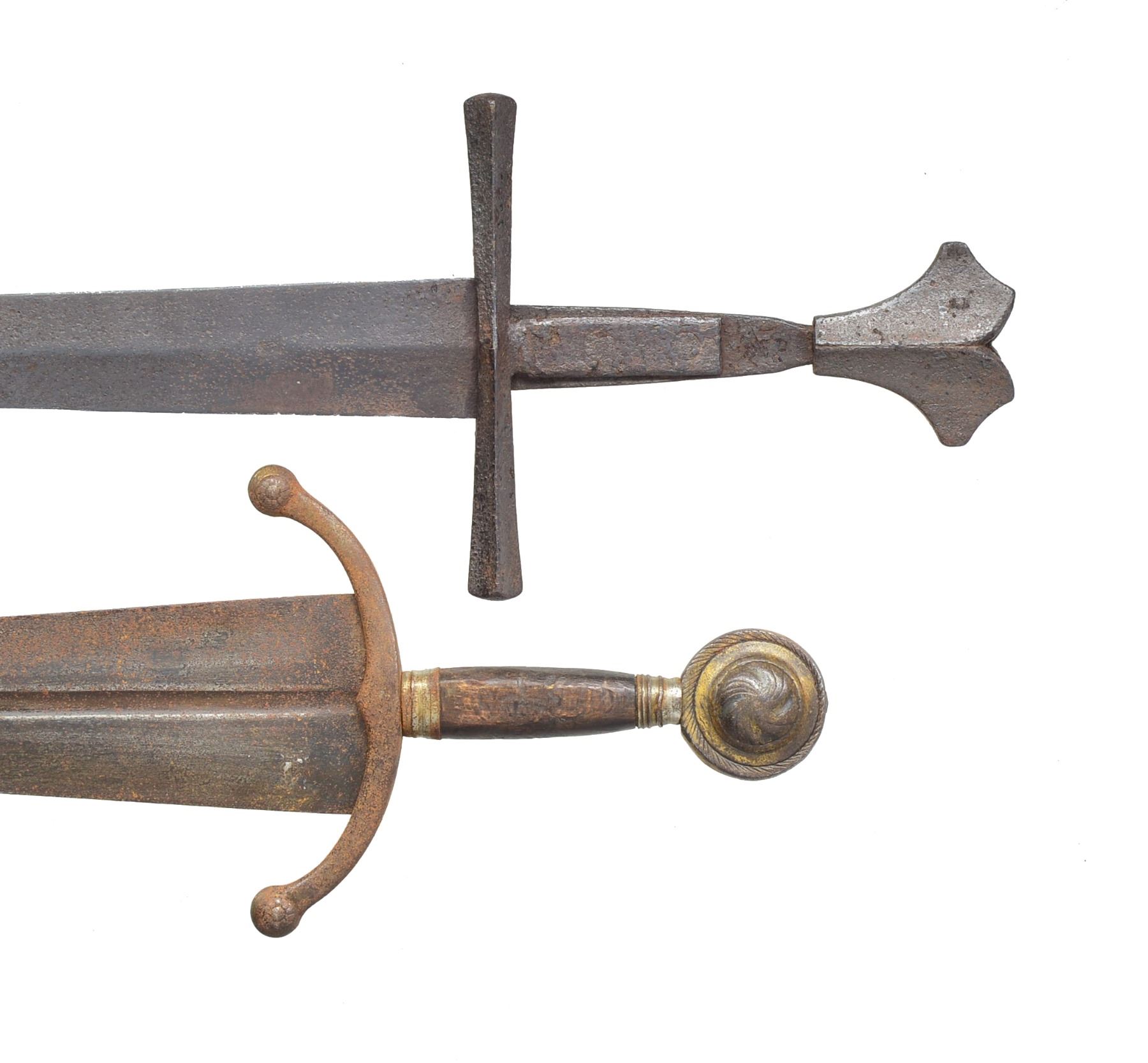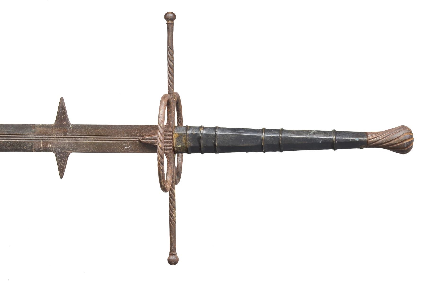 1) KNIGHTLY ARMING SWORD. Overall length: 38 5/8". Blade length: 31 1/4". A late medieval arming sword typified by its length & 1 handed grip. Plain tapered blade has a notable medial ridge. Heavy cruciform guard extends 6 3/4". Guard has 2 "ears" extending up the tang which are riveted in 2 places to secure it. Dbl. "dove head" pommel. No scabbard. Given the construction & rich, deep patina we feel this is a period arming sword. CONDITION: entire sword has a dark, moderately pitted patina. No remains of the grip can be seen. (02-13357/BF). 2) TWO-HANDED LANDSKNECHT TYPE SWORD. Overall length: 64 1/2". Blade length: 48". A wonderful, early Victorian copy of a massive 2 handed sword often referred to as Landsknecht type. Plain blade w/ a triple, narrow fuller extending 20 1/2" from the hilt. A single fuller extended to 34 1/4". There are 2 triangular points extending 2" from the blade 7 1/4" up from the hilt. Huge heavy crossguard extending 17 1/2" across w/ oval loops front & back form the guard. Lg. lobed iron pommel. Leather covered grip w/ 5 raised rings. An exceptionally well executed, impressive rendition of a very early 2 handed sword. CONDITION: blade has an overall dark patina as do the iron parts of the hilt. Leather is complete but shows minor scuffs & scrapes. (02-13359/BF). 3) CINQUEDEA TYPE SWORD. Overall length: 24 1/4". Blade length: 17 3/4". The Cinquedea was a civilian long dagger or short sword developed in Italy's northern provinces. It was popular from the 15th to the 16th centuries. Cinquedea literally means "5 fingers" & refers to the width of the blade at the guard. This dagger/sword appears to be a quality Victorian copy from the mid 1800s. Plain blade has a central fuller. Iron guard is down turned. Iron ferrules terminate a wooden grip. Lg. disk pommel w/ a partial gilded finish resembles a shining sun. CONDITION: blade has a dark oxidized patina as does the guard. Pommel & ferrules have a medium gray patina mixed w/ vestiges of gilding. Wood grip is worn w/ numerous dents & dings. (02-13393/BF). $1,200-2,000.