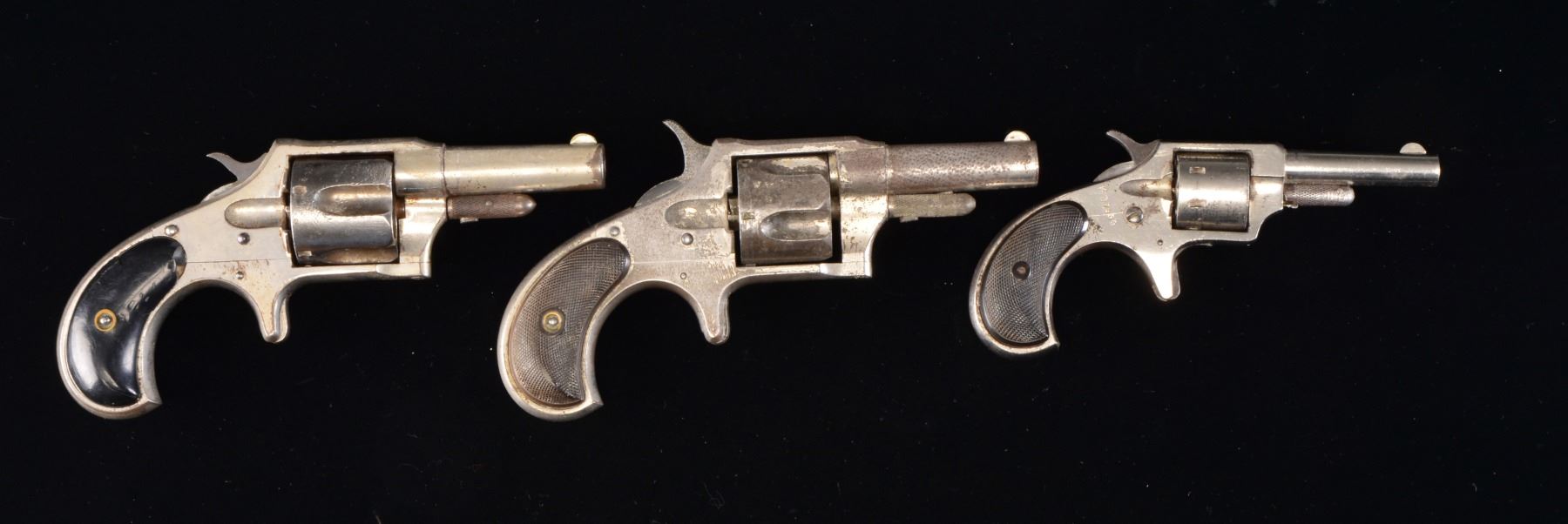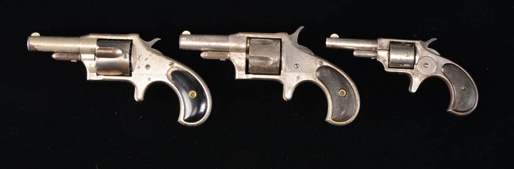 ALL: NSN. 1) IROQUOIS POCKET. Cal. 22 RF. Bbl. 2 1/4" w/ a semi circular blade front sight. 7 Shot rnd. cyl. Nickel finished action w/ spur trigger & 2 piece checkered hard rubber bird's head grips. Right side of frame has stamped ID number "KD7955". Approx. 10,000 mfg. 1878-1888. CONDITION: 50% nickel showing spots of light pitting & scattered sm. dents. Grips show light wear. Action rotates properly. dark pitted bore. (01-17525/DS). 2) NEW MODEL NO. 4. Cal. 41 RF. Bbl. 2 1/2" w/ semi circular front sight. 5 Shot fluted cyl. Nickel finished spur trigger action. 2 Piece checkered hard rubber bird's head grips. CONDITION: 30% nickel flaking to gray & showing light corrosion. Grips show moderate wear. Bore is dark w/ spots of pitting & lightly worn rifling. Action rotates properly. (01-17538/DS) 3) NEW MODEL NO. 4. Cal. 38 RF. Bbl. 2 1/2" w/ semi circular sight. 5 Shot fluted cyl. Nickel finished spur trigger action. Smooth 2 piece hard rubber bird's head grips. Approx. 23,000 mfg. 1878-1888. CONDITION: 60% nickel showing spots of corrosion & sm. dents. Grips show heavy wear w/ chips & cracks. Dark pitted bore. Action is bound up & cyl. rotates freely. (01-17541/DS). ALL ANTIQUE. $400-600.