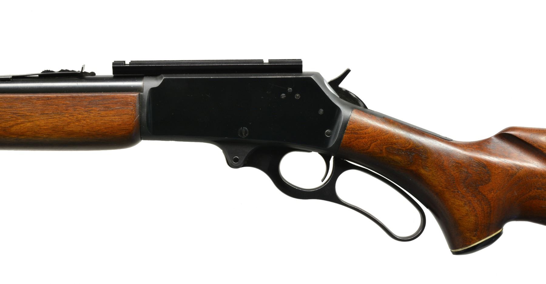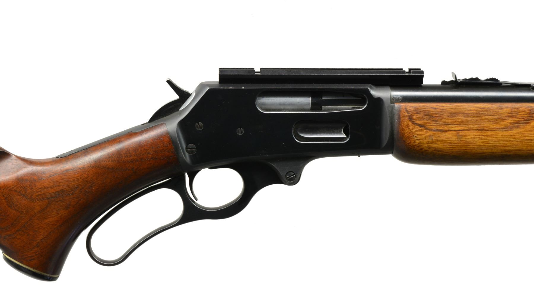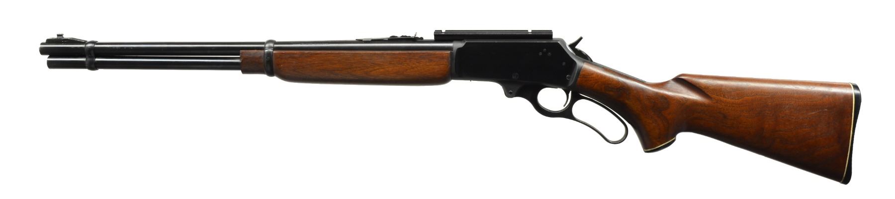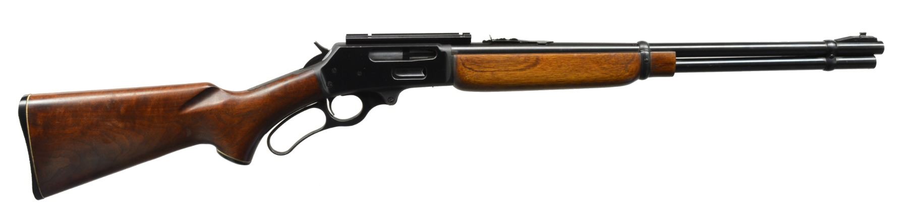 Cal. 35 Rem. S# R21918. Bbl. 20”. Open sporting rear sight. Gold bead front sight w/ ramp. Bbl. markings include “The Marlin Firearms Company MODEL 336 RC CAL. 35 REM. MICRO-GROOVE”. Drilled for receiver sight. Weaver 1 piece scope base mounted on top. Blued trigger. Pistol grip walnut stock w/ semi beavertail banded forearm. Buttstock has fluted nose, black plastic grip cap & buttplate w/ white line spacers. Marlin bullseye on belly of stock. CONDITION: original finish stock set has very light wear & scattered handling marks. Has 85% original blue w/scattered sm. scratches & handling marks. Notable sm. abrasion in area of bbl. markings. Near excellent shiny bore. (20-736/RW). CURIO. $350-500.