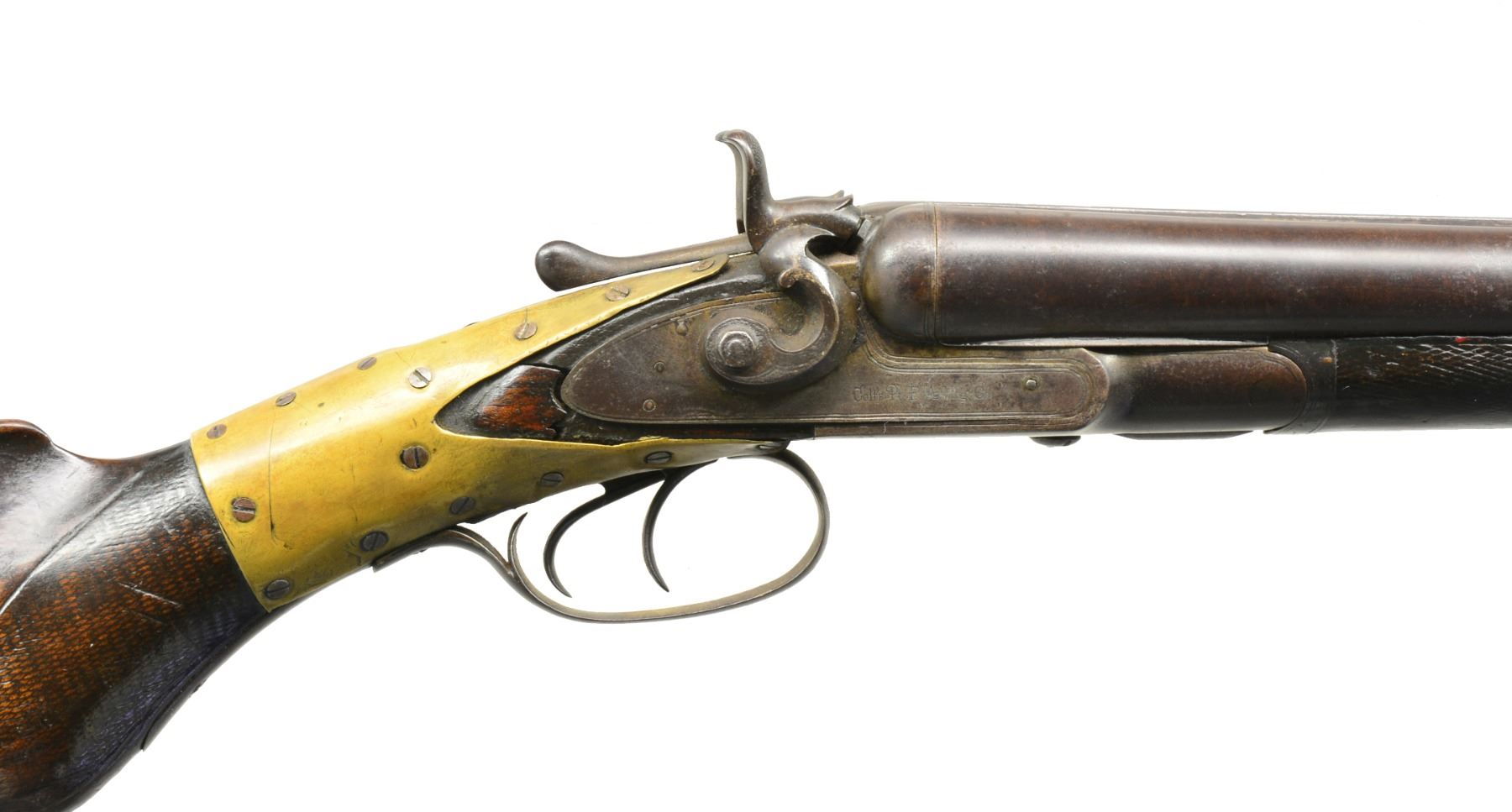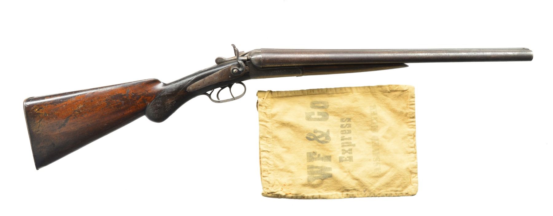 WELLS FARGO MARKINGS. Cal. 12 Ga. S# 21296. Bbls. 30”. Usual configuration w/ makers name & address on ribs & locks. Pistol grip stock w/ Colt buttplate stamped “W. F. & Co. xx.(?)” “SF. CAL.” on both sides. Wells Fargo markings likely added by another party. CONDITION: poor. Metal mostly brown to gray patina w/ some areas of cleaning. Welded repair through left hammer. Buttstock has screwed on brass plates to reinforce a break. Stamping on stock over old scratches, etc. Bores fair, rusted. Action loose. An interesting wall hanger. (01-17486/MGM105). ANTIQUE. $300-500.