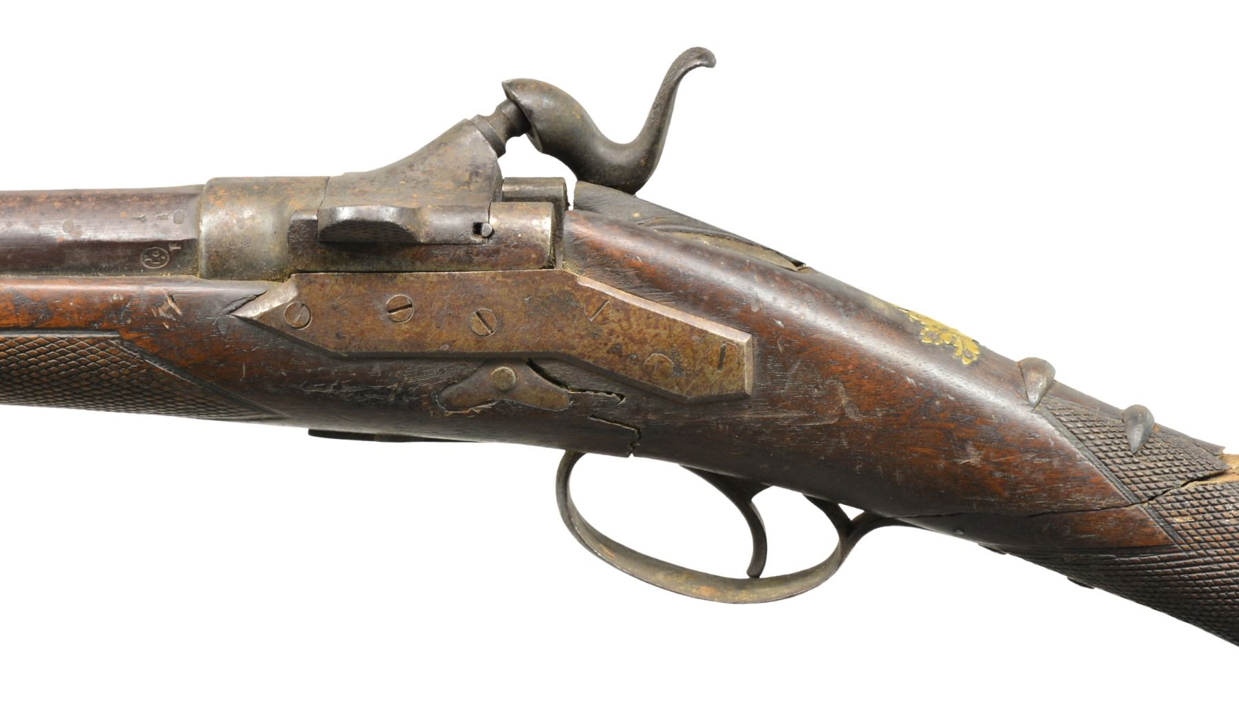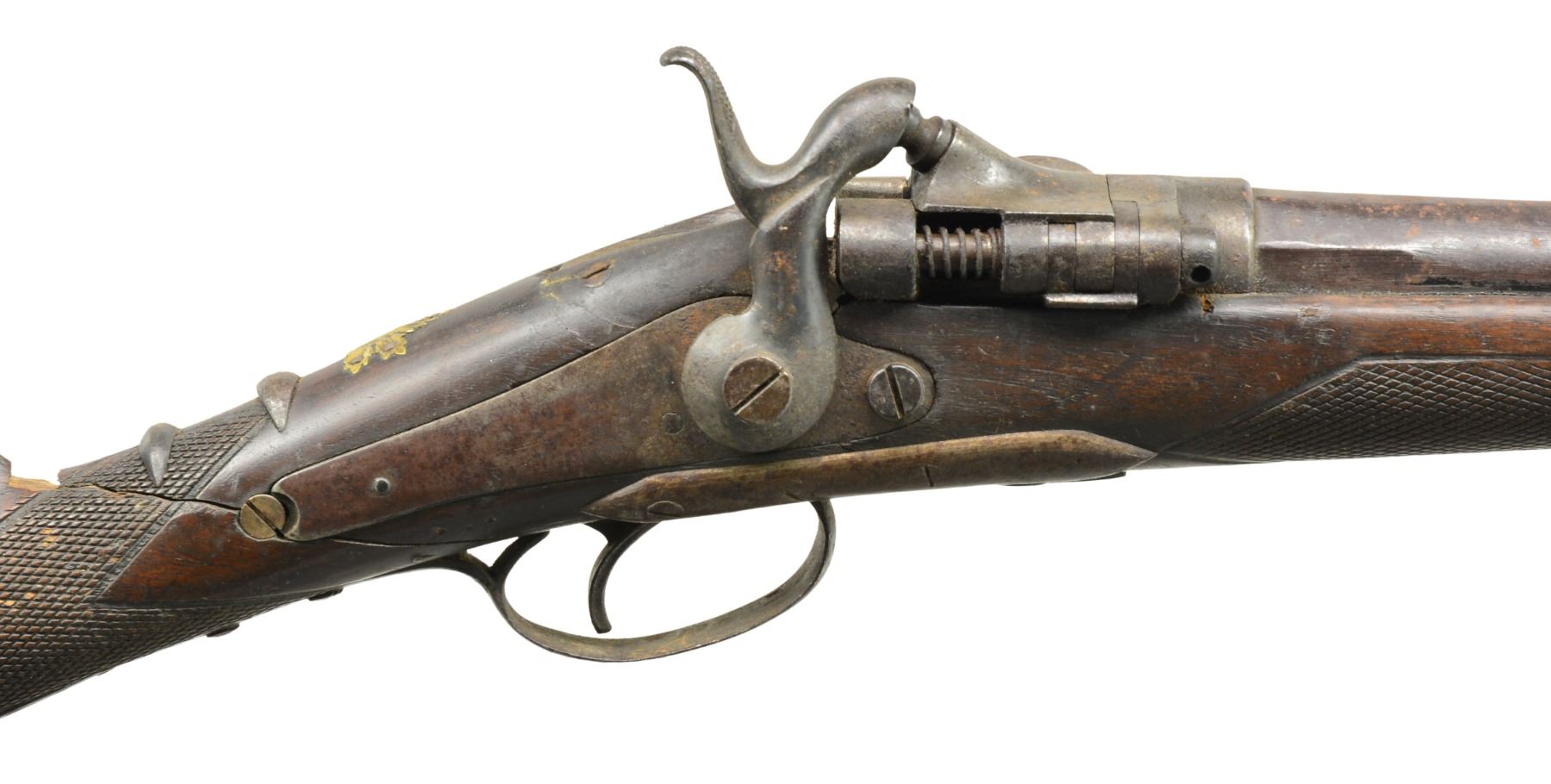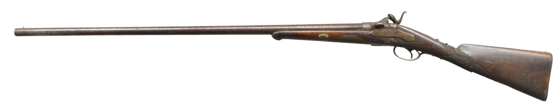 AND SPEAR. Cal. 12 Ga. NSN. Bbl. 36” rnd. w/ Werndl type pivoting block action stamped w/ Belgian black powder proofs. Back spring lock has high attenuated hammer. Walnut stock has iron buttplate, checkered at wrist & forend. A gold maple leaf tacked on at top of grip. UNATTACHED ACCESSORIES: Spear (60”) & 33” battle ax w/ hook, appear to be made for tourist trade. Metal parts arc welded. Handles relief & incised carved w/ dots, snake, & figure of a “king” on spear. CONDITION: fair to poor. Metal gray brown patina. Shotgun has well done blacksmith repairs to broken buttstock. Spear has tape covered break. Great wall hangers. (01-17505/MGM119). ANTIQUE. $200-400.
