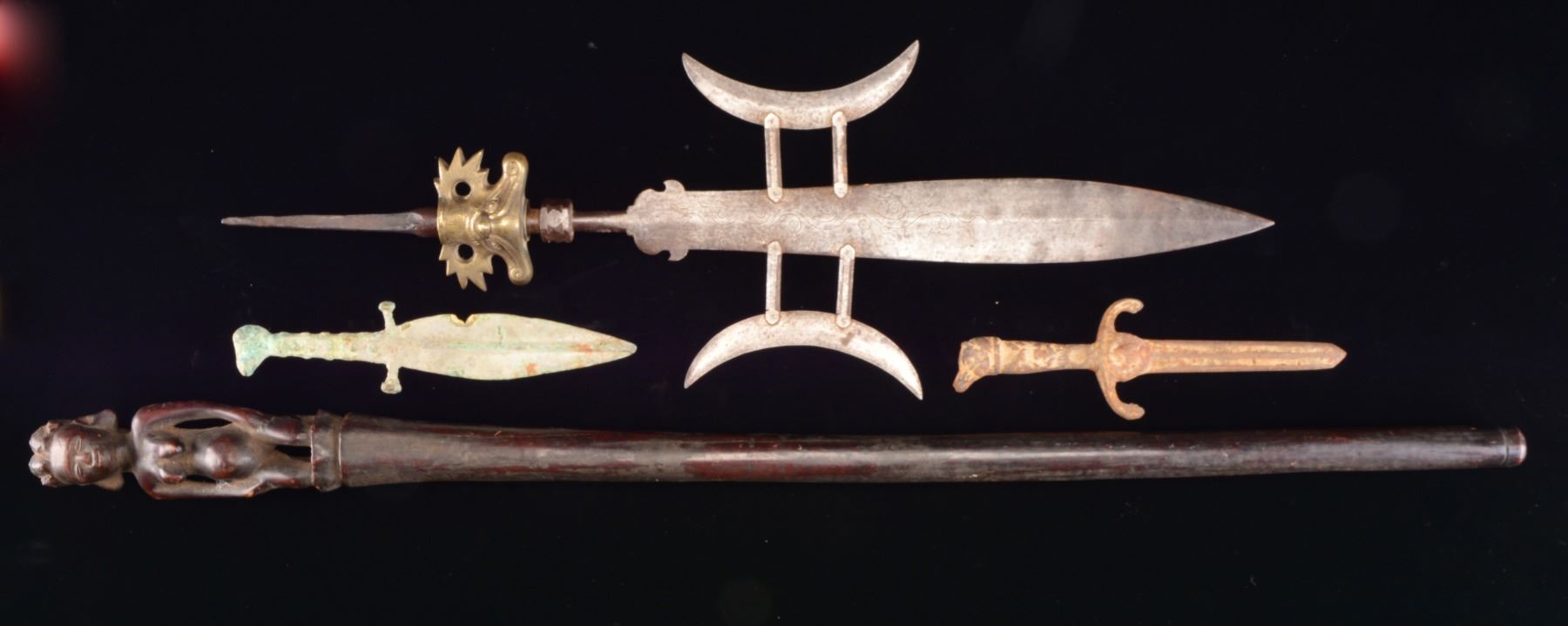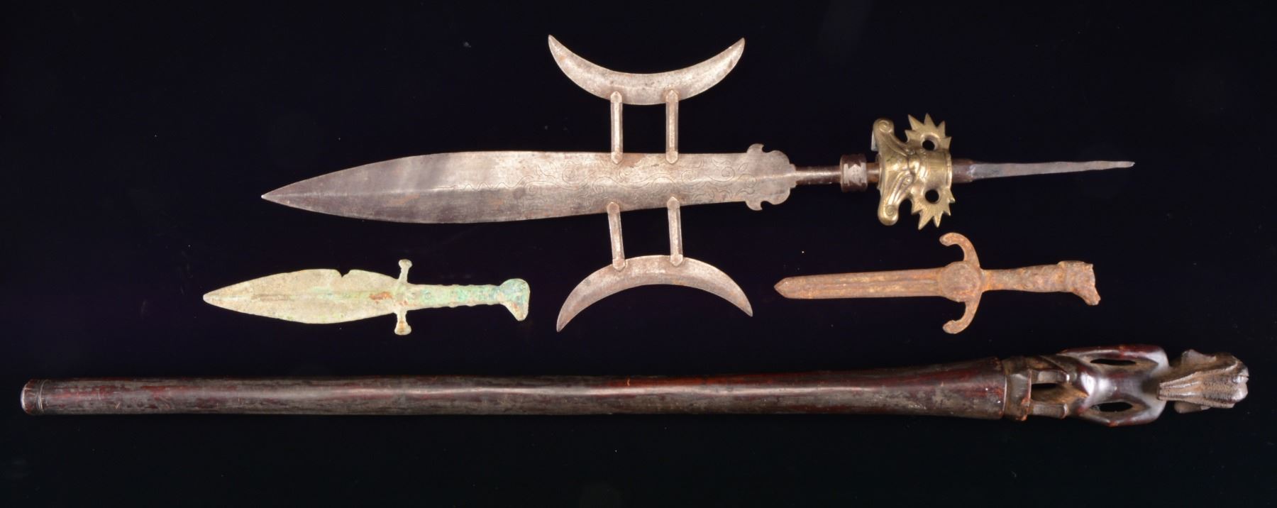 1) CHINESE CEREMONIAL POLEARM HEAD. Overall length: 27". Blade length: 15 1/4". Width at widest point 9 1/4". Central blade has engraved foliate decoration on both sides. Central blade is flanked by 2 crescent shaped blades, each supported by two 2 1/4" faceted bars. Beneath a lg. iron ferrule is a brass 2 sided ornament depicting a mythical Chinese figure over sunbursts. Tapered, hammered tang. CONDITION: iron generally has a dark somewhat mottled patina. Brass has a deep mellow patina. Polearm head shows wear but no damage. (02-13372/BF). 2) AFRICAN EFFIGY WALKING STICK. Overall length: 37 1/4". Figure length: 7 5/8". A very hard wood that may be ebony. Plain slightly tapered shaft is topped w/ a kneeling, bare breasted, female figure that appears to be pregnant. Hair is textured & appears braided. CONDITION: moderate wear but no damage. (02-13390/BF). 3) IRON DAGGER. Overall length: 10 1/4". Blade length: 5 1/4". An excavated example of a cast iron dagger w/ a down turned guard showing a central medallion. Grip terminates in a wolf's head pommel. CONDITION: dagger shows heavy oxidation throughout w/ some dirt remaining. (02-13399/BF). 4) BRONZE DAGGER. Overall length: 10 1/4". Blade length: 6". An excavated example of a cast bronze dagger w/ a lg. elliptical blade showing a pronounced medial ridge. Simple guard w/ nubbed grip. Animal head pommel. CONDITION: dagger shows heavy oxidation, patina & verdigris. There is a triangular loss at 1 edge of the blade. Area of loss has been cleaned on 1 side, likely to determine metal used in mfg. (02-13400/BF). $500-1,000.