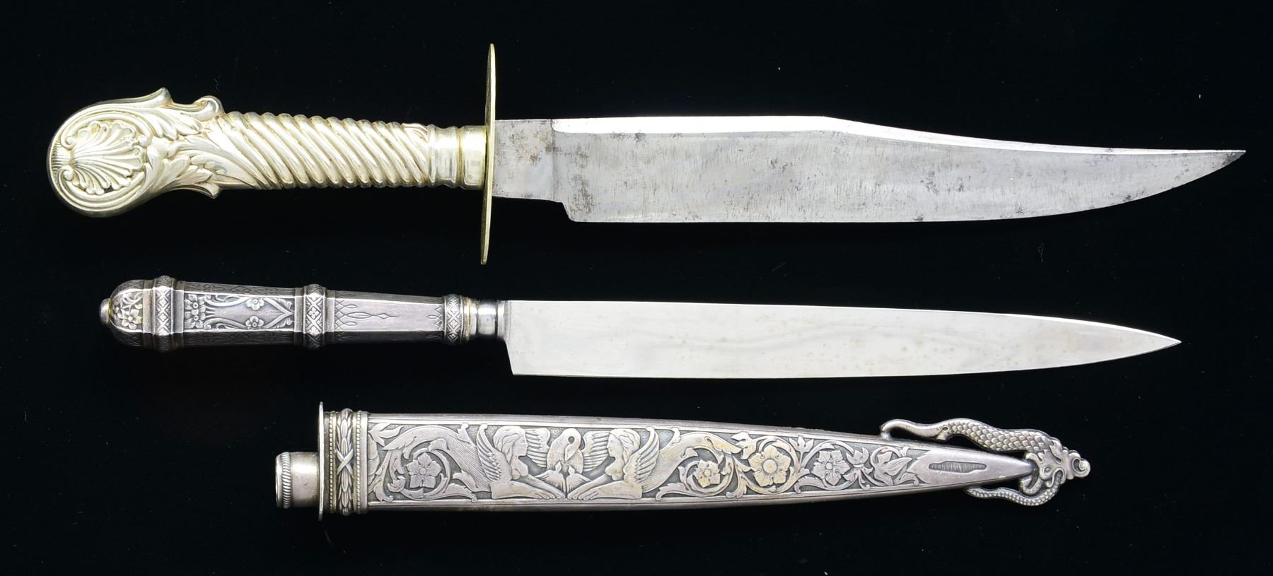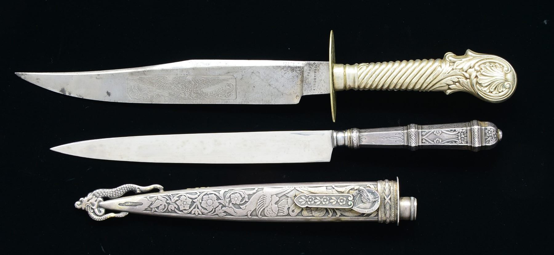 1) CIVIL WAR BOWIE KNIFE. Overall length: 11 1/2”. Blade length: 8”. This very attractive & very patriotic bowie knife was a Civil War period product of the notable British firm of Corsan, Denton, Burdekin & Co. This firm was in business from about 1850-1863. Corson traveled extensively in the South for 2 months assessing blockade running opportunities. The classic clip point bowie blade has a 2 3/4" etched panel featuring a spread winged eagle & the words “AMERICA” & “ LIBERTY” on a ribbon. The ricasso is marked “CORSON DENTON BURDEKIN & CO”. An extremely attractive German silver hilt & guard. No sheath. CONDITION: blade has minor spots of discoloration. Patriotic etching remains quite clear. Guard is a bit loose but grip is quite sturdy. 2) GAUCHO KNIFE. Overall length: 12 1/2”. Blade length: 7”. A modern version of the traditional gaucho knife. Plain flat blade marked near the ricasso “KONI (horn)”. Silver plated grip w/ traditional decoration. Silver plated scabbard w/ floral & fanciful decoration. Frog stud/clip has a horse head in a horseshoe. CONDITION: very light wear overall. (02-13483/BF). $300-500.