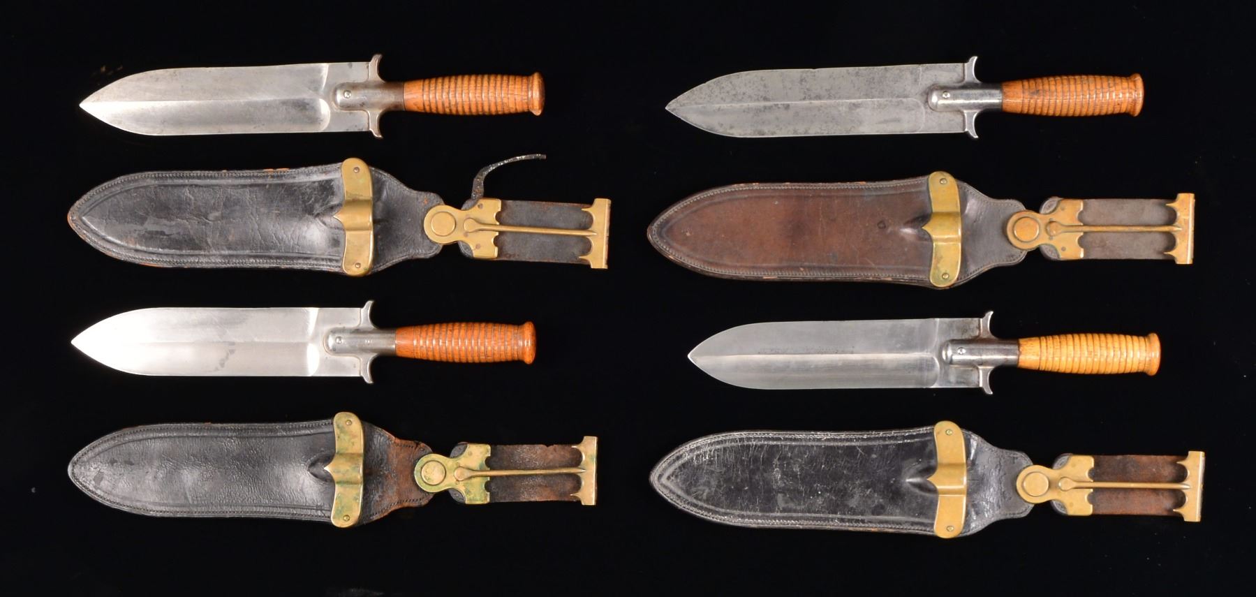 KNIVES W/ SCABBARDS. These “all purpose” knives were made at Springfield Armory, 8 1.2” x 2” blades designed for use in the west by all troops. Each knife is found w/ a Watervliet Arsenal brass & leather mounted scabbard. Serial numbers 338, 441, 709 & 912. CONDITION: very good to fine overall, blades vary from very good to fine w/ sharpening, some luster w/ staining & pitting, markings are all discernable on knives & scabbards. (02-13693/JS). $700-1,200.