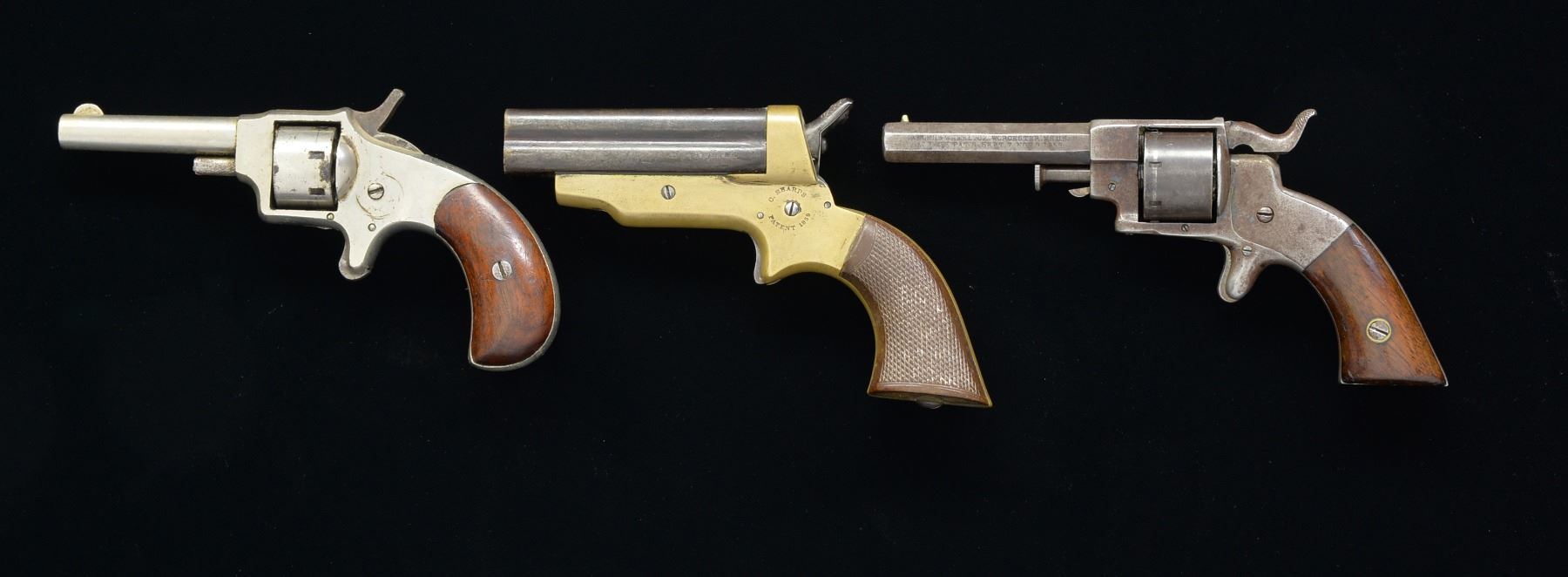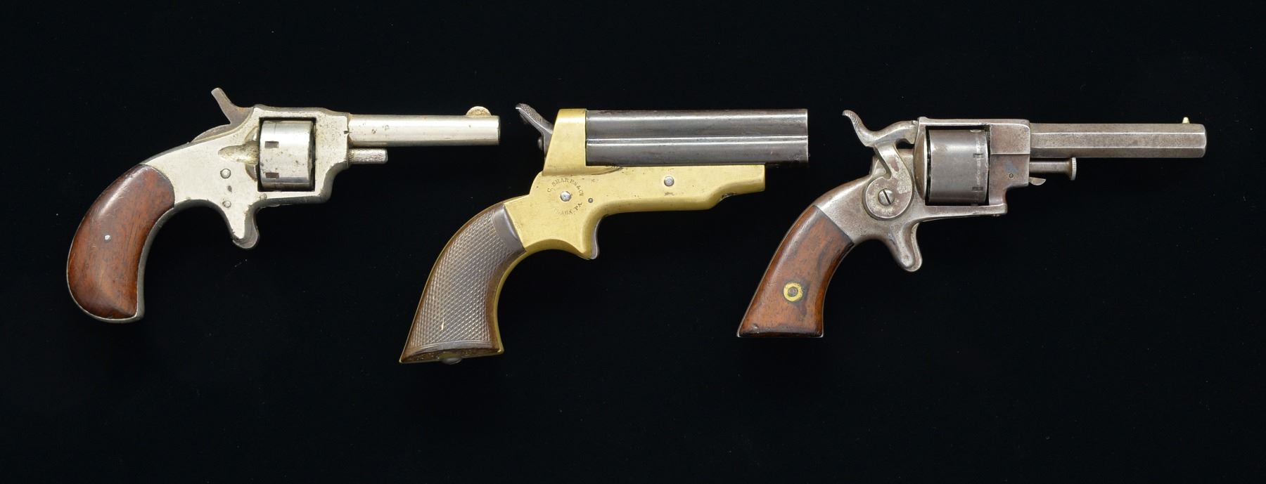 1) SHARPS 4 BBL. DERRINGER. Cal. 32. S# 7385. 5 1/2" Overall w/ 3" cluster of 4 bbls. Brass frame marked in circular stamps "C. SHARPS PATENT 1859" & "C SHARPS & CO PHILADA. PA". CONDITION: very good overall. Bbls. retain strong traces of blue finish. Brass has medium mustard patina. Checkered hard rubber grips are well fit. Mechanically fine w/ discernable rifled bores. (01-17334/JS). 2) SCARCE ALLEN & WHEELOCK POCKET PISTOL. Cal. 22. S# 23. 6 1/4" Overall. 2 7/16" Oct. bbl. w/ 2 line address on left side. 7 Shot smooth cyl. Varnished 2 piece walnut grips. CONDITION: good to very good w/ traces of finish. Good mechanics. Clear rifled bore. Grips retain most of their original varnish. (01-17335/JS). 3) "BLUE JACKET". Cal. 22. S# 1941. Sm. 7 shot 22, patented May 27, 1879. CONDITION: very good overall. Retains 90% original nickel w/ staining. 2 Piece grips are well fit w/ remnants of varnish. Mechanically functional w/ good bore. PROVENANCE: Estate Collection of Dan Poppen. (01-17336/JS). ANTIQUE. $800-1,200.