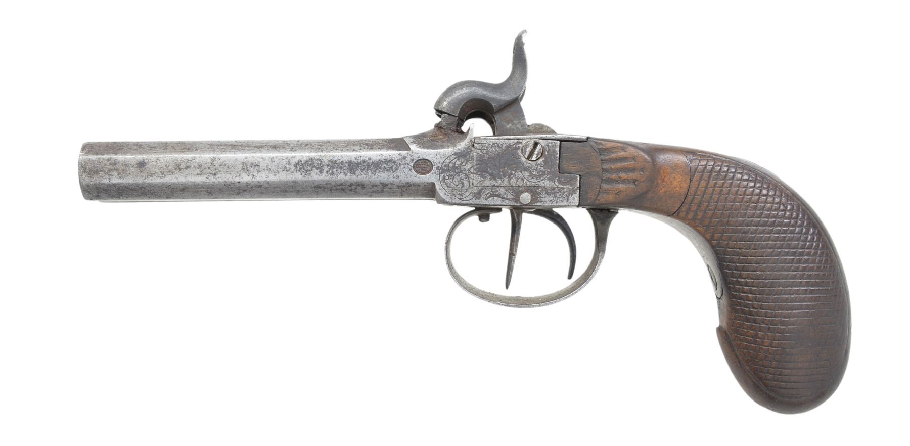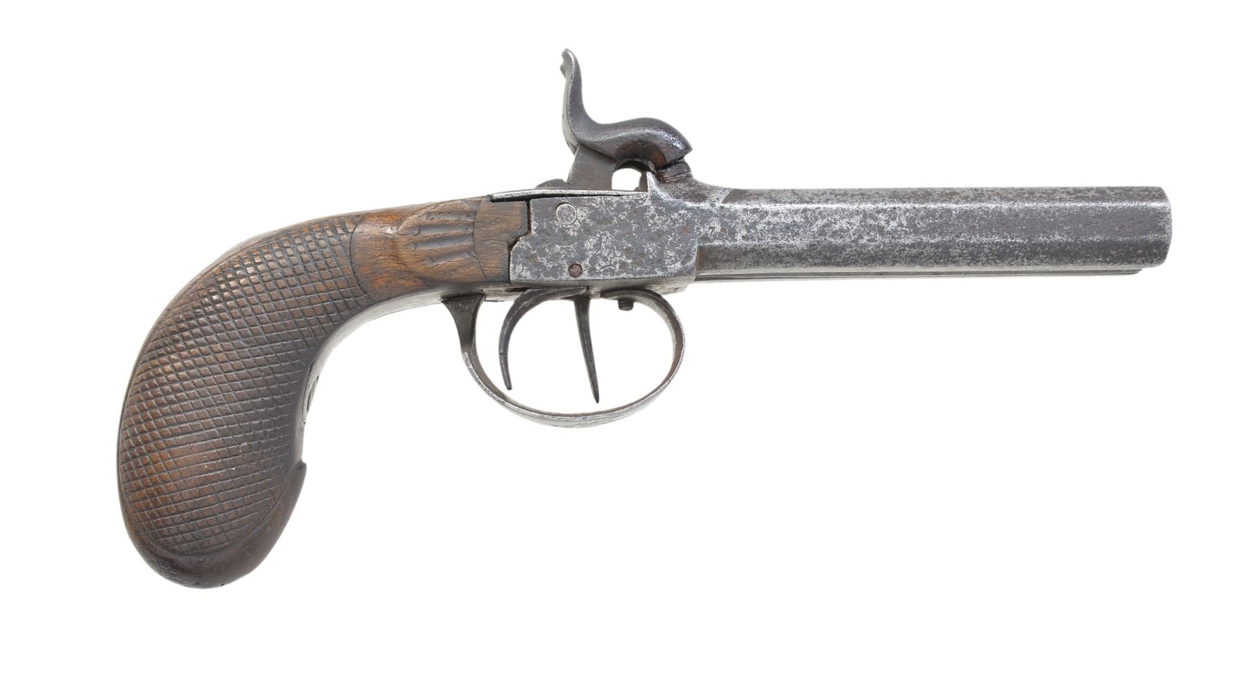 Cal. 40. NSN. Bbl. approx. 3 1/4". A sm. Belgian pistol w/ side by side oct. bbls. terminating in a dual hammer, inline percussion boxlock. Pistol has simple foliate engraving on the sides of the lock, lock tang & base of trigger guard. Dual triggers. 1 Piece wooden checkered grip w/ sm. German silver diamond escutcheon at the wrist. CONDITION: bbl. & lock have a medium gray, cleaned, mottled finish. Both hammers hold full cock. Grip shows moderate wear but no significant damage. Bore is quite dark w/ visible corrosion. (01-17364/BF). ANTIQUE. $200-300.