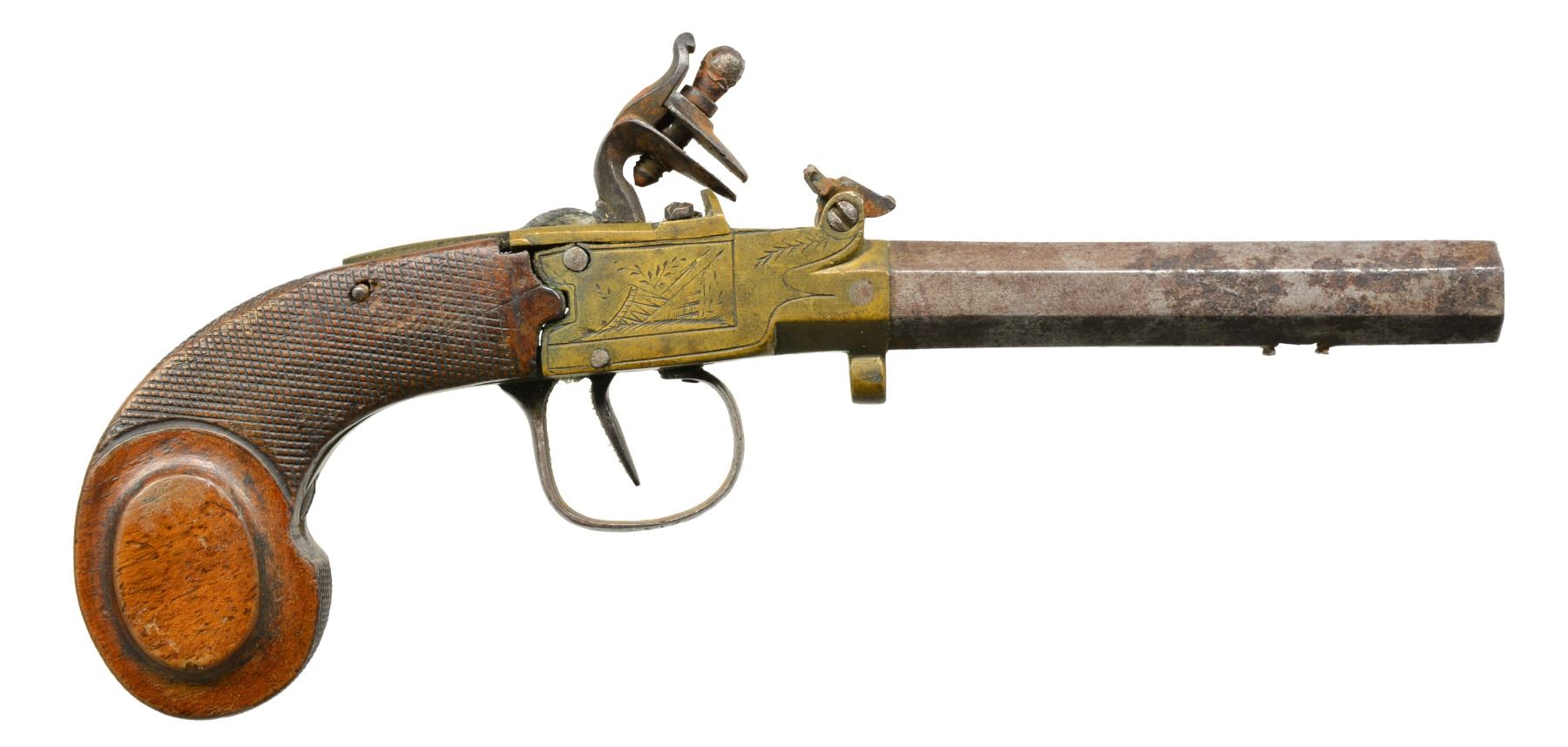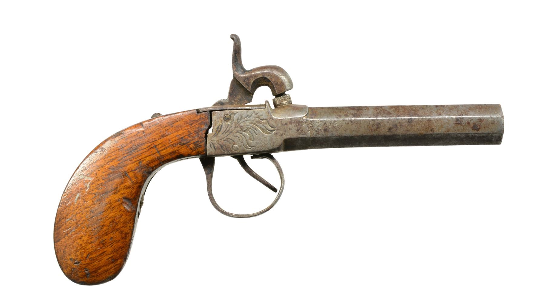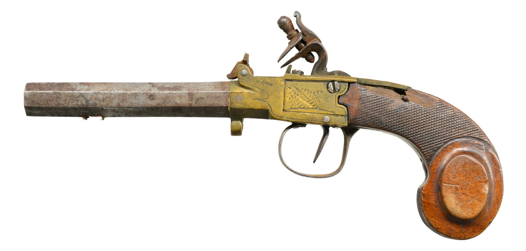 This group consists of 2 mid 19th century percussion boxlocks w/ bag grips. 1 Has Liege proofs, the other unknown black powder proofs. Last gun in this group is brass framed boxlock w/ oct. bbl. Frizzen is broken but accompanies lot. CONDITION: one bag gripped percussion pistol is numbered "23" on bbl. & breech, is heavily pitted but functional & complete. The Liege percussion gun does not hold cock. Flint pistol holds cock well but requires frizzen repair to operate. Stock is chipped & sliding safety is missing. (01-17220(3)/JS). ALL ANTIQUE. $600-900.