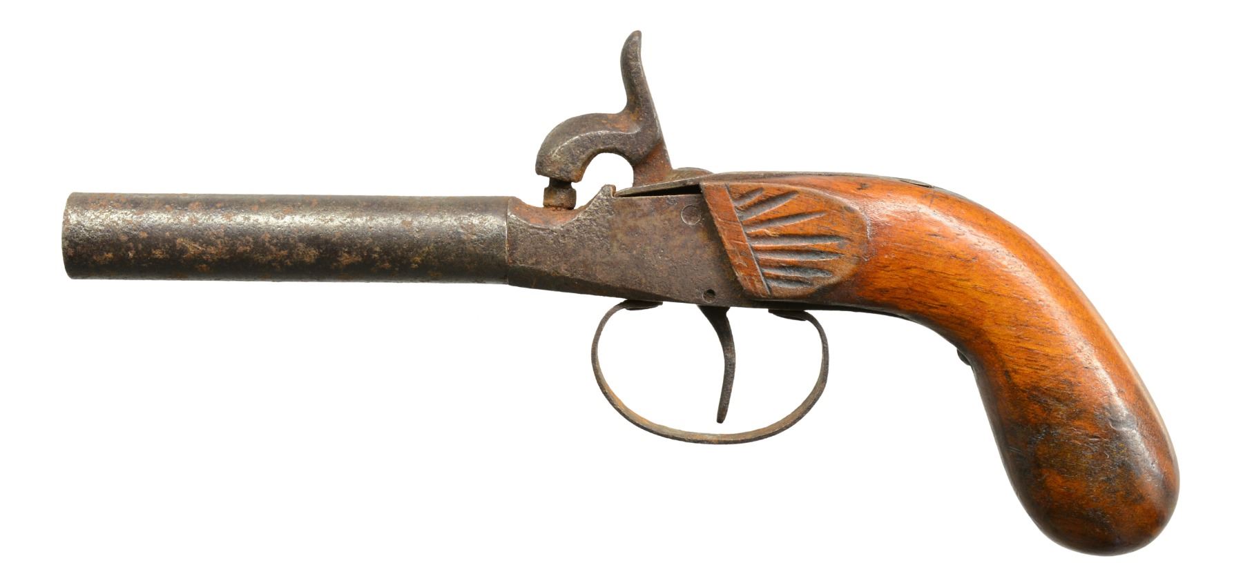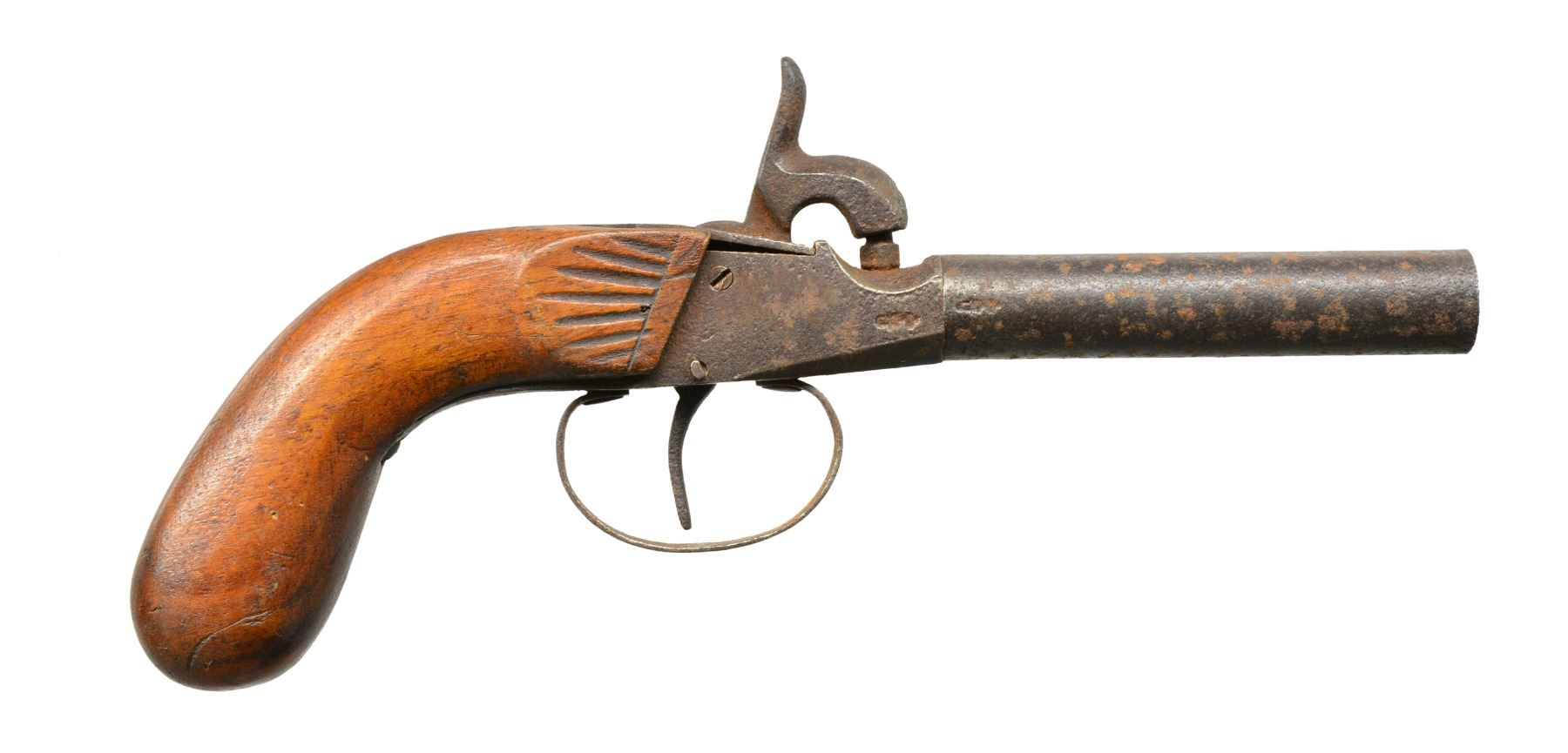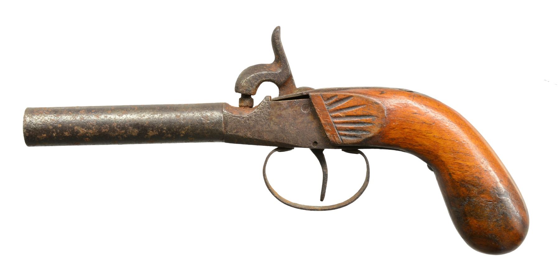 This group consists of 2 mid 19th century percussion boxlocks w/ bag grips. 1 Has Liege proofs, the other unknown black powder proofs. Last gun in this group is brass framed boxlock w/ oct. bbl. Frizzen is broken but accompanies lot. CONDITION: one bag gripped percussion pistol is numbered "23" on bbl. & breech, is heavily pitted but functional & complete. The Liege percussion gun does not hold cock. Flint pistol holds cock well but requires frizzen repair to operate. Stock is chipped & sliding safety is missing. (01-17220(3)/JS). ALL ANTIQUE. $600-900.