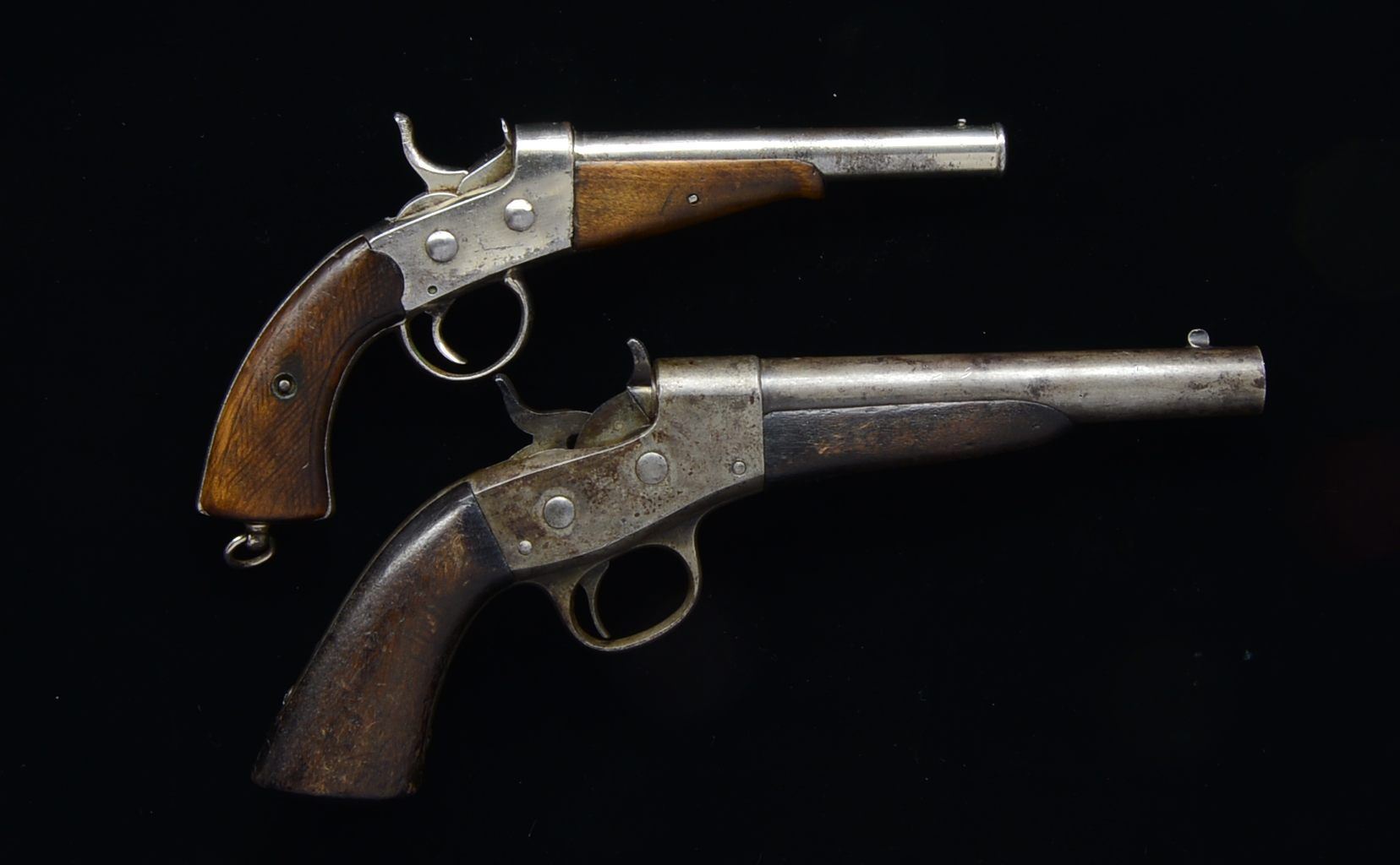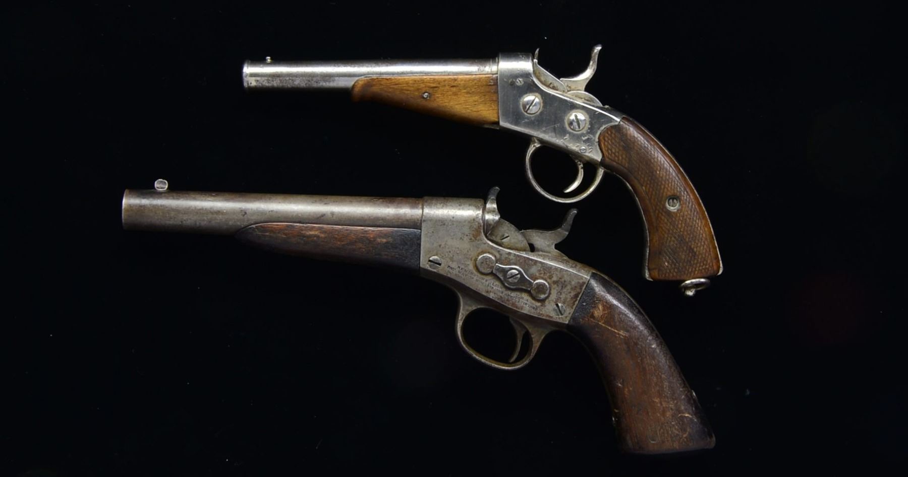 BOTH: NSN. 1) EUROPEAN. Cal. 45 CF (11.35mm). Bbl. 5 5/8" rnd. w/ cannonade muzzle & bead front sight. Unmarked sm. frame pistol action has nickel finish w/ lanyard ring at butt. Schnabel tipped forearm & 2 piece checkered walnut grips. CONDITION: over 50% nickel showing areas of finish loss & pitting. Forearm shows wear w/ chips at action. Grips show heavy checkering wear w/ chips at toe. Dark pitted bore. (01-17554/DS). 2) REMINGTON 1867 US NAVY. CAL. 50 CF. Bbl. 7" rnd. w/ semi circular front sight. Top of bbl. has inspectors marking "I / H.E" over a Navy anchor. Case colored action has standard 2 line markings on right side, last patent date April 17th, 1866. Right side of frame has inspectors marking "P / F.C.W". Walnut forearm & 1 piece walnut grip. Left side of grip has lightly visible cartouche. CONDITION: bbl. retains a sm. amount of blue fading to gray showing spots of corrosion & handling marks. Action finish has faded to mottled gray showing scattered corrosion. Stock & forearm show heavy wear w/ dents & chips at butt. Bore is generally bright w/ sound rifling showing sm. spots of scattered pitting. (01-17569/DS). BOTH ANTIQUE. $750-1,250.