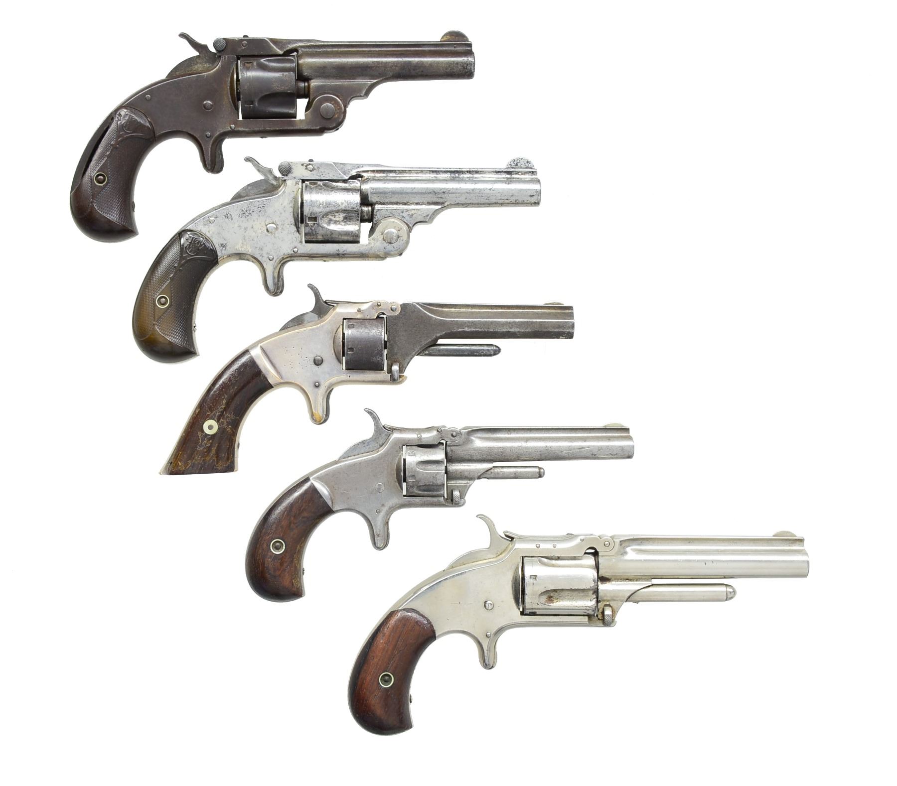 1) NO. 1-1/2 SA. Cal. 32 S&W. S# 56325. Bbl. 3" w/ rib & semi circular front sight. 5 Shot fluted cyl. Spur trigger top break action. 2 Piece checkered hard rubber bird's head grips. CONDITION: metal finish has faded to dark brown patina. Dark pitted bore. Grips show checkering wear, right panel missing lg. chip along backstrap. (01-17551/DS). 2) NO. 1-1/2 SA. Cal. 32 S&W. S# 47938. Bbl. 3" w/ rib & semi circular front sight. Top break spur trigger action. Nickel finish. 2 Piece checkered hard rubber grips. CONDITION: 30% remaining nickel blending w/ areas of pitting. Grips show moderate wear. Dark pitted bore. (01-17587/DS). 3) NO. 1 SECOND ISSUE. Cal. 22 Short. S# 67598. Bbl. 3 3/16" oct. w/ rib & semi circular sight. 7 Shot rnd. cyl. Silver finished brass tip up action. 2 Piece rosewood grips. CONDITION: bbl. & cyl. have faded to dark patina showing spots of pitting. Action retains 60% silver finish showing scratches & sm. dents. Dark pitted bore. (01-17597/DS). 4) NO. 1 THIRD ISSUE. Cal. 22 Short. S# 20130. Bbl. 3 3/16" rnd. w/ rib & semi circular sight. 7 Shot fluted cyl. tip up action w/ spur trigger. 2 Piece rosewood bird's head grips. CONDITION: cleaned gray metal w/ light pitting. Grips show wear & handling marks. Lightly pitted bore w/ darkened appearance & intact rifling. (01-17598/DS). 5) NO. 1-1/2 SECOND ISSUE. Cal. 32 RF. S# 52633. Bbl. 3 1/2" rnd. w/ rib & semi circular front sight. 5 Shot fluted cyl. Nickel finished tip up action w/ spur trigger. 2 Piece rosewood grips. CONDITION: 90% nickel showing spots of corrosion, scratches & sm. dents. Wood shows moderate wear. Dark pitted bore. (01-17599/DS). ALL ANTIQUE. $800-1,200.