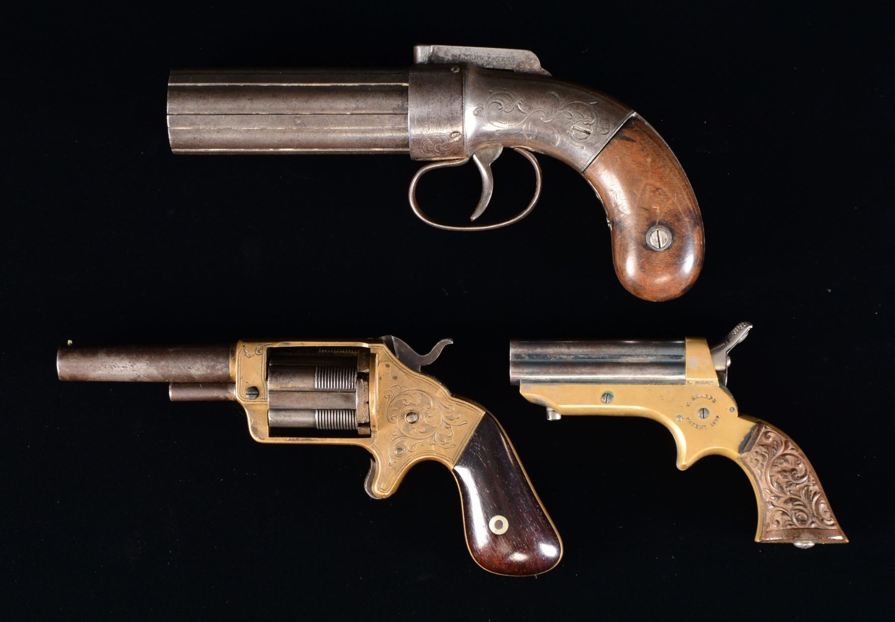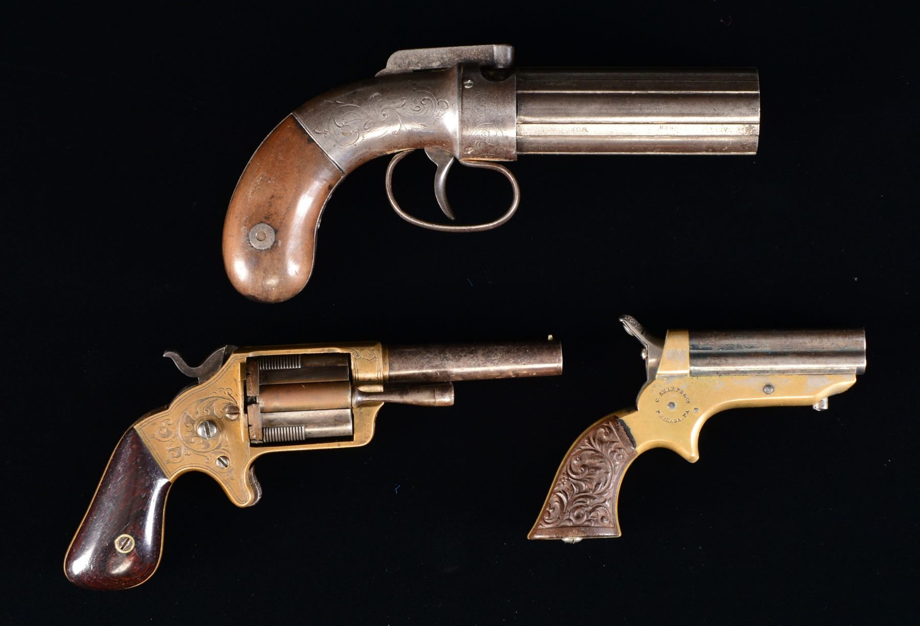 1) BROOKLYN ARMS COMPANY FRONT LOADING POCKET REVOLVER. Cal. 32 RF. S# 1513. Bbl. 3" w/ bead front sight. 5 Shot cyl. w/ sliding chamber tubes. Brass frame w/ spur trigger. Action has vine type scroll engraving & dbl. line borders. 2 Piece walnut grips. Estimated quantity of 10,000 mfg. 1863-1864. CONDITION: bbl. & cyl. finish have faded to mottled patina showing numerous sm. dents & spots of light pitting. 1 Sliding chamber is a replacement. Brass has mild patina appearance. Grips show light wear. Hammer screw is a replacement. Bore is dark w/ sound rifling. (01-17549/DS). 2) ALLEN & THURBER BAR HAMMER PEPPERBOX. Cal. 31. NSN. Bbls. 4" smooth bore 5 shot ribbed cluster. Rnd. body action w/ center mounted hammer & sheet metal recoil shield having open pattern floral engraving. 2 Piece walnut bag type grips. CONDITION: metal has faded to gray showing scattered pitting & having worn markings. Grips show wear w/ spots of dark staining. Bbl. cluster rotates freely & has beat down nipples. Bores are dark w/ scattered pitting. (01-17586/DS) 3) SHARPS MODEL 1A FOUR BARREL DERRINGER. Cal. 22 Short. S# 11478. Bbls. 4" rifled 4 shot cluster. Silver finished brass frame w/ spur trigger. Hammer has rotating firing pin. 2 Piece Gutta Percha grips w/ vine type foliate ornamentation. CONDITION: bbl. retains 30% fading blue. Action retains a sm. amount of silver finish. Bores show scattered pitting. Firing pin rotates properly. (01-17608/DS). ALL ANTIQUE. $650-1,000.