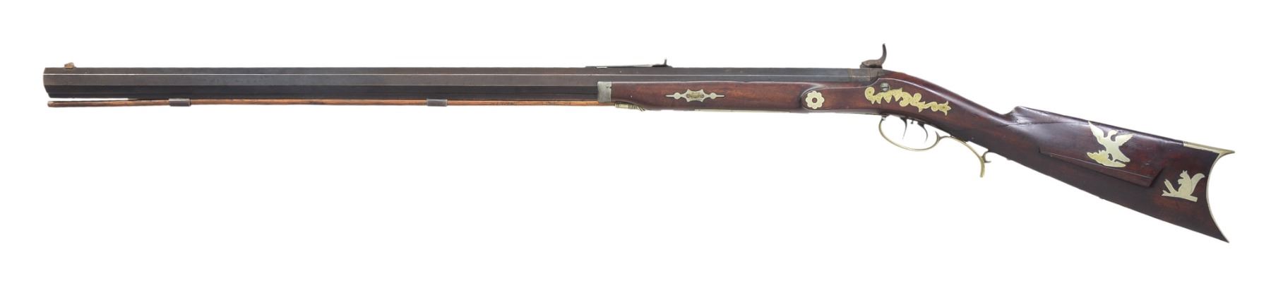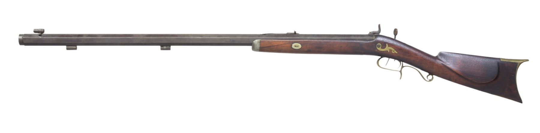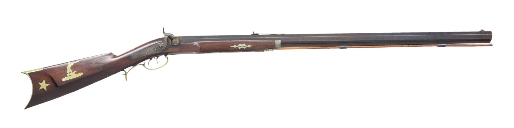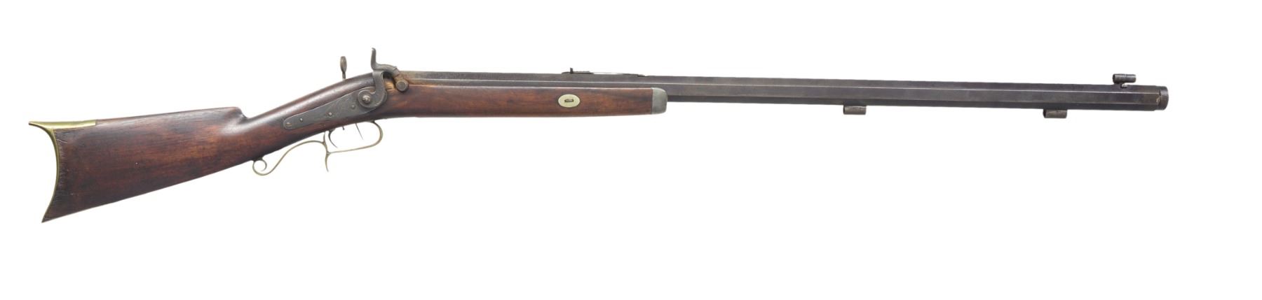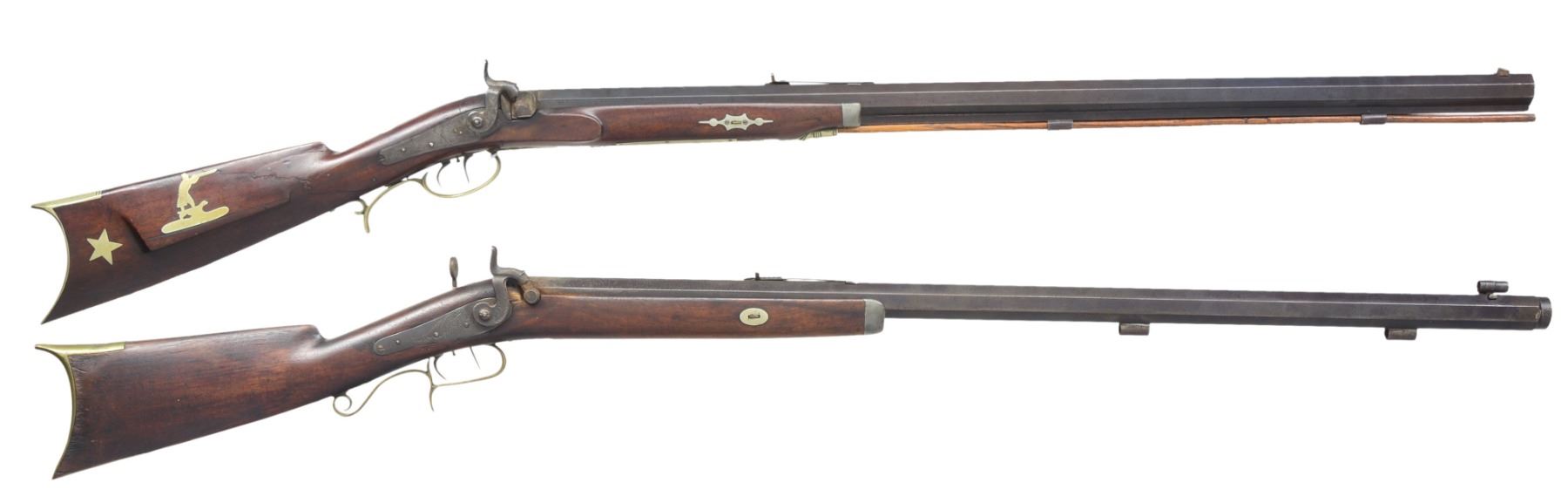 1) "L. COON" HEAVY BARREL HALF STOCK TARGET RIFLE. Cal. 40. NSN. Weighing in at approx 11 lbs, this gun exhibits 32" oct. bbl. marked on top flat "L.COON / CAST STEEL / PATENT". German silver mounted w/ several decorative inlays. Back action lock marked "C. BAKER". Dovetailed brass blade front sight & adj. notch rear sight. CONDITION: good overall. Bbl. retains approx. half of its original blue finish w/ thinning. Dbl. set triggers function well. There is an old nailed wrist repair. All German silver inlays are intact. Rifled bore still crisp w/ pitting. PROVENANCE: From the Estate of Ronald A. Katchuk. (01-16695/JS). 2) BUCKHAM HEAVY BARREL TARGET RIFLE. Cal. 50. S# 27. 11.5 lb rifle w/ 34" oct. bbl. marked on top flat "A BUCKHAM / DELHI NY" & "WARRENTED / CAST STEEL" on either side of S# "27". Half stock rifle is brass mounted w/ pewter nose cap & single key holding stock to bbl. Dbl. set triggers. Rear tang sight. Middle adj. notch & front hooded post front sight. CONDITION: good overall. Bbl. is a mixed gray/brown patina w/ pitting. Brass has medium mustard patina. Appears all original w/ exception of 1 replaced trigger guard screw. Dbl. set triggers are not functioning, mechanics need attention. Fairly bright, well defined bore. PROVENANCE: From the Estate of Ronald A. Katchuk. (01-16696/JS). BOTH ANTIQUE. $800-1,200.