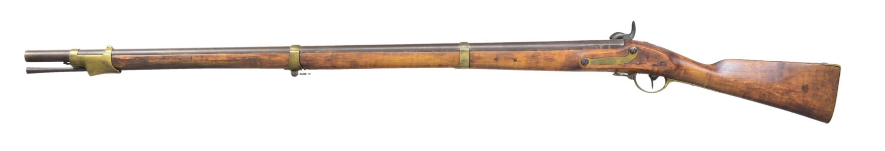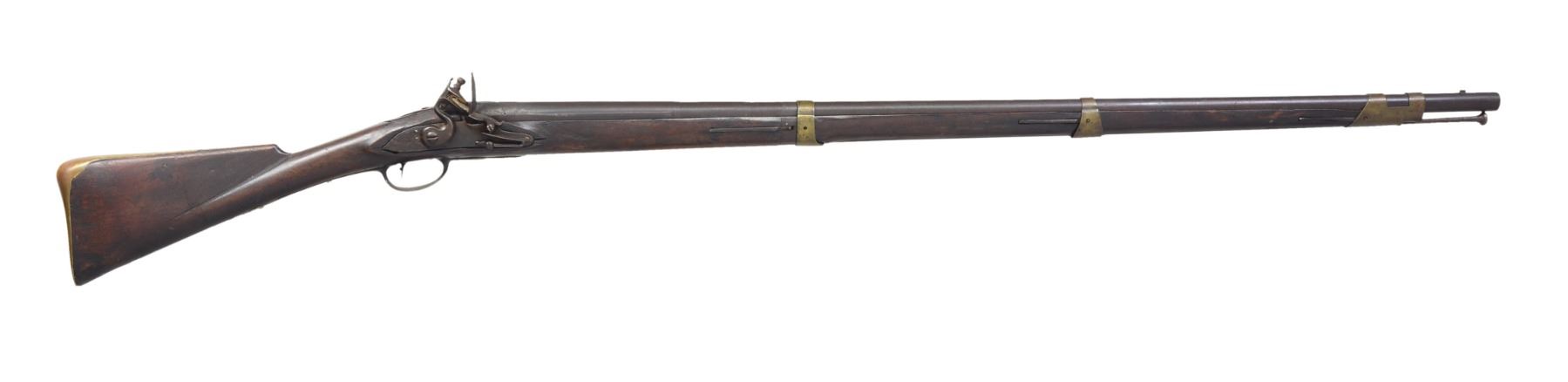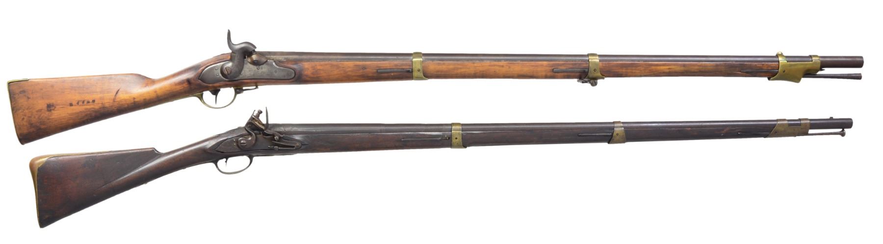 1. Cal. 72. NSN. Suhl model 1809 flintlock musket converted to percussion, dated 1818 on buttplate & 41 1/4” bbl., walnut stock has a recessed cheekpiece, brass mounted, trumpet headed ramrod. A fair quantity of these guns was imported at the outbreak of the Civil War mostly to Midwestern states w/ Germanic populations, photographs can be seen especially among Wisconsin troops posed w/ these large 72 caliber arms. CONDITION: very good overall, complete & original, iron has a dark patina, brass has light mustard patina, stock has been sanded, but is sound. Numerous sm. proofs & unit marks are found on stock, buttplate & bbl. Mechanics are fine w/ clean smoothbore. (01-16752/JS). 2. Cal. 65. NSN. European fowler, circa 1790, 54 1/2” overall, 40” 3 stage bbl., brass mounted. Bbl. has floral relief moldings at breech & indiscernible proof mark, lock is lightly engraved, early unsupported serpentine cock, unbridled frizzen, long 5 1/2" early buttplate tang. CONDITION: good overall, iron has brown patina, brass medium mustard patina, stock has hand worn patina & glued repair w/ a lg. 5” thin inset under forward portion of lock. Mechanically fine w/ smooth clean bore. PROVENANCE: From the Estate of Ronald A. Katchuk. (01-16753/JS). BOTH ANTIQUE. $800-1,200.
