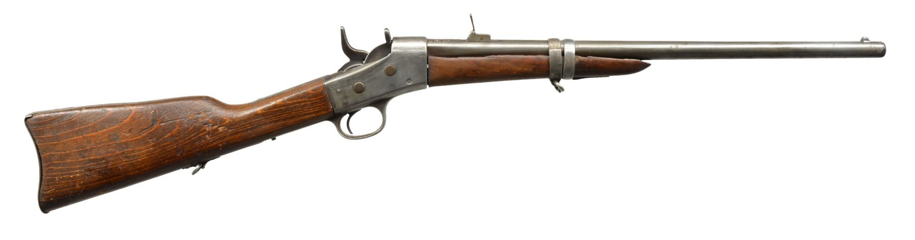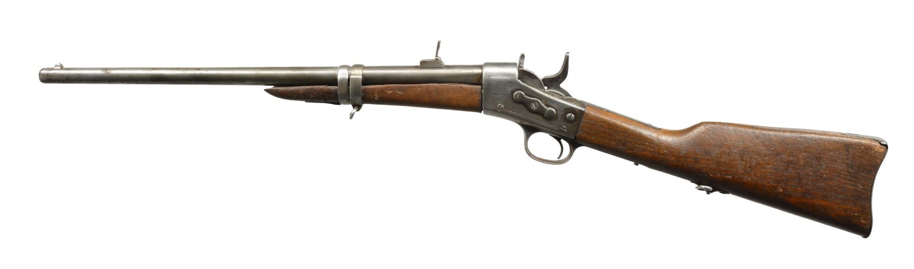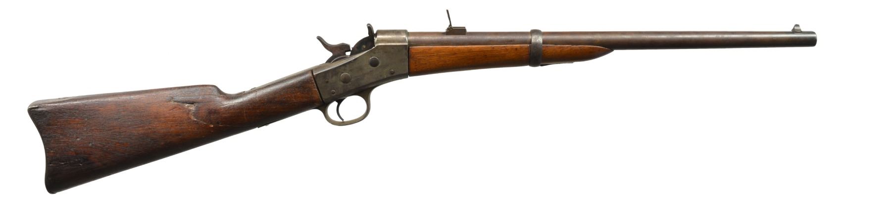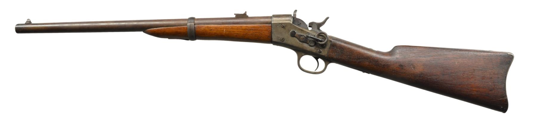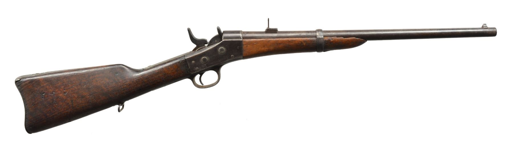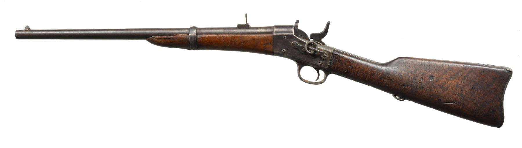 ALL: NSN. 1) MIDDLE EASTERN CONTRACT. Cal. 43 Egyptian Remington or related cartridge. Bbl. 20 1/2" w/ military blade front sight & 100-500 2 position carbine rear sight. Bbl. has Farsi markings between receiver & rear sight. Top tang has 3 line address, last patent date is March 1874. Band fastened walnut forearm has added band & swivel. Replacement hardwood stock w/ inletted swivel & carbine buttplate. CONDITION: heavily polished metal. Forearm shows cracks & chips along bbl. channel w/ lg. chips near action. Stock has worn appearance showing numerous dents & marks. Bore retains largely intact rifling showing light pitting. (01-17663/DS). 2) Cal. 50 RF. Bbl. 20" w/ military blade front sight & 100-500 2 position carbine rear sight. Top tang has 2 line address, last patent date April 17th, 1866. Left side of action has saddle ring & bar. Band fastened walnut forearm & straight grip stock w/ carbine buttplate. CONDITION: metal finish has faded to mottled patina showing spots of pitting. Forearm is heavily sanded & refinished Stock has coarse dark refinish w/ gaps between action having chips, cracks & glued repairs around top tang, buttplate & right side of wrist. Bore has worn rifling showing scattered pitting. (01-17665/DS). 3) Cal. 50 RF. Bbl. 20 1/2" w/ military blade front sight & 100-500 2 position carbine rear sight. Top tang has 2 line address, last patent date April 17th, 1866. Left side of action has saddle ring & bar. Band fastened walnut forearm & straight grip stock w/ inletted sling swivel & carbine buttplate. CONDITION: metal finish has faded to dark patina showing scattered pitting & scratches. Forearm has cracks & chips along bbl. channel & at tip. Heavily sanded stock w/ age darkened appearance showing numerous dents & handling marks. Pitted bore retains partially intact rifling. (01-17701/DS). ALL ANTIQUE. $750-1,200.
