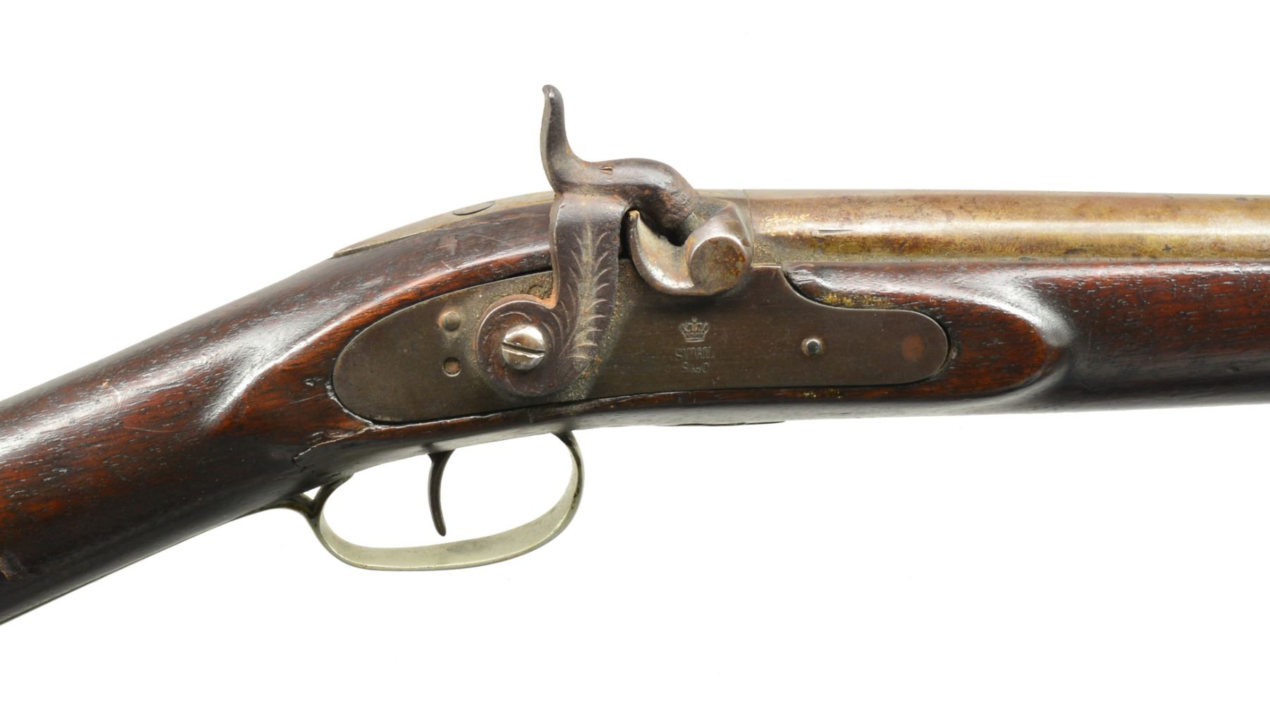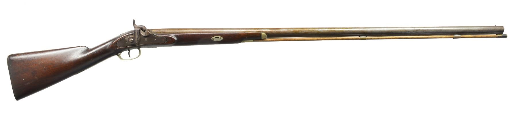 PITTSBURGH. Cal. 12 Ga. NSN. Bbl. 41” rnd. w/ bottom rib having makers name on top reading "T.H. JOHNSTON / GREAT WESTERN / GUN WORKS / PITTSBURG, PA." They were working between 1865 & 1923 as a retailer & manufacturer of all types of guns. Percussion lock w/ flat faced hammer is marked “SUHL” under a crown. American walnut stock w/ steel buttplate mounted w/ German silver trigger guard, forend tip, bbl., bolt escutcheons & thimble. Hickory is held by 2 plain brass pipes. CONDITION: fair to good. Bbl. has scattered brown patina. Lock has blue over pinprick pitting. Stock refinished. Bore rusted. Lock works. (01-17500/MGM120). ANTIQUE. $300-400.