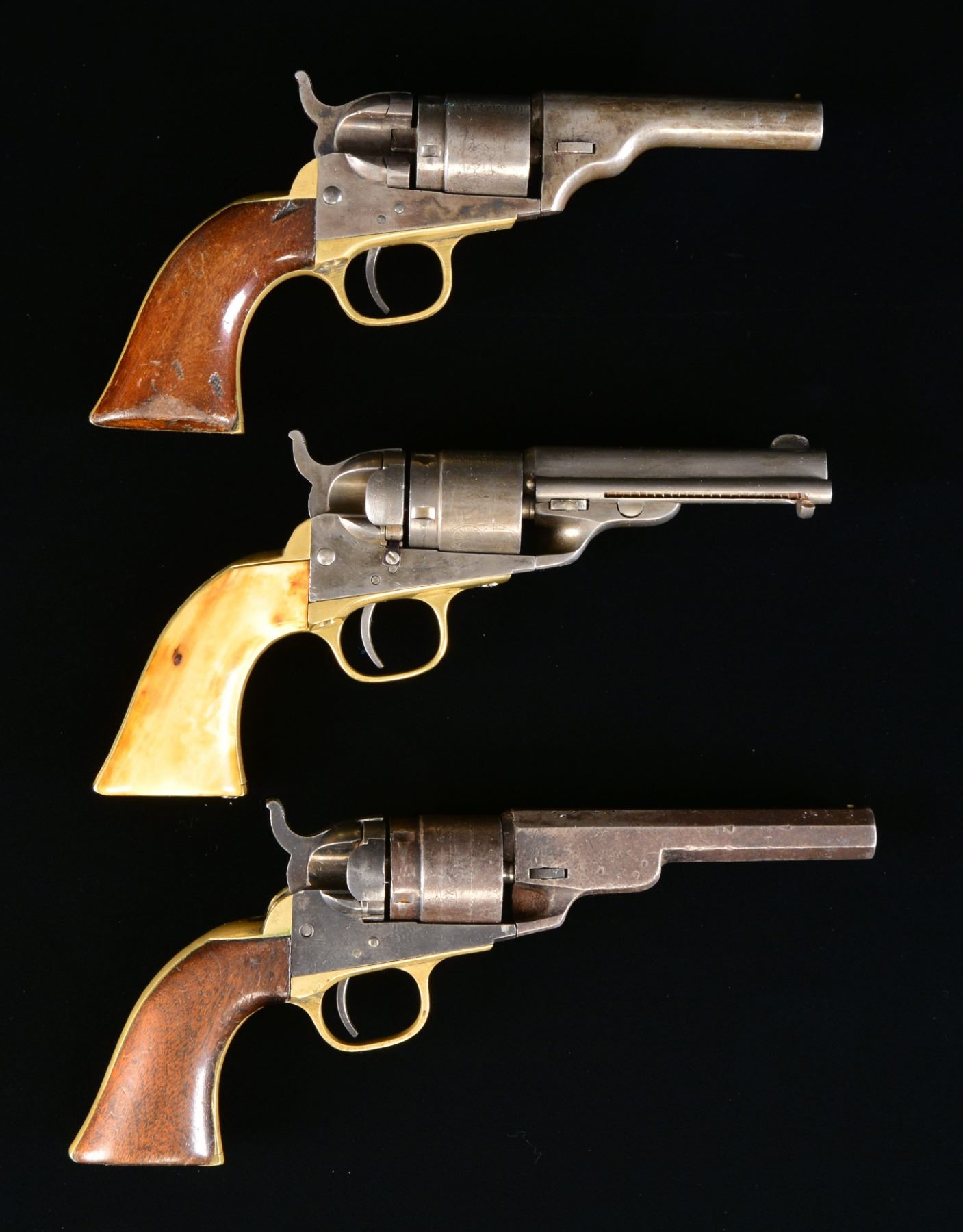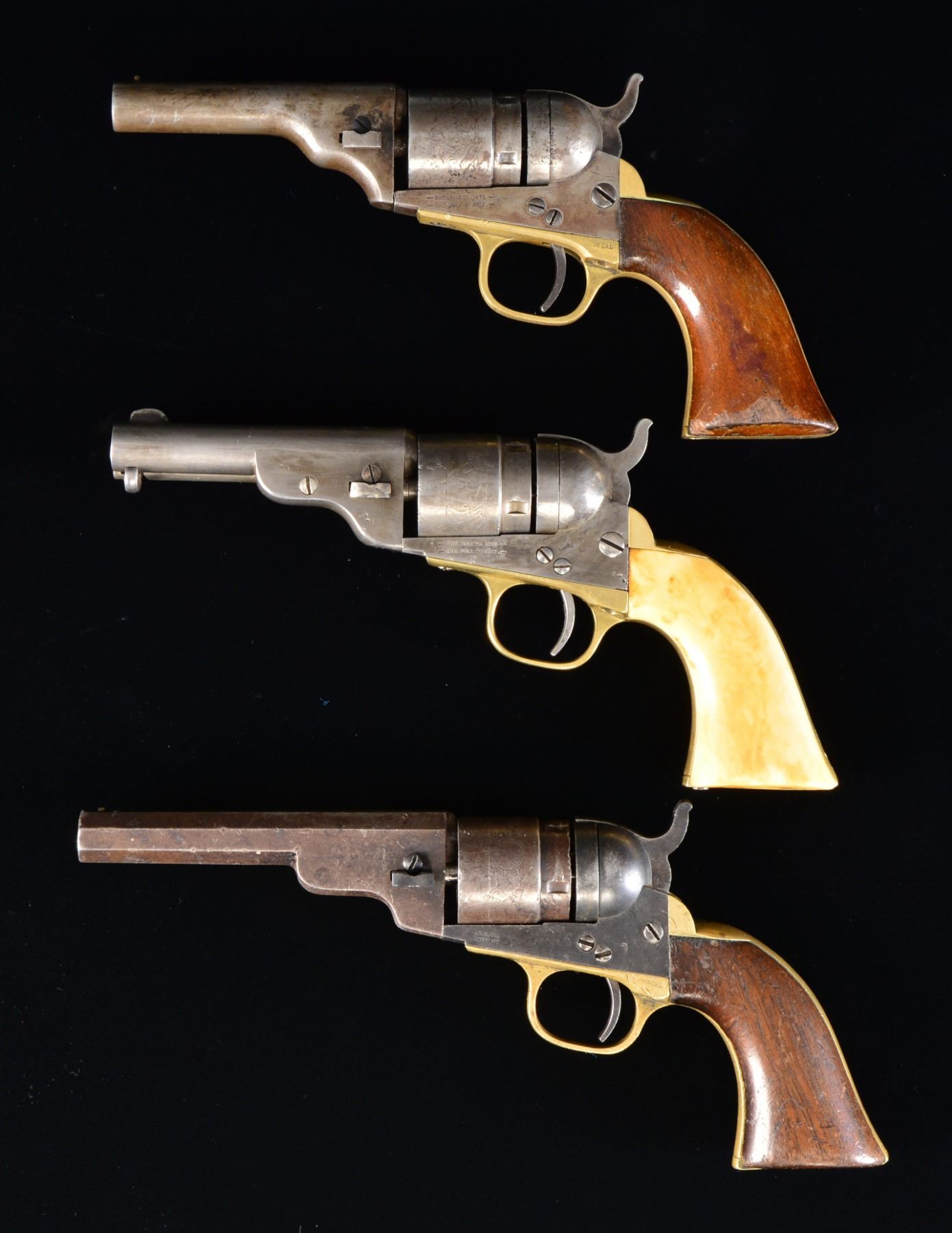 1) POCKET CONVERSION. Cal. 38 CF. S# 4810. Bbl. 4 1/2" oct. w/out ejector having plugged loading lever slot. Stagecoach scene roll engraved 5 shot rnd. rebated cyl. Action is fitted w/ conversion plate. Brass trigger guard & backstrap. Frame, bbl., cyl. & grip straps have matching numbers. Replacement wedge. 1 Piece walnut grip. CONDITION: metal finish faded to mottled patina w/ numerous dents, marks & spots of pitting. Grip straps have cleaned appearance w/ series of dents at butt. Grips show heavy wear w/ scratches & dents having chips at toe. (01-17530/DS). 2) POCKET NAVY CARTRIDGE MODEL. Cal. 38 CF. S# 10330. Bbl. shortened to 3 5/8" w/ blade front sight having ejector & housing on right side. Stagecoach scene roll engraved 5 shot rebated cyl. Frame is fitted w/ conversion plate. Brass grip straps. Backstrap has added scroll highlight engraving w/ punch dot background. Frame, bbl., cyl., & trigger guard have matching numbers. Backstrap is numbered "305330". Original 1 piece ivory grip. CONDITION: metal has cleaned gray appearance. Several action screws are replacement. Grip straps are brightly polished. Grips show age related cracks & have acquired a mild yellow color. Action is bound up & will not cycle. Bore shows scattered pitting w/ worn rifling. (01-17562/DS). 3) CARTRIDGE MODEL. Cal. 38 RF. S# 5167. Bbl. 3 1/2" solid type rnd. w/out ejector. Stagecoach roll engraved 5 shot rnd. rebated cyl. Frame has added conversion plate. Brass grip straps. 1 Piece walnut grip. Frame, bbl., cyl. & grip straps have matching numbers. CONDITOIN: metal has faded to mottled gray w/ scattered spots of pitting, scratches & sm. dents. Grip straps are cleaned. Grips have worn finish showing handling marks w/ dents at butt & chips at toe. Dark pitted bore w/ worn rifling. (01-17594/DS). ALL ANTIQUE. $1,000-1,500.