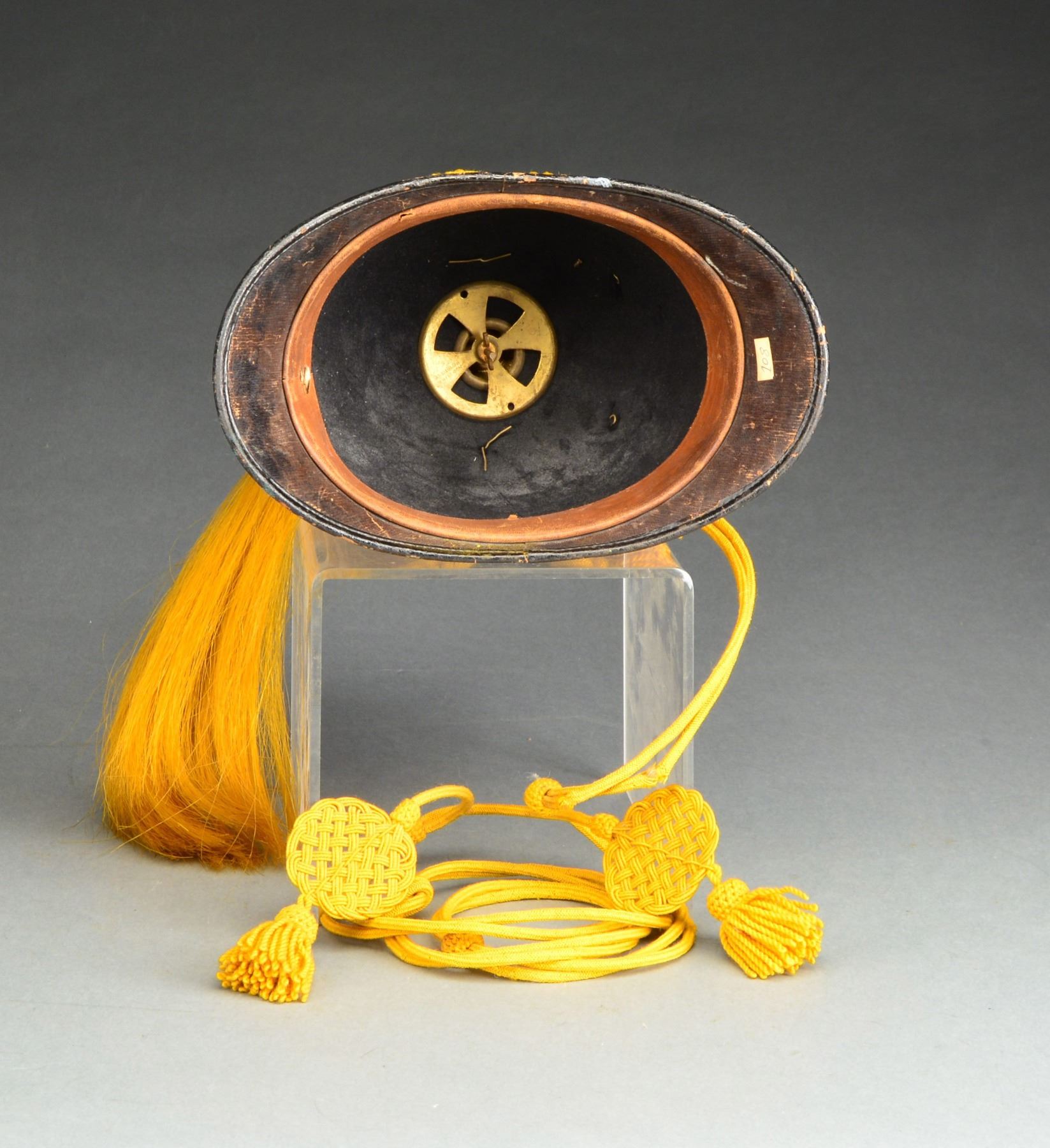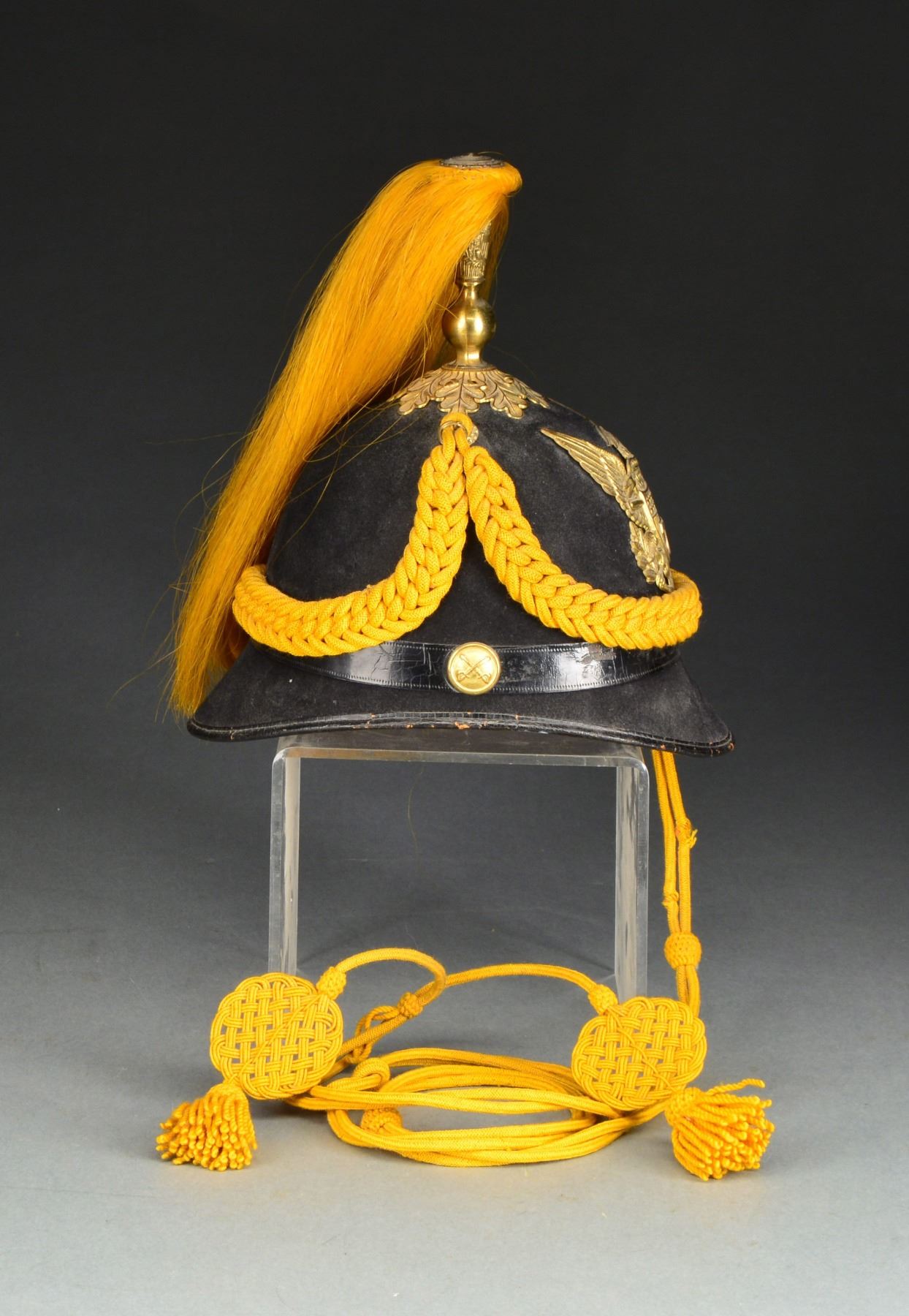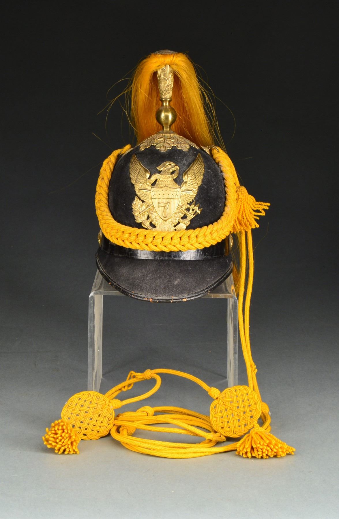 Helmet has a 1 piece black felt body. A cavalry eagle is attached to the front w/ a "7" in the center of the shield. Side buttons are cavalry. Gilded brass eagle plume holder w/ yellow plume. Full sized yellow cords are attached to the helmet w/ correct cords guides. Interior vent cover is marked "RAYMOLD & WHITLOCK". CONDITION: helmet is solid but quite dusty. Interior shows some light wear & there is a bit of fraying to the cords however they do remain functional. (02-12844/BF). $400-600.