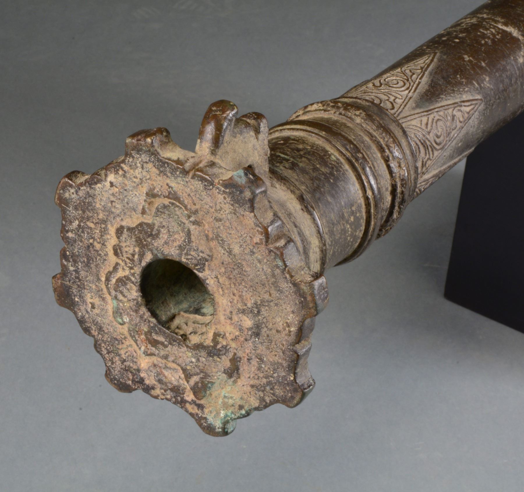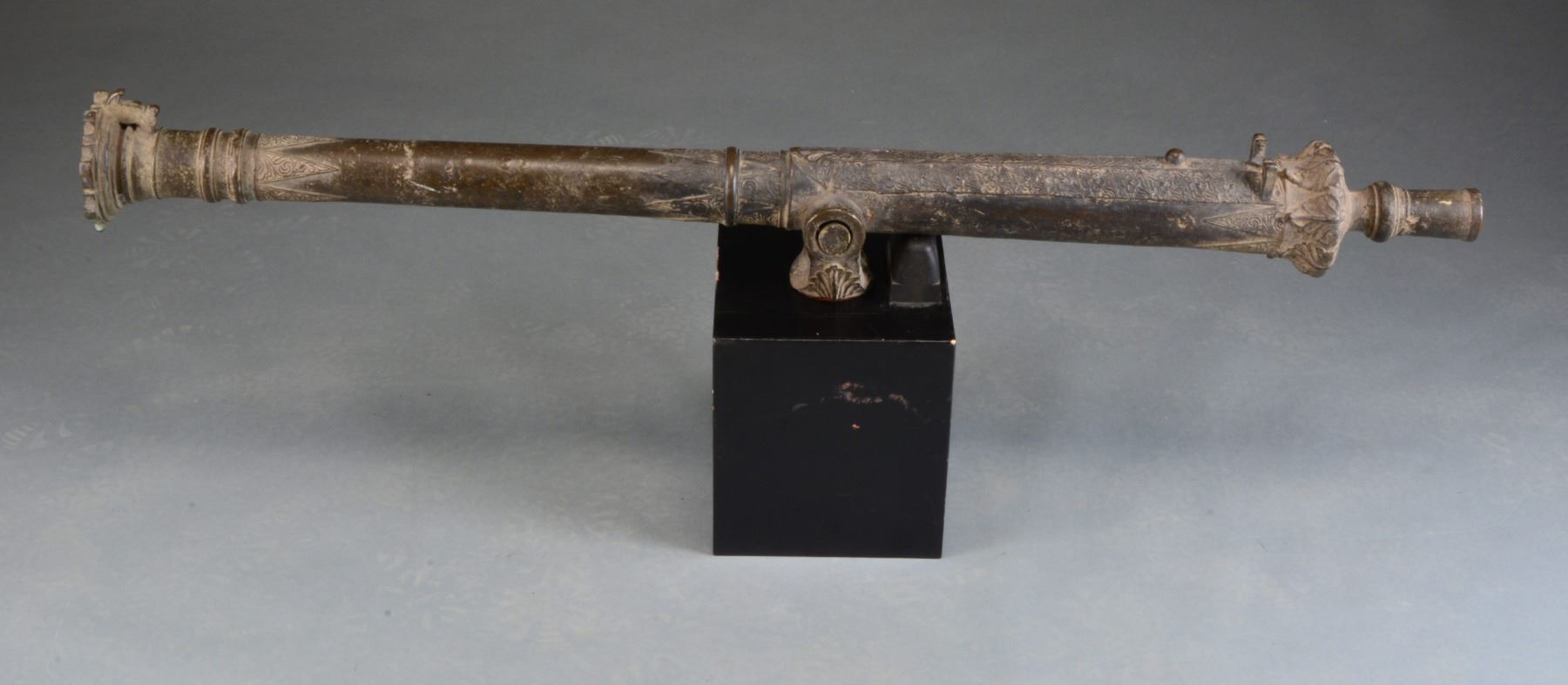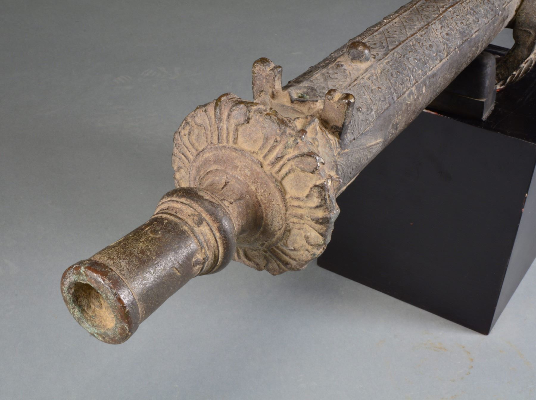 WW2 AMERICAN NAVY COMMANDER ALLEN MAYHEW SHINN. This 49 1/2" Lantaka w/ approx. 1 1/4" bore is solid bronze & weighs 85.7lbs. Shinn (1908-1998) was stationed in the South Pacific where he collected this souvenir according to his son, he later displayed & had a custom stand made that accompanies. Shinn retired as Vice-Admiral serving in Navy from 1932-1970. Typical of Lantakas is 5" tiller & a lg. 5" decorated flange at the muzzle. Cannon still retains bronze yoke which was integrally cast. Multi stage oct. to rnd. With raised ring transitions having typical long tapered Mindanaoan triangular floral decoration. Lantaka have been made in Mindanao for almost 300 years, many have been brought back by GI's as souvenirs from the Spanish American War through World War II like Vice-Admiral Shinn. Though these cannon were sometimes used as weapons; for the most part they were used as a sign of wealth. In the 19th century, it was not uncommon for a wealthy family to display many of these bronze relics around their home. UNATTACHED ACCESSORIES: provenance paperwork. CONDITION: overall very good w/ bronze patina, scattered casting flaws, finishing marks, accompanying stand is solid. PROVENANCE: Vice-Admiral Allen Mayhew Shinn & Allen Mayhew Shinn Jr.; James Julia auctions March 2013, lot 1542 (02-13475/JS). $3,000-5,000.