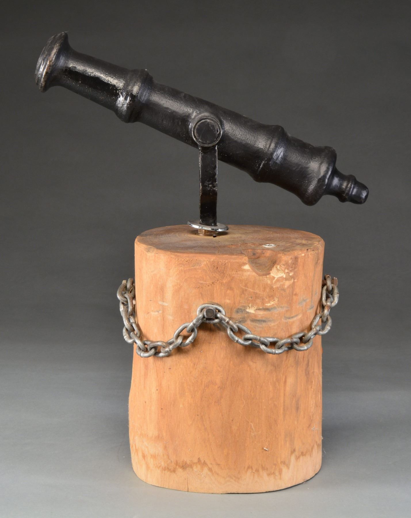 A 20th century version of a classic swivel gun cannon measuring 21” in length & 7” across at the trunnions. Cannon has a 1” bore. Swivel gun is mounted on a 14” high 12” diameter wooden log w/ chain draped around it. Cannon is painted black & stand is natural. CONDITION: swivel gun & stand show light overall use. (02-13714/BF). $200-400.