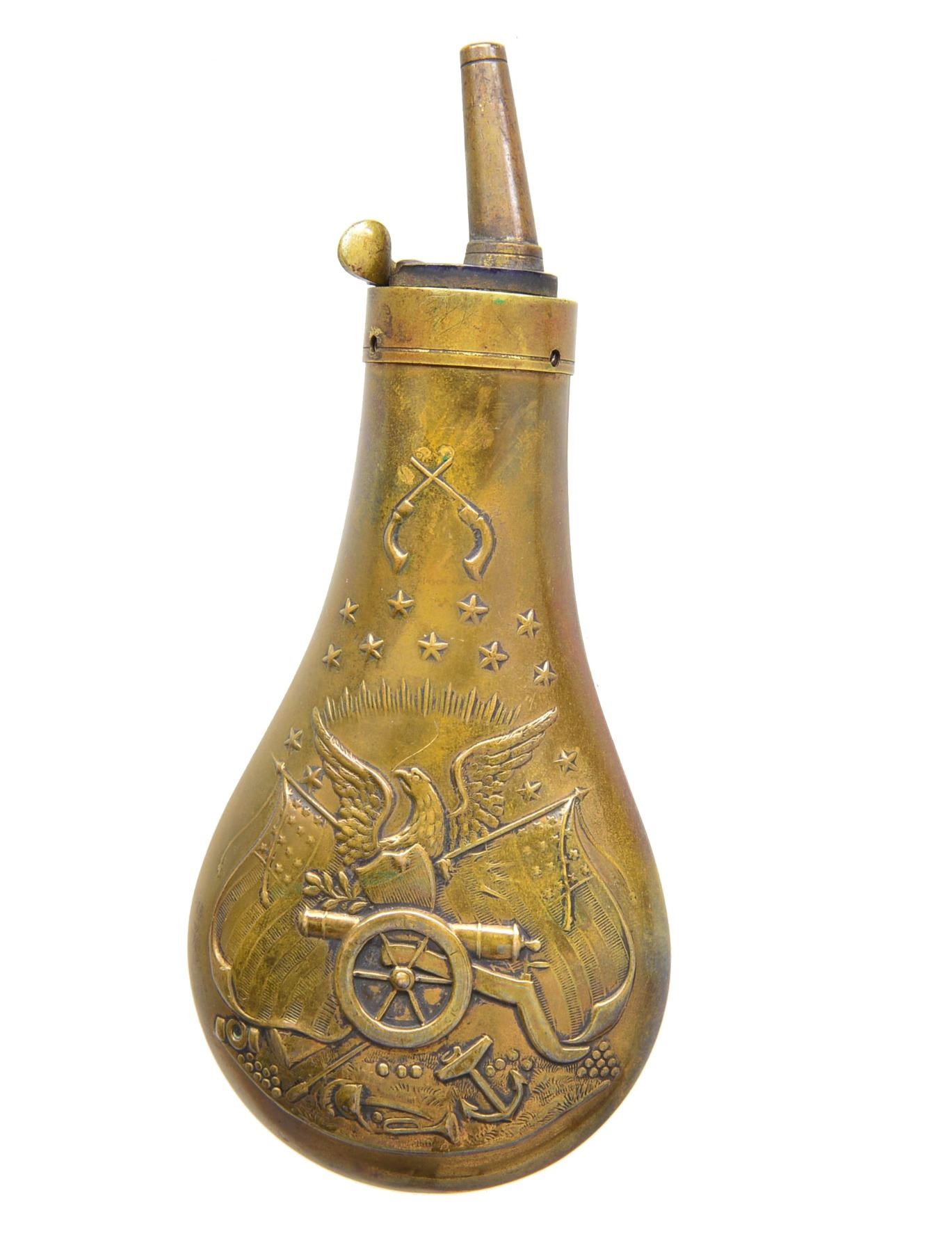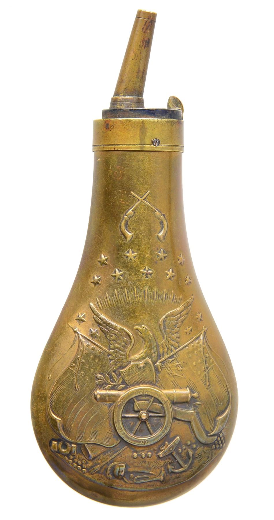 Manufacture by the American Flask & Cap Co. Rather late design introduced after 1857. This flask was used w/ Colt & other types of Navy revolvers. Because of this association this flask is commonly known by collectors as the Colt Navy Flask. Patriotic theme engraving consists of crossed revolvers, stars & sunburst over American eagle & shield w/ flag & cannon over sword, bugle & Navy anchor. Height: 5 1/2". Width: 2 7/8". 1 1/2" Fixed angled spout. CONDITION: copper finish has acquired a pleasing mild patina. Body shows a few sm. handling marks. (02-13550/DS). $200-350.