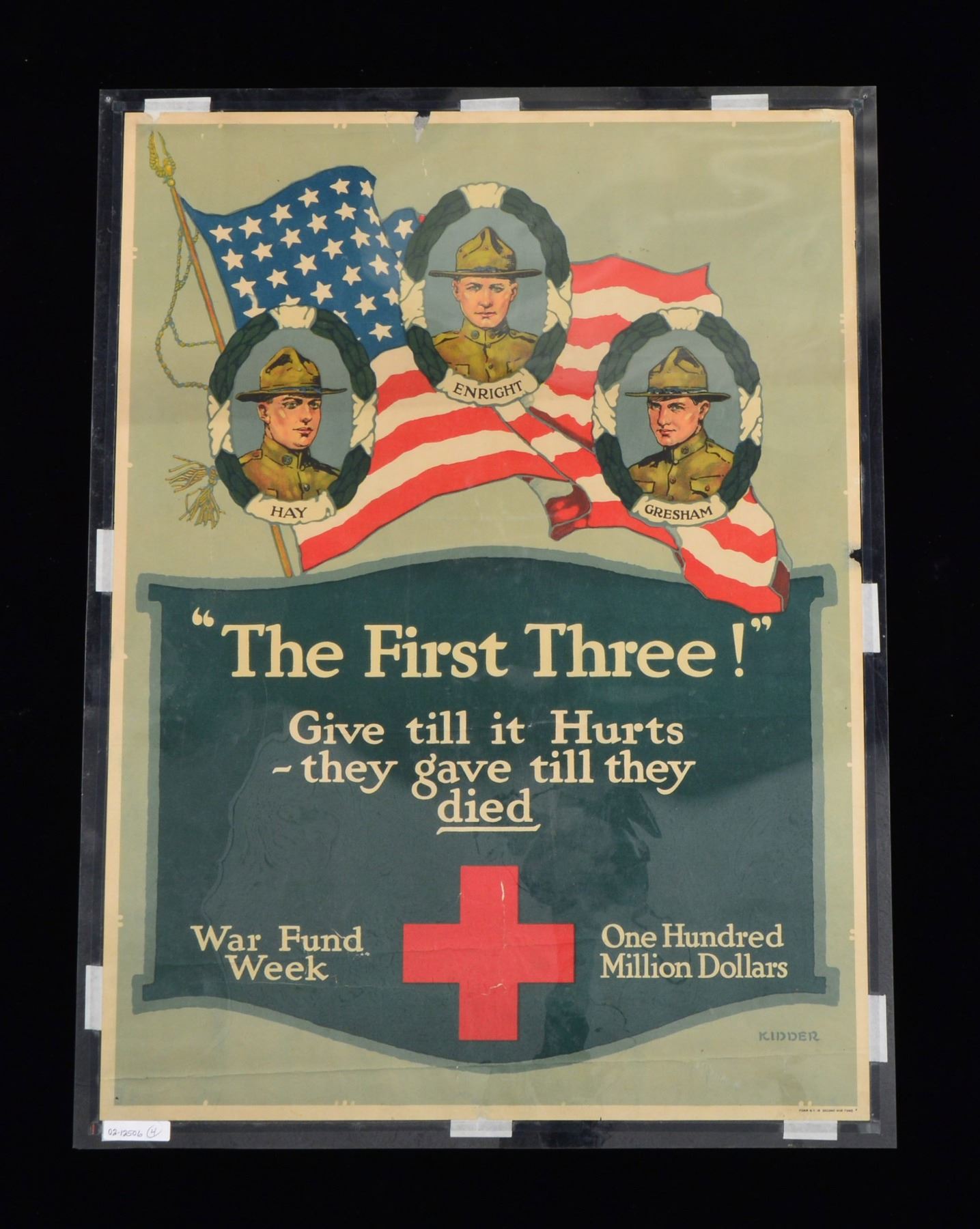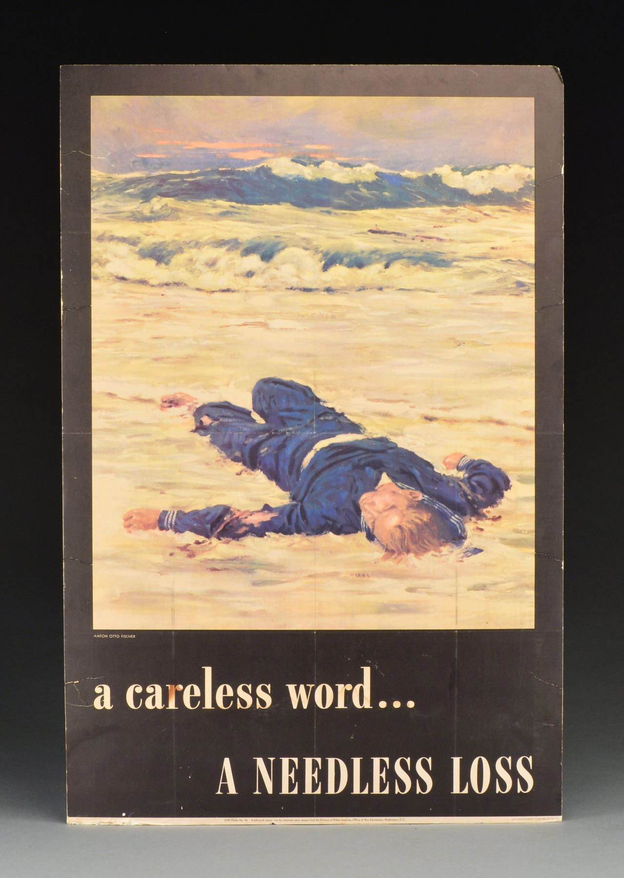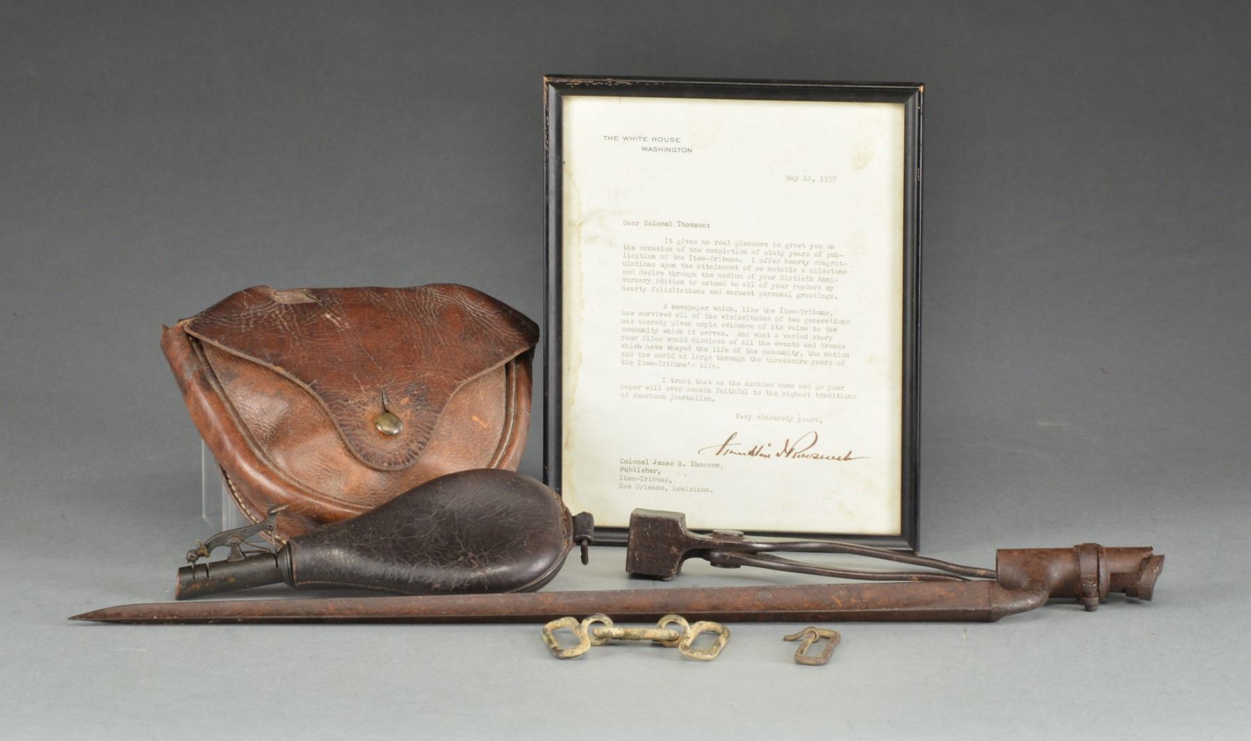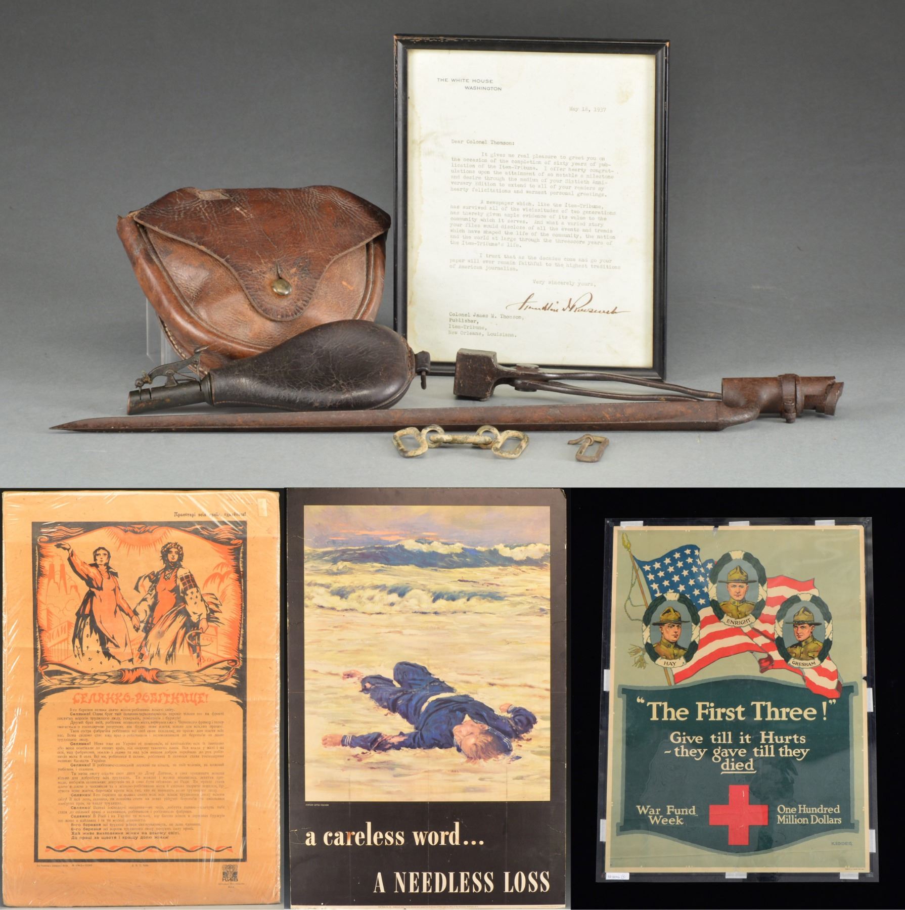 FROM THE CIVIL WAR TO WWII. This varied lot includes 1 leather shot pouch w/ brass charger. / 1 Excavated Civil War Enfield bayonet. / 1 Civil War excavated snake buckle & keeper. / 1 Post Civil War scissor type bullet mold, approx. 45 cal. / 1 Bullet pouch/cartridge box of possible Confederate association. Pouch is hand sewn pigskin w/ a lg. brass finial. Attached tag states that the pouch was found in Texas. / 1 Typed letter, in a frame measuring 9 3/8" x 7 1/2", from "THE WHITE HOUSE WASHINGTON" dated May 18, 1937 to Col. James M. Thomson of New Orleans, Louisiana, signed in ink by Franklin Roosevelt. Letter has staining on the left hand margin. / 1 Poster measuring 27 3/8" x 20 1/2" featuring chest up views of 3 WWI soldiers surrounded by wreaths w/ names below; left to right, "HAY / ENRIGHT / GRESHAM". Poster reads "The First Three! Give till it Hurts they gave till they died". Poster is signed "Kidder". There are sm. losses primarily at the top edge. / 1 Russian poster measuring 23" x 15" featuring what appears to be the Goddess of Agriculture walking w/ a peasant woman. / 1 Poster measuring 38" x 25" of a dead sailor washed up on shore by Anton Otto Fisher w/ the caption, "a careless word... A NEEDLESS LOSS". Poster is mounted on foam core. / 1 Poster measuring 10" x 59 1/2" featuring a soldier w/ a missing gun & the caption, "A Half Filled Stamp Album is like a Half-Equipped Soldier" followed by an image of a ration book. CONDITION: all items show light to moderate wear except as noted. (02-12506/BF). $400-700.
