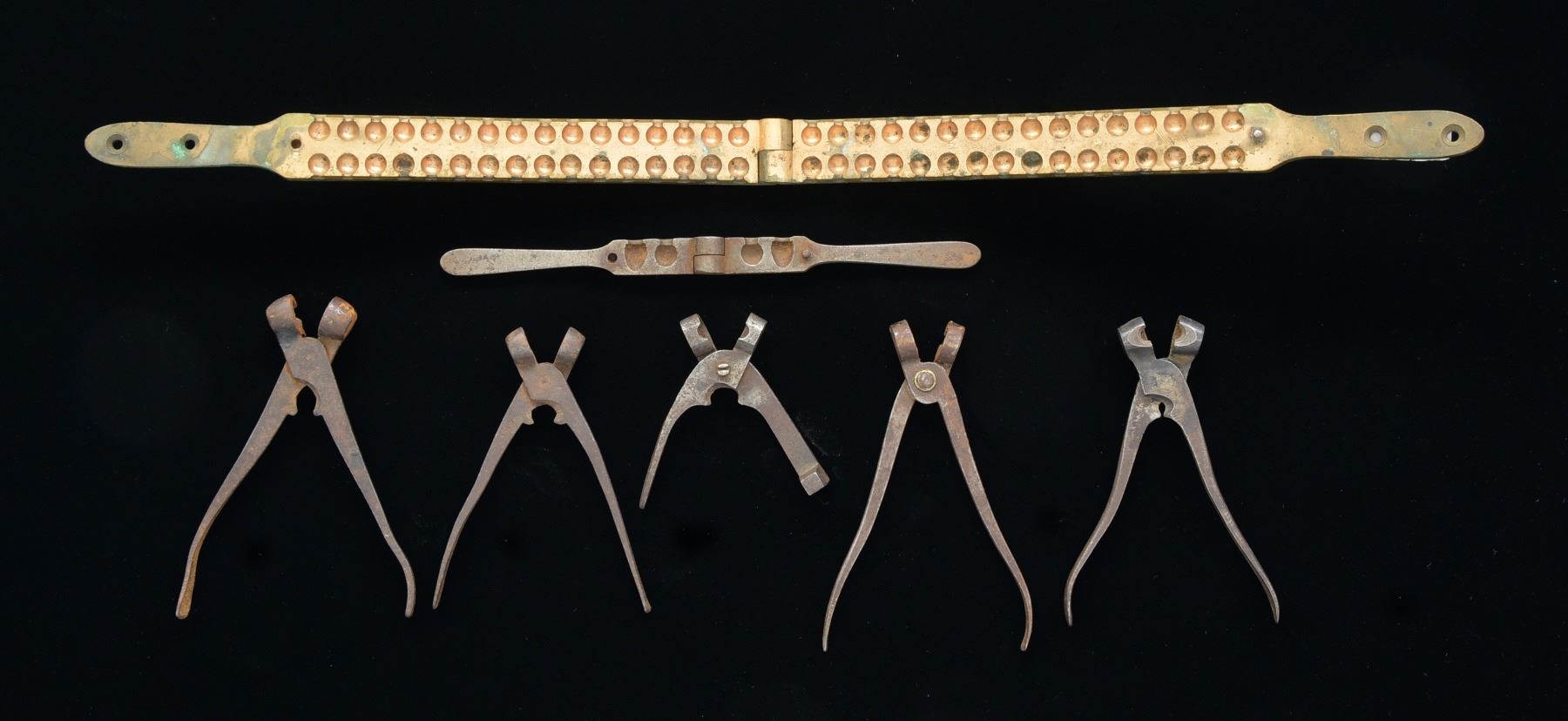 These interesting molds include a 32 cavity brass buckshot mold, 10 3.8" in length. Top & bottom of the mold are stamped "M.L. GOODMAN VA 140". / 1 Iron 2 cavity mold for a rnd. ball & mini ball, likely of 36 cal. for a pistol. / 5 Iron single cavity molds for various sizes of rnd. balls. CONDITION: all molds are fully functional. Brass mold is possibly missing wooden handles as there are 2 holes in each handle area. 2 Cavity mold has light overall pitting. Single cavity molds have a dark oxidized finish. (02-13305/BF). $500-800.