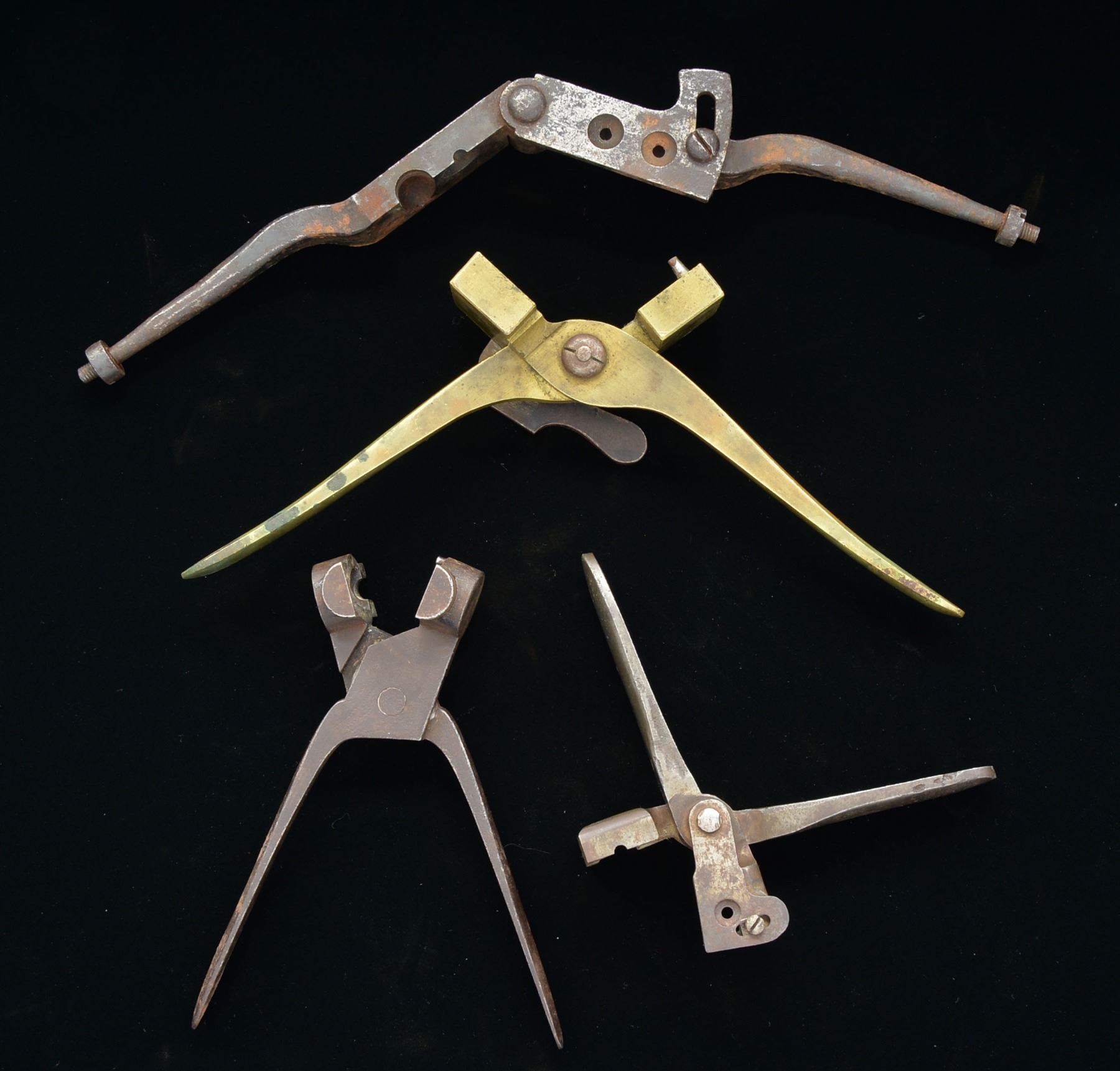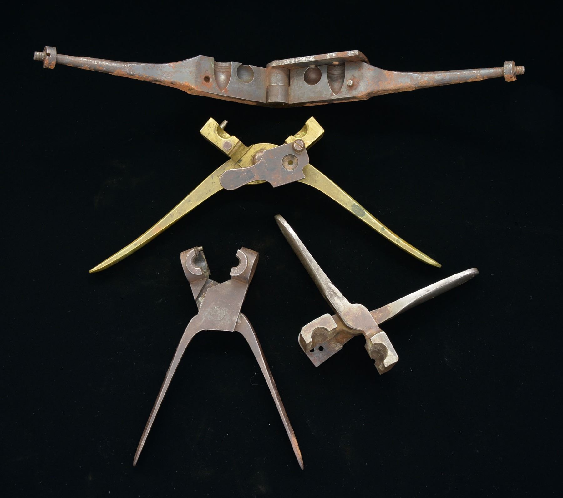 This lot has a brass English style mold w/ iron sprue cutter marked on 1 handle "NO. 20". Other 3 iron molds are all reminiscent of battlefield found rds., especially the crude iron nose sprue high base 3 ring minié. CONDITION: 3 molds are very good. The 2-cavity ball & minié mold w/ sprue cutter is good overall, missing handles w/ rust & pitting, though cavity is very good. PROVENANCE: Estate Collection of Dan Poppen. (02-13447-4/JS). $800-1,200.