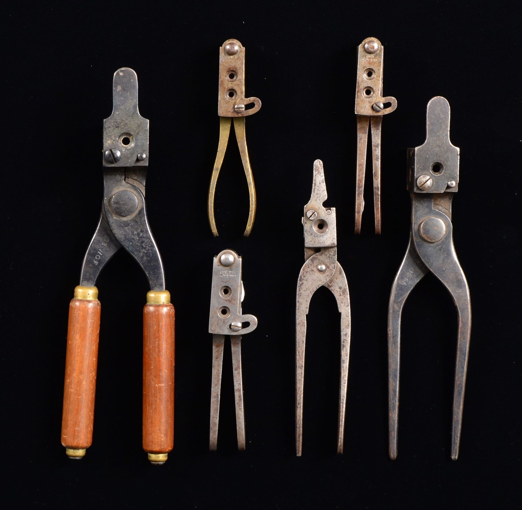 This varied group of molds includes 1 Scissor type mold, cal. 38WCF w/ sprue cutter marked “MANUFACTURED BY THE WINCHESTER REP ARMS CO NEW HAVEN, CONN. U.S.A.” / 1 Scissor type mold, cal. 40-65 w/ sprue cutter marked “MANUFACTURED BY THE WINCHESTER REP ARMS CO NEW HAVEN, CONN. U.S.A.” / 1 Scissor type mold, cal. 38 w/ sprue cutter. / 1 Hinged 2 cavity pistol mold, cal. 28 w/ sprue cutter marked on the cutter “COLT’S PATENT”. / 1 Hinged 2 cavity pistol mold, cal. 32 w/ sprue cutter marked on the cutter “COLT’S PATENT”. / 1 Hinged 2 cavity pistol mold, cal. 38 w/ sprue cutter marked on the cutter “COLT’S PATENT”. CONDITION: all molds show light to moderate wear & are fully functional. (02-13463/BF). $400-700.