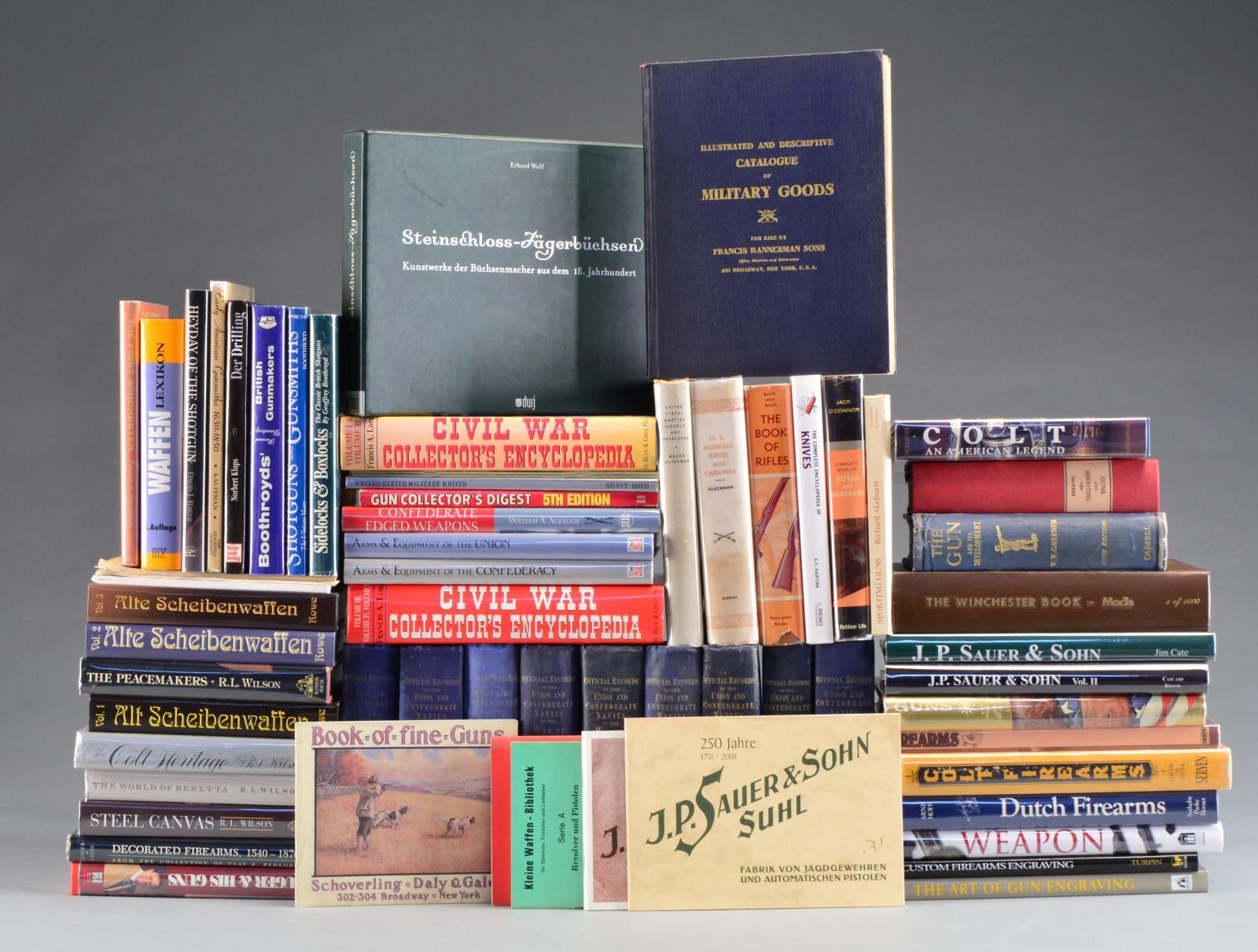 REFERENCE BOOKS. Notable titles include: "Guns & Shooting" by Hawker. / "Boothroy's Revised Directory of British Gunmarkers". / Vols. 1-3 "Alte Scheibenwaffen" by Rowe. / "Colt Firearms" by Serven. / "Dutch Firearms" by Hoff. / Vols. 1 & 2 "J.P. Sauer & Sohn" by Cate. / "Decorated Firearms" by Gusler & Lavin. / "Colt" by Wilson. / "Confederate Edged Weapons" by Alb Augh. / 9 Assorted Volumes "Official Records of Union & Confederate Navies in the War of Rebellion". CONDITION: range from good to very good w/ light wear, scuffing & staining. "Official Records" have notable fading & staining. Bindings are serviceable. (02-13345-5/RW). $300-500.