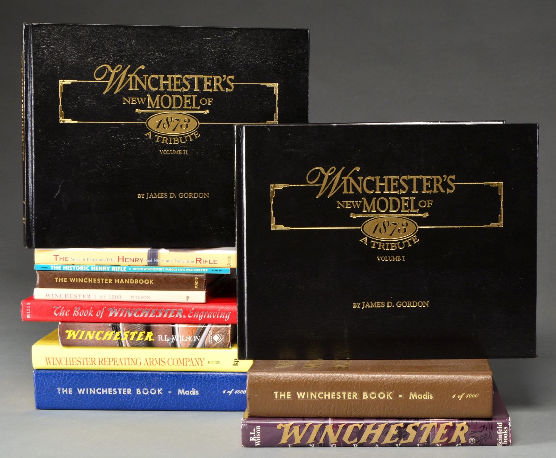 Winchester's New Model of 1873; A Tribute, Volume I & Volume II by James D. Gordon. / Winchester; The Golden Age of American Gunmaking and the Winchester, 1 of 1000 by R. L. Wilson. / The Book of Winchester Engraving by R. L. Wilson. / Winchester An American Legend; by R. L. Wilson. / Winchester Engraving by R. L. Wilson. / The Winchester Book; 1 of 1000 by George Madis. / The Winchester Book; Silver Anniversary Edition, 1 of 1000 by George Madis. / The Winchester Handbook; 1 of 1000 by George Madis. / Winchester Repeating Arms Company; Its History & Development from 1865-1981 by Herbert G. Houze. / The Henry Rifle by Les Quick. / The Historic Henry Rifle by Wiley Sword. CONDITION: all very good to excellent. PROVENANCE: Vicente Sepulveda Collection. (02-13629-1/DS). $750-1,500.