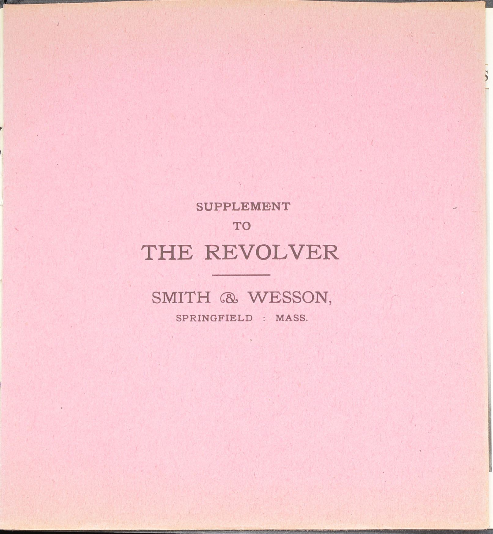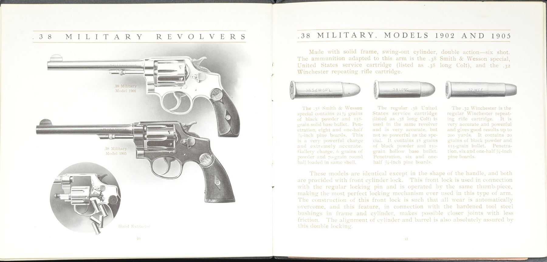 47 Page guide produced by Smith & Wesson "FOR THE POCKET FOR THE MILITARY AND FOR TARGET PRACTICE". 6 1/2" x 6 1/8" w/ Black soft cover having gold marked title "The REVOLVER". Beginning pages gives a brief synopsis of hand held weapons from the crossbow to the double action revolver. Subsequent pages talk about Smith & Wesson's mechanical superiority, finish, stocks & show styles of engraving. The brochure further talks about target shooting, ammunition & revolver operating directions. Pages 24-40 show S&W models beginning w/ the Single Action Model 1880 through Model 1905 military & the Single Shot Target pistols. A pink 2 page supplement includes the S&W Model 1908 44 Hand Ejector & 38 Perfected revolvers. CONDITION: fine overall condition. Cover shows very slight tattering of corners & discoloration. Pages show slight yellowing around edges. (02-13454/DS). $200-400.