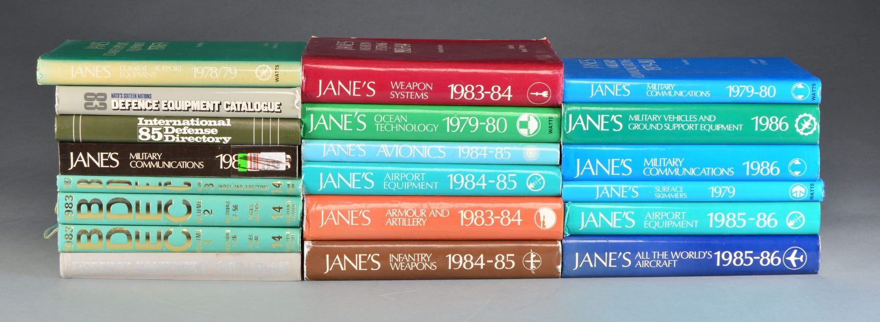 RELATED BOOKS & CATALOGS. An interesting collection of identification & procurement encyclopedias. The “Jane’s” titles are some of the most highly regarded pieces of literature on the subject & there are several offered in this lot, including: “Jane’s Infantry Weapons 1984-85” / ”Jane’s Airport Equipment 1984-85” / “Jane’s Avionics 1984-85” / “Jane’s Armor and Artillery 1983-94” / “Jane’s Ocean Technology 1979-80” / “Jane’s Weapon Systems 1983-84” / “Jane’s Surface Skimmers 1979” / “Jane’s Airport Equipment 1985-86” / “Jane’s Military Communications 1979-80, 1986” / “Jane’s All the Worlds Aircraft 1985-86” / “Jane’s Military Vehicles and Group Support Equipment 1986” / “Jane’s Combat Support Equipment 1978-79” / “Jane’s Military Communications 1989”. Also included are the “British Defense Equipment Catalogue 1983 Vol. 1, 2, 3” / “NATO’S SIXTEEN NATIONS Defense Equipment Catalogue 1983” & “1982” / “1985 International Defense Directory”. CONDITION: in quickly examining each book, while there may be an occasional dog ear corner fold, the vast majority of the pages are in a condition that indicate most have been only flipped through at best, w/ the exception of one cover there doesn’t seem to be any significant sun damage. All hard cover books in the “Jane’s” family still retain their color paper jacket. PROVENANCE: Reference Library of an International Arms Dealer. (02-13749/JZ). $400-600.