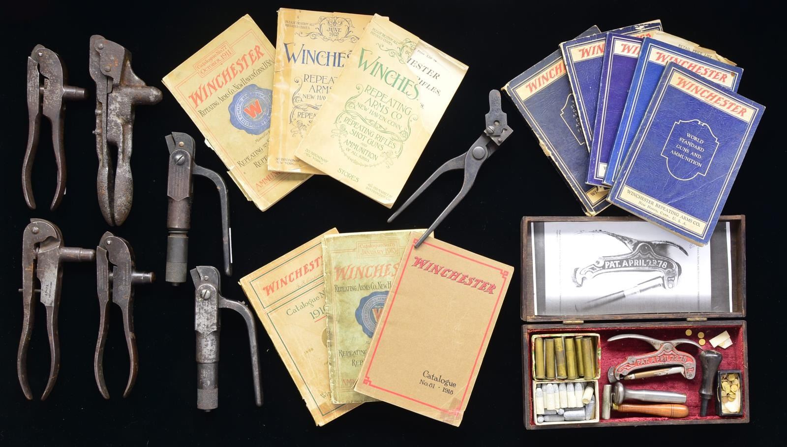 RELOADING TOOLS. 11 EARLY WINCHESTER REPEATING ARMS CATALOGS: 1) Oct. 1900. 164 Page catalog introducing the Winchester 1900 single shot rifle & 1897 16 Ga. Takedown shotgun. Covers have green writing, front cover is missing lg. section in front corner. Cover is torn at binding, pages show light tattering. Light yellowing on pages. 2) June 1902. 164 Page catalog introducing the 32 Special Model 1894, Model 1901 lever action shotgun, 32 Winchester Special rear sight. Blue lettering on cover. Binding is taped. Corners of cover & first pages have sm. tears & tattering. Light yellowing on pages. 3) No. 77 Oct. 1911. Featuring new variations of the 1886 rifle, 1895 rifle & Model 1911 self loading shotgun. Red, blue & black printing on cover. Cover is torn at binding w/ light tattering & yellowing of pages. 4) No. 78 Jan. 1913. Featuring the 1912 20 Ga. Shotgun. Cover has red, blue & black printing. Cover shows darkening w/ light tattering & yellowing of pages. 5) No. 80 1916. Featuring the Model 1904, Thumb Trigger & Model 1906 rifles & breech loading cannon. Green, red & gold lettering on cover. Cover is tattered & stained w/ tears at binding. Pages show light water damage & some yellowing. 6) No. 81 1918. Brown cover w/ red & black lettering. Cover shows slight tearing & page damage. Pages some minimal tattering. 7) 1930. Blue cover w/ red Winchester trademark. 233 Page catalog. Cover & binding shows tears & tattering. Pages show yellowing w/ light tattering, tears & water stains on beginning pages. 8) July 1931. Blue cover w/ red Winchester trademark. 242 Pages. Cover shows light tattering. Pages show minimal yellowing. 9) 1932. Blue cover w/ red Winchester trademark. 127 Pages. Cover shows light wear. 10) 1933. Blue cover w/ red Winchester trademark. 144 Pages. Cover shows light tattering. Pages show some yellowing. 11) No. 89 1934. Blue cover w/ red Winchester trademark 152 pages. Cover shows light tattering. Pages show some yellowing. Includes 4 Page retail price list dated Jan. 1 1935. Top edge is tattered. WINCHESTER LOADING TOOLS: 1) Model 1894 Reloading & Resizing tool for 38-55. Complete w/ 30% blue flaking to brown w/ spots of surface corrosion. 2) Model 1894 Reloading & Resizing tool for 38-56. Complete showing cleaning w/ mottled gray brown finish & scattered pitting. 3) Winchester lever style reloading tool for 32 WCF. Missing primer punch. Gray brown patina showing scattered pitting & surface corrosion. 4) Winchester lever style reloading tool for 38 WCF. missing primer punch. Brown patina showing scattered surface corrosion & dents. 5) Winchester lever style reloading tool for 45-75. Gray brown patina showing dents, pitting & surface corrosion. 6) Winchester Model 1875 reloading tool for 45-75 w/ scattered deep pitting & oxidation. 7) Winchester bullet mold cal. 38 WCF. 70% Fading blue showing spots of surface corrosion. 38-50 BALLARD RELOADING KIT. Kit is contained in shooter made wooden box w/ red velour lining. Includes primer punch tool marked "PAT. APRIL 23. 78", walnut handled powder measure, steel priming & seating tool, ebony primer seating punch, 18 unprimed brass or nickel plated cases, partial box of bullets (some are paper patched), sm. box containing a few wads & primers. Lid of box has glued in photocopied photo & description. (02-13276/DS). $2,000-4,000.