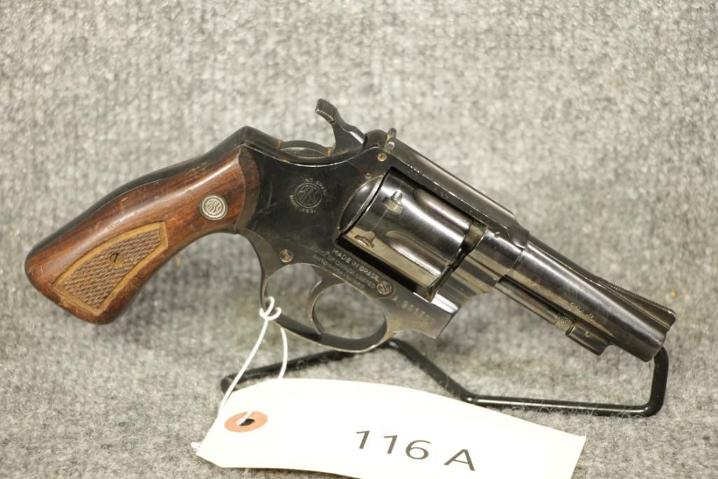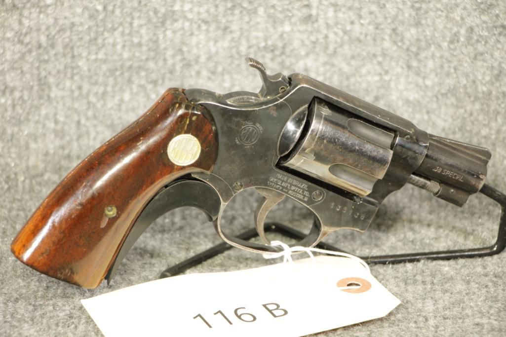 116 B Rossi 38Spl Snub. 2" barrel. Ser. # 136138. Good to very good. No rust. Some small handling marks on the grips and frame.