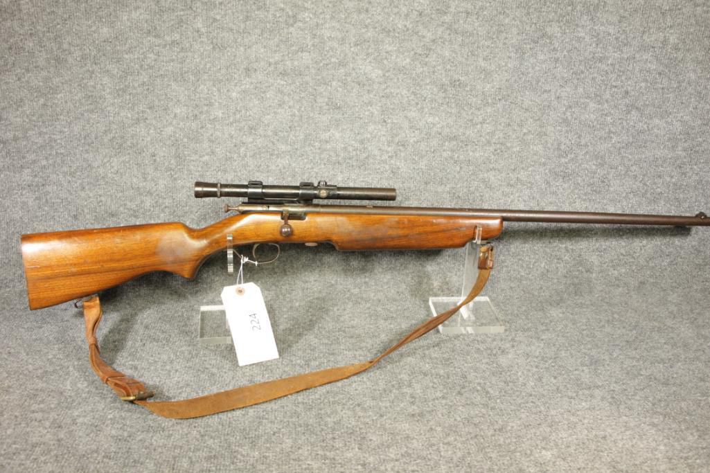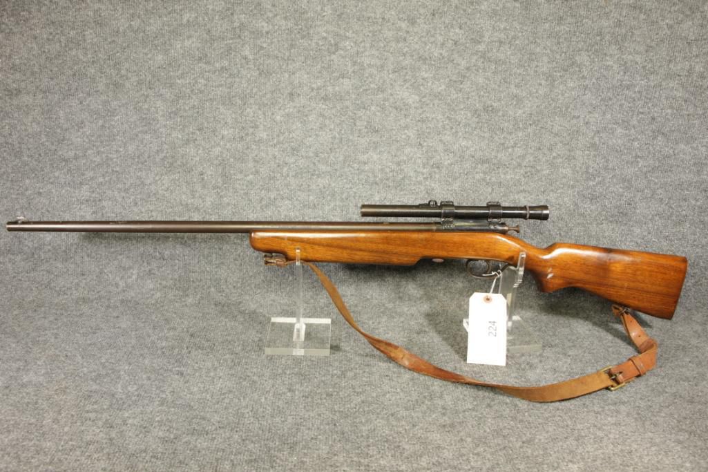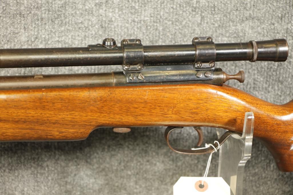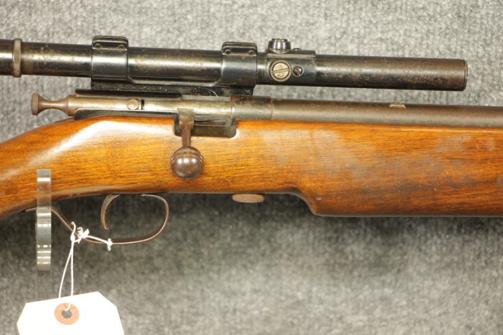 22 Lr. 26" barrel. Much pitting. 4x scope. Leather sling. Poor to good condition.