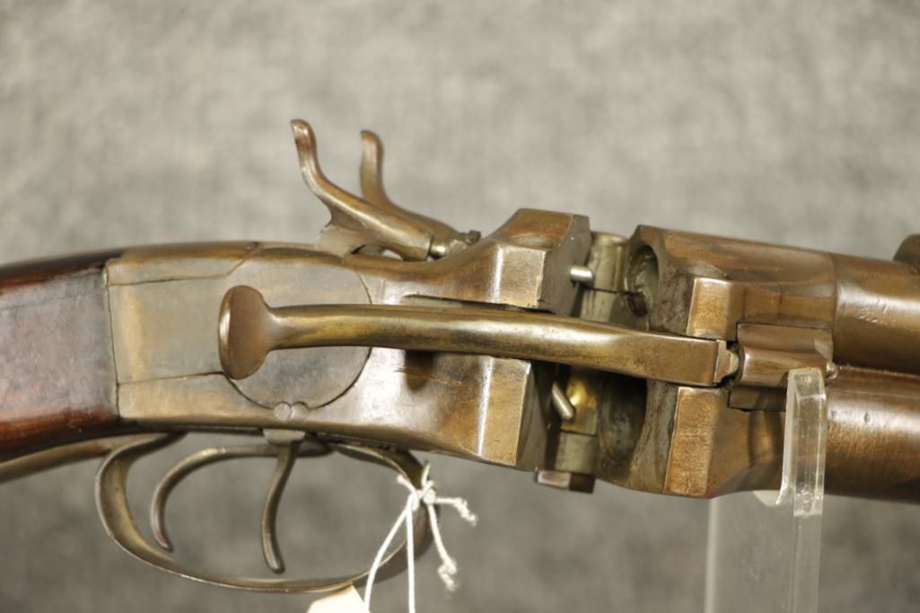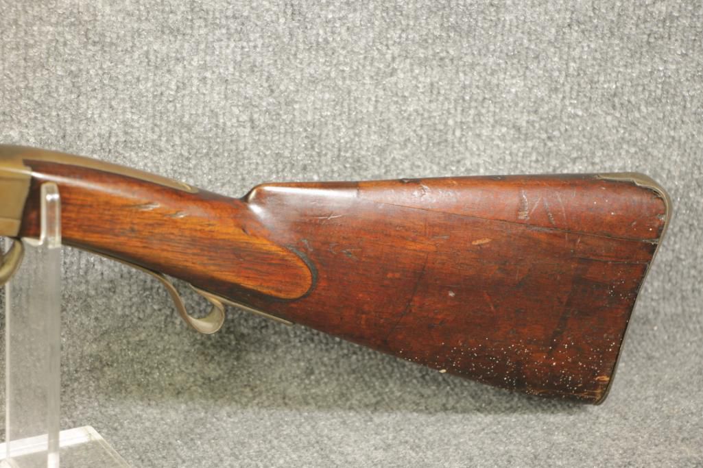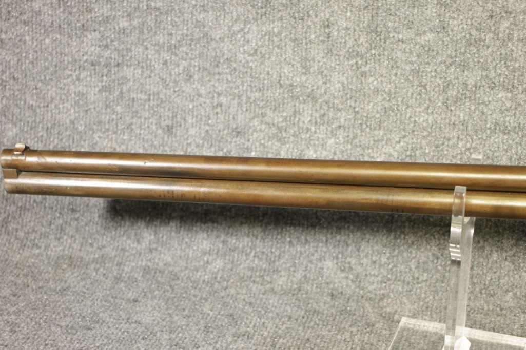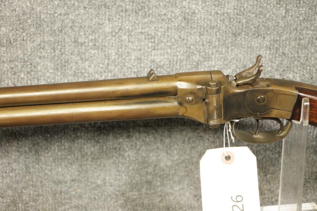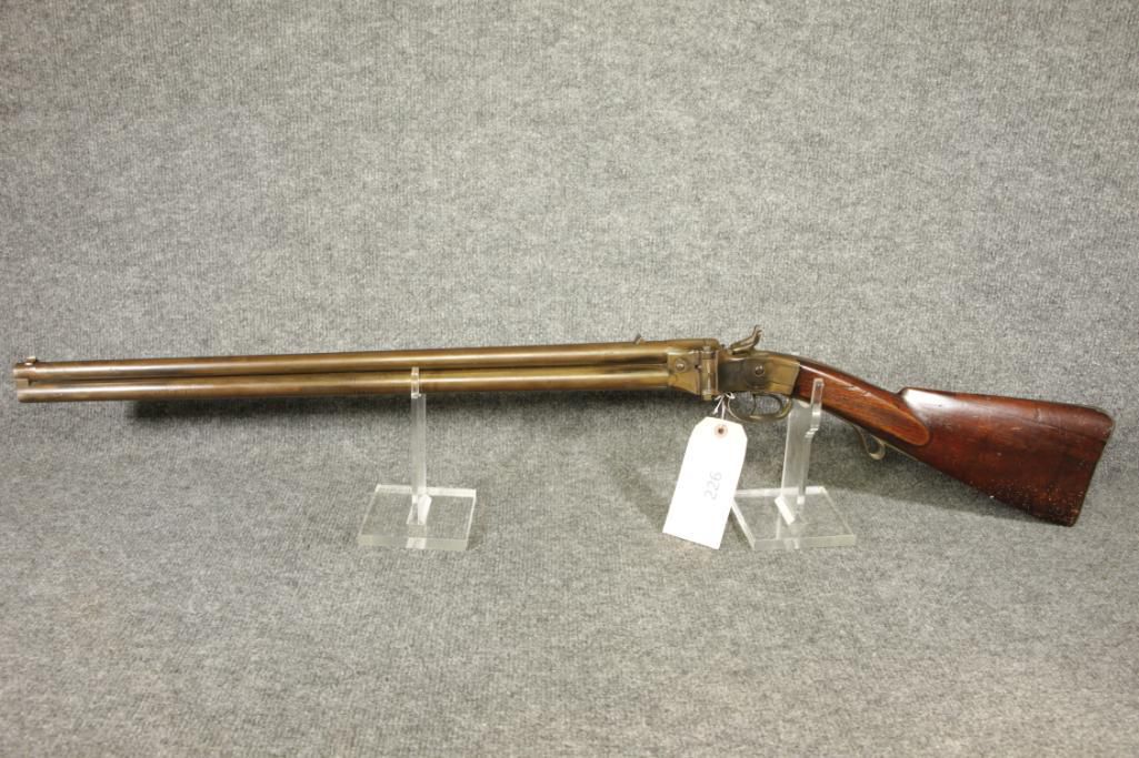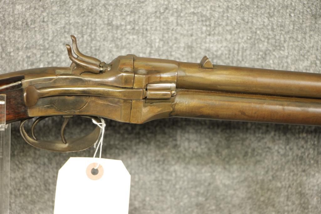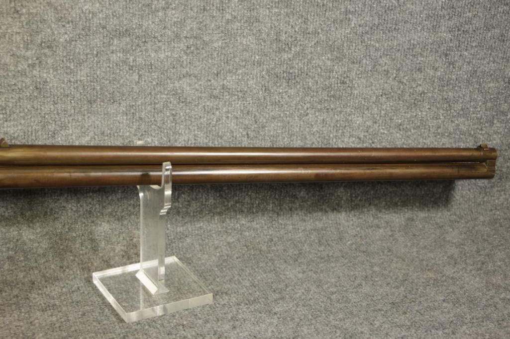 Double barrel rifle over shotgun. 45 cal. top. 75 cal. bottom. Both bores are pitted. Some rifling detected on the top bore. Locks are good and action is tight. No maker's mark. We found no stamps at all.