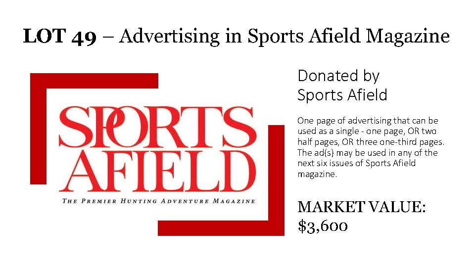 Donated by Sports Afield Magazine This one page of advertising can be used as single full page OR two half pages OR three one-third pages. The ad(s) may be used in any of the next six issues of Sports Afield magazine.