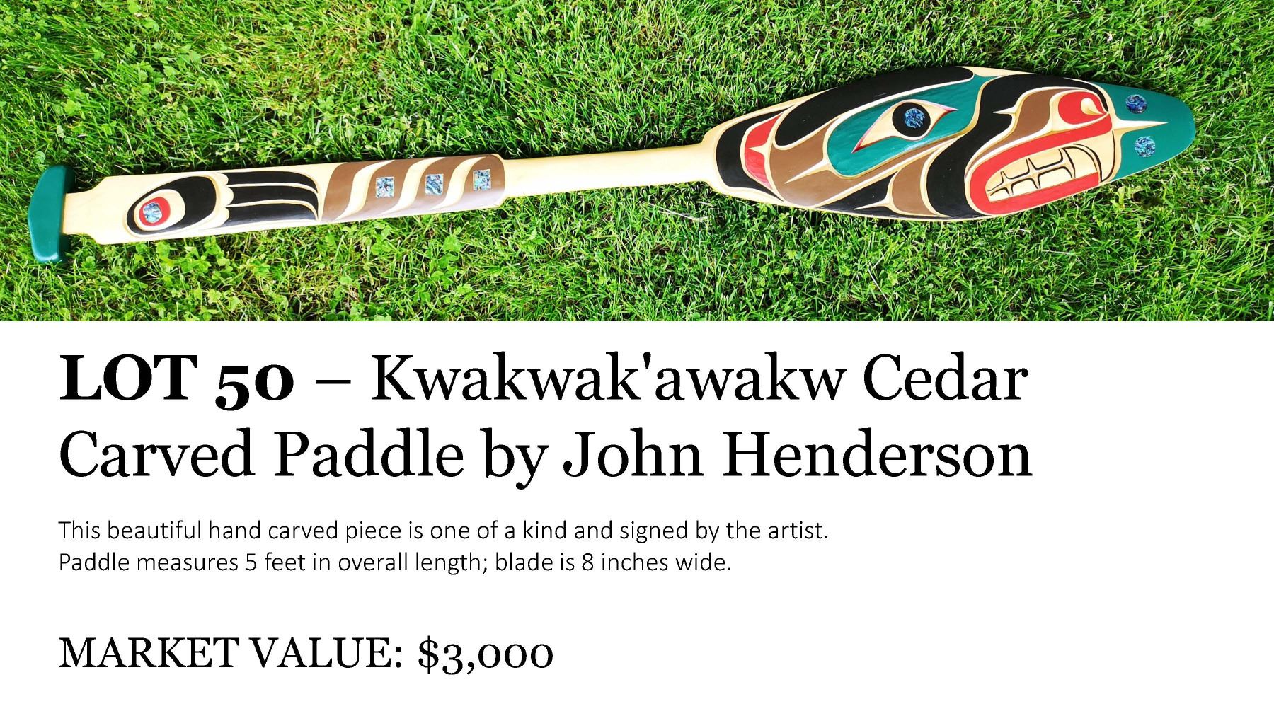 This 58” hand-carved paddle was created by hereditary Chief John Henderson. The beautiful paddle has inlayed abalone to accent the carving and painting.