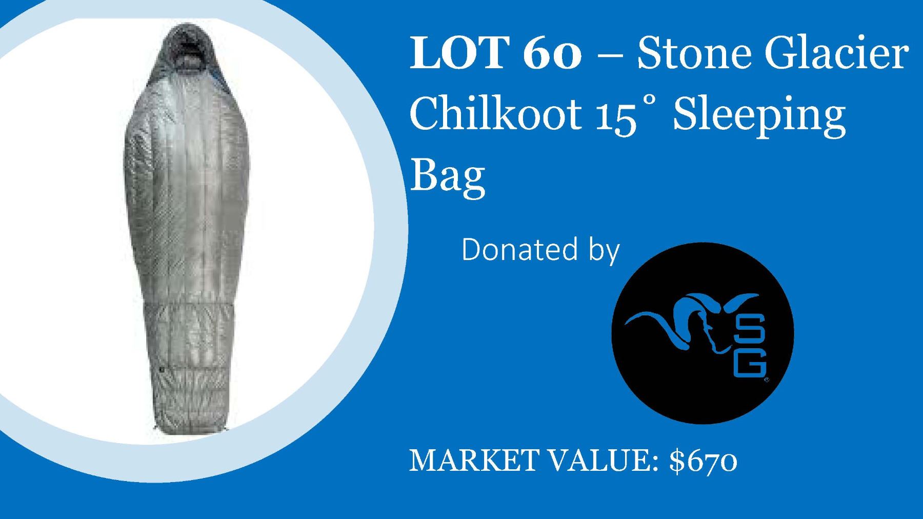 Donated by Stone Glacier The Chilkoot 15° bag utilizes industry-leading materials to achieve an overall weight and temperature rating that is best-in-class. A Pertex® Quantum shell adds water and wind resistance to protect the 850+ Fill power goose down HyperDRY™ insulation. The Chilkoot 15° is a high-performance ultralight sleeping bag designed specifically for the most discerning mountain hunter.