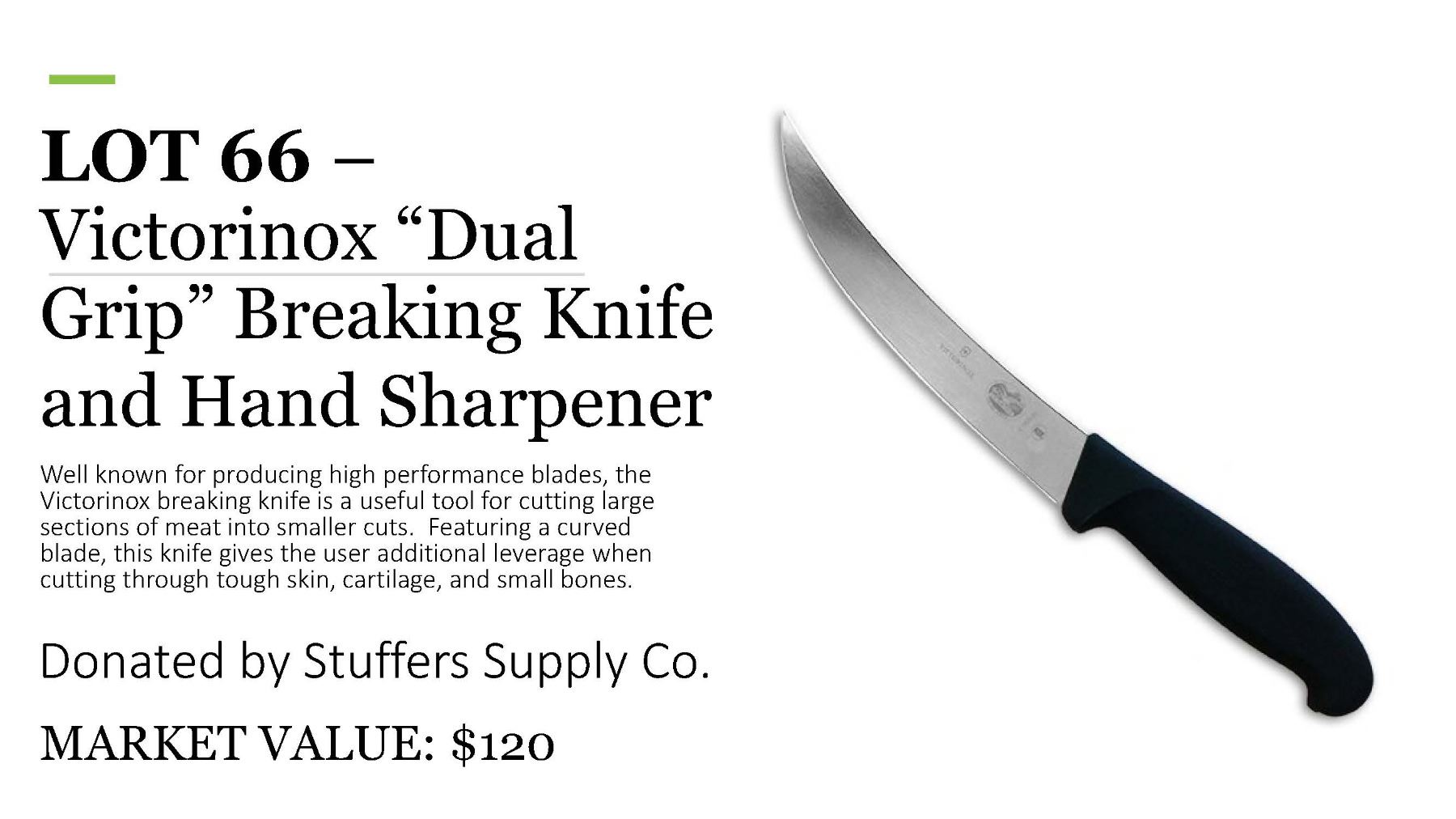 Donated by Stuffers Supply Co. Well known for producing high performance blades, the Victorinox breaking knife is a useful tool for cutting large sections of meat into smaller cuts. Featuring a curved blade, this knife gives the user additional leverage when cutting through tough skin, cartilage, and small bones.