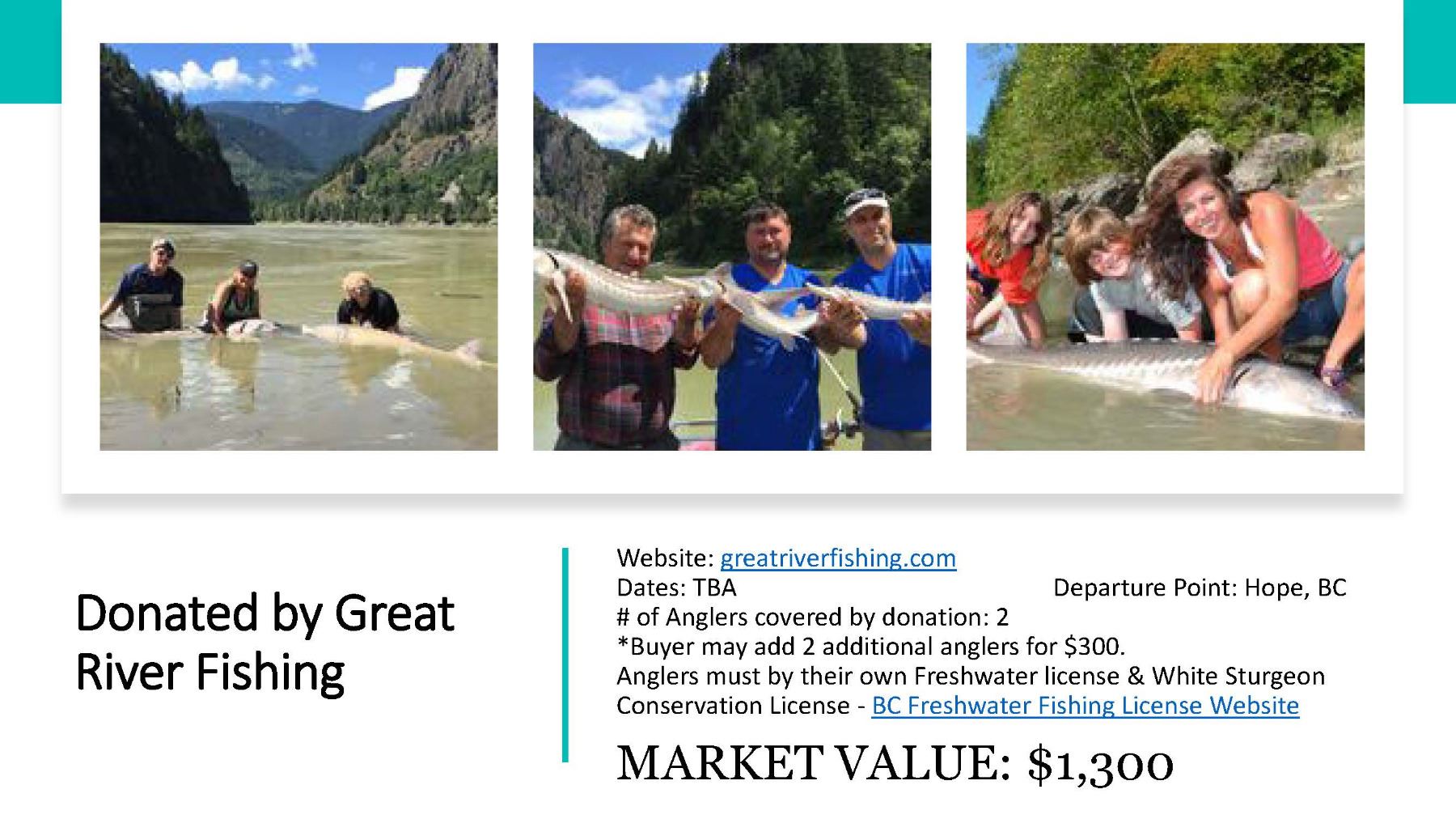 Anglers must by their own BC Freshwater Fishing license and White Sturgeon Conservation License - https://www2.gov.bc.ca/gov/content/sports-culture/recreation/fishing-hunting/fishing/recreational-freshwater-fishing-licence