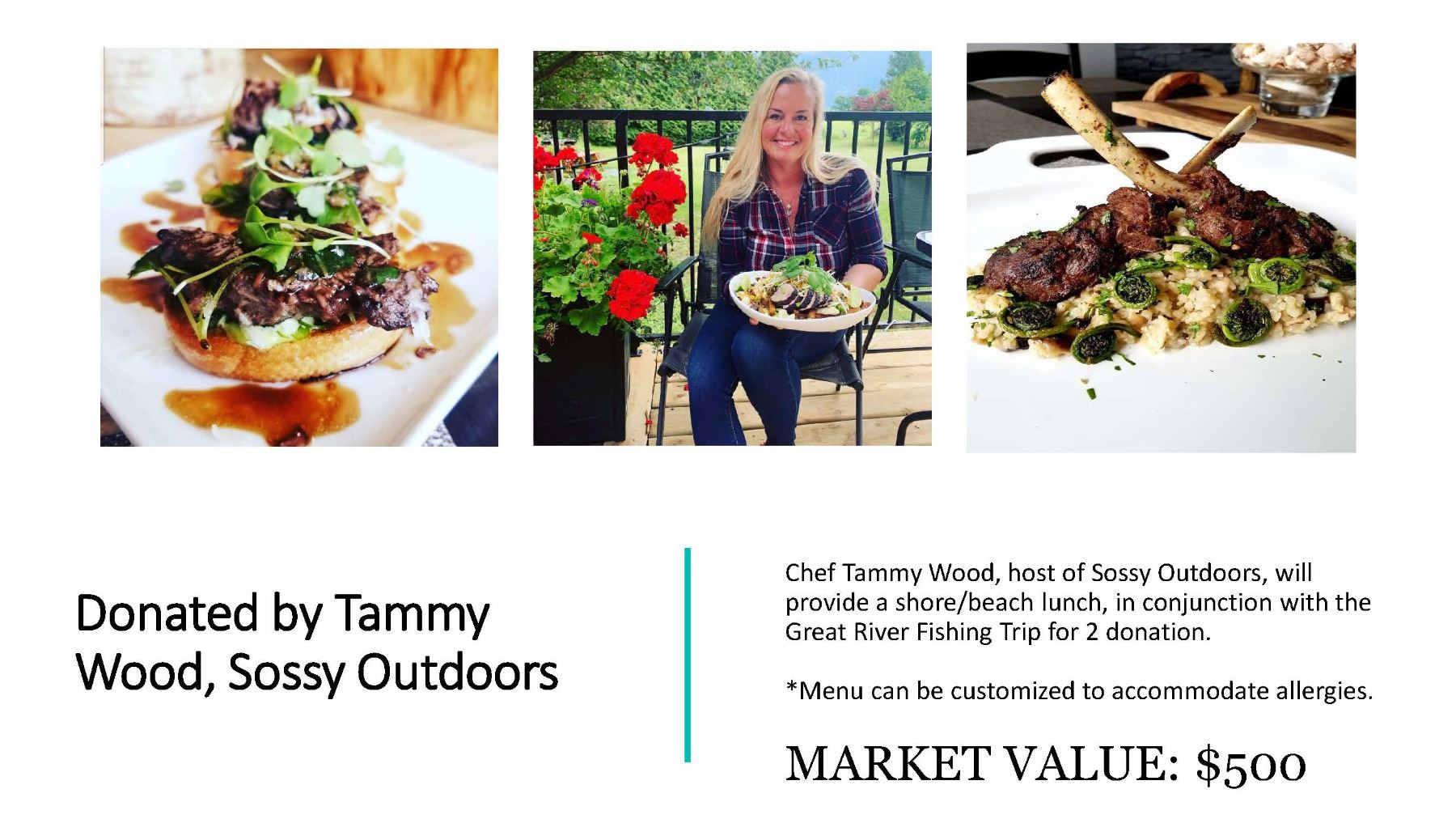 Chef Tammy Wood, host of Sossy Outdoors, will provide a shore/beach lunch, in conjunction with the Great River Fishing Trip for 2 donation.