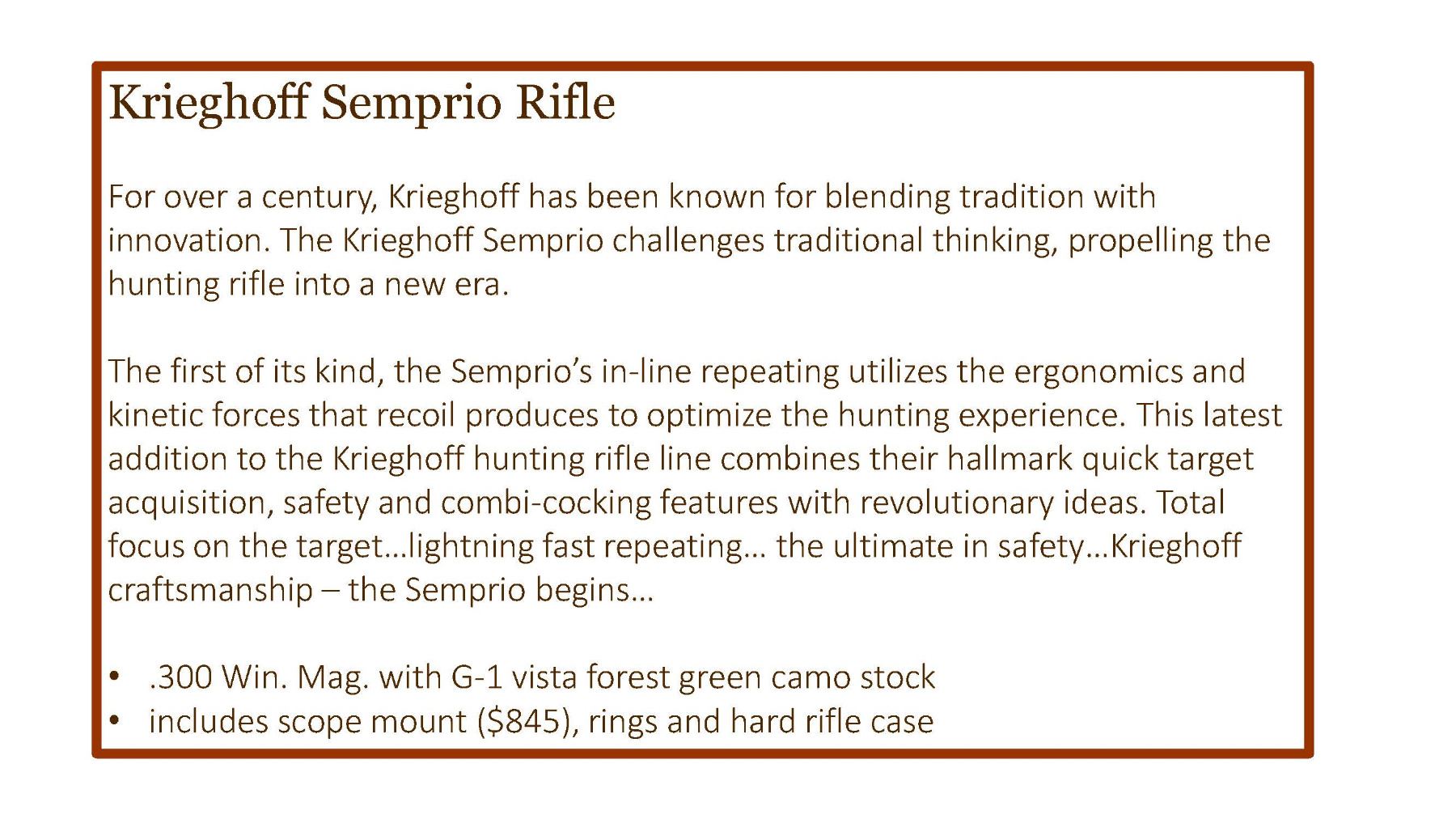 The first of its kind, the Semprio’s in-line repeating utilizes the ergonomics and kinetic forces that recoil produces to optimize the hunting experience. This latest addition to the Krieghoff hunting rifle line combines their hallmark quick target acquisition, safety and combi-cocking features with revolutionary ideas. Total focus on the target…lightning fast repeating… the ultimate in safety…Krieghoff craftsmanship – the Semprio begins…