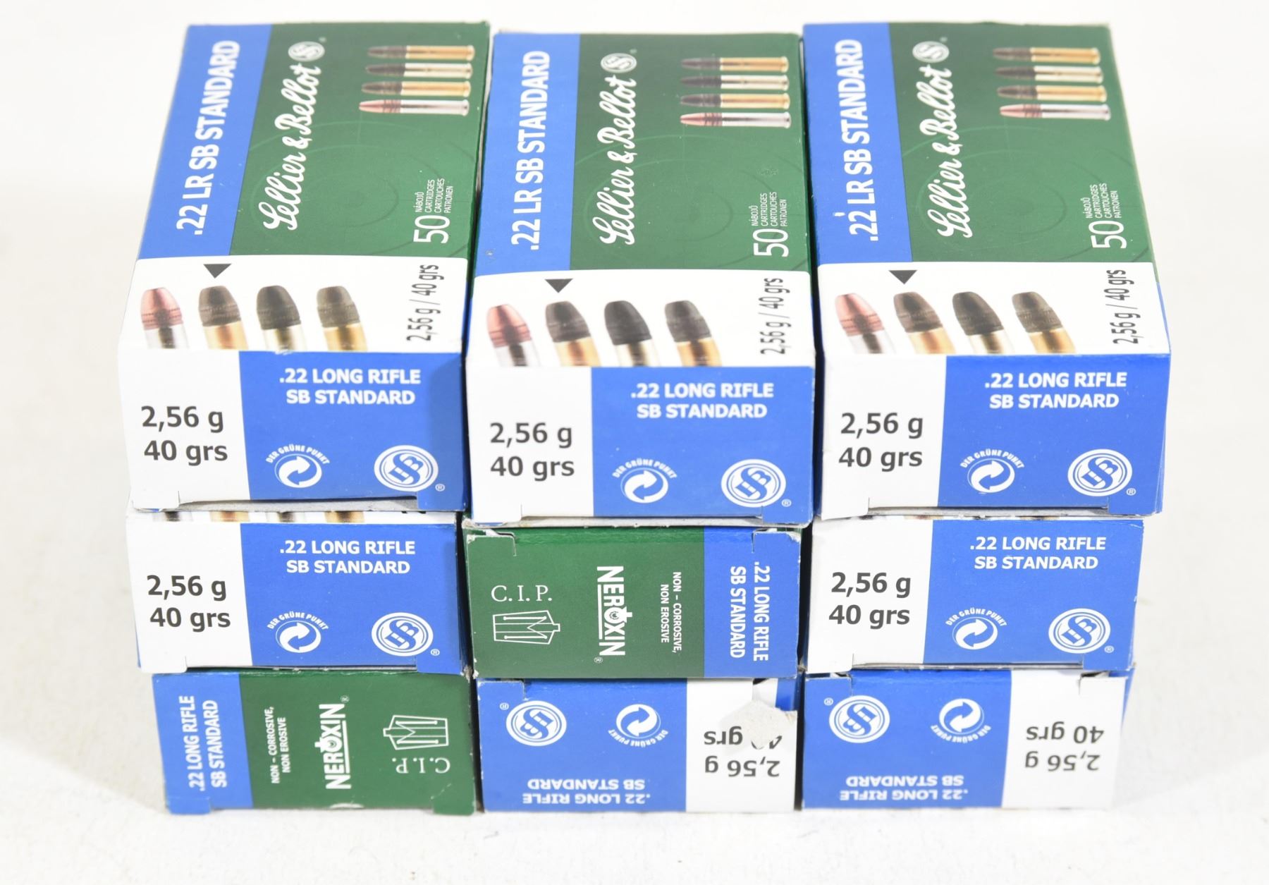 Eight 50-round boxes of S&B 22LR 40gr SB Standard ammunition. 9-round box of S&B 22LR 40gr SB Standard ammunition.
